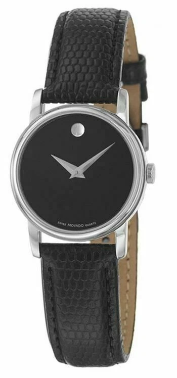 The Movado Women’s Museum Black Dial Leather Band Watch (Model: 2100004) is a stunning example of minimalist elegance. Featuring a stainless steel case and a black leather strap, this watch is designed to be both sophisticated and versatile. The fixed stainless steel bezel adds to its sleek look, while the black dial provides a striking contrast to the silver-tone hands. The signature Movado dot at the 12 o'clock position highlights the brand’s iconic design, and the dial remains clean and uncluttered, with no traditional hour markers, making it both modern and timeless.