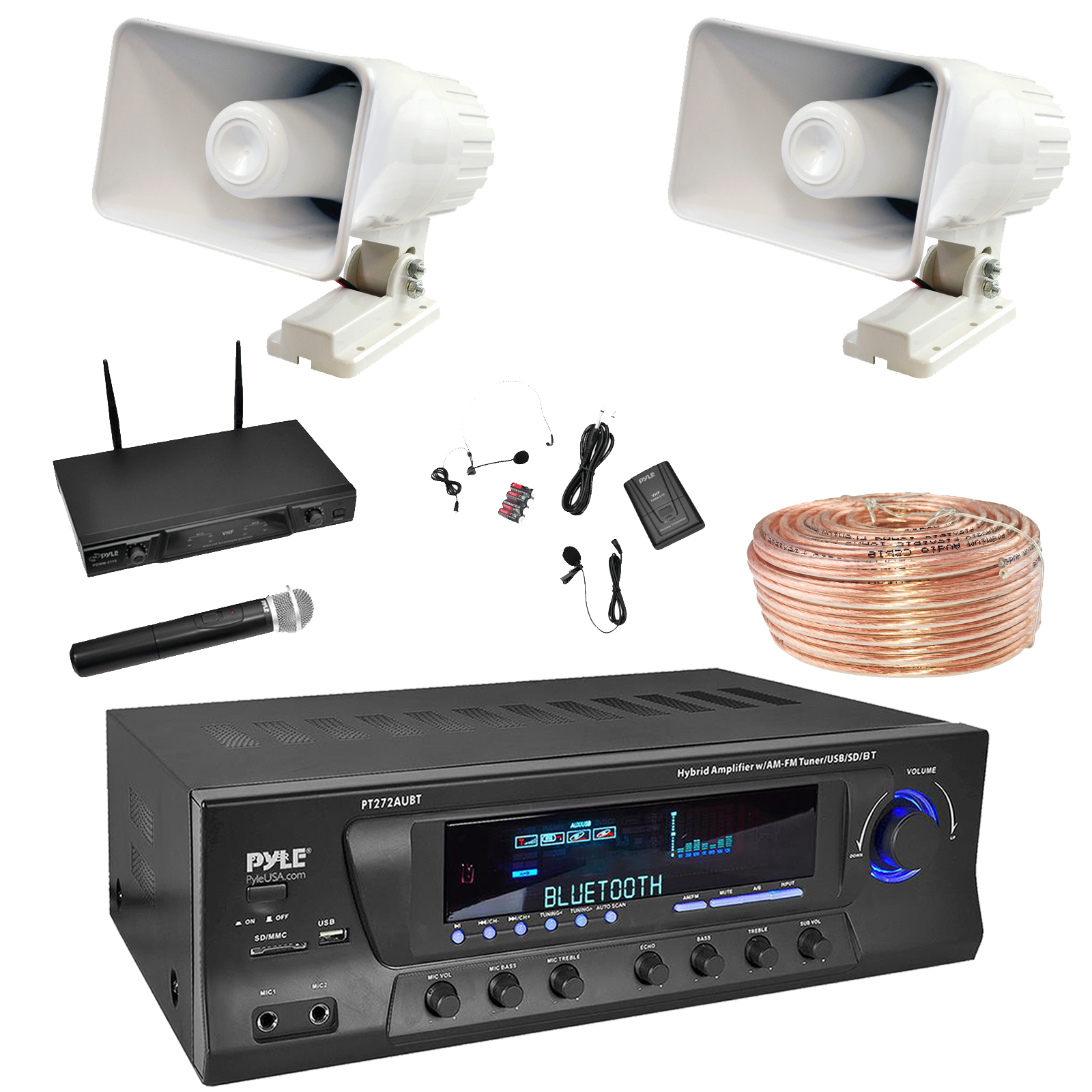 PACKAGE BUNDLE INCLUDES: Pyle PT272AUBT High-Power 300 Watt Max Power Bluetooth Home Theater Amplifier Receiver with AM/FM Radio, MP3 & USB Playback, 2x Pyle PHSP4 6'' 50 Watt Max Power Indoor/Outdoor PA Horn Speakers, 50 Feet 18 Gauge Speaker Wire, Wireless Microphone System with Belt Pack Transmitter, Handheld, Lavaliere and Headset Mics
