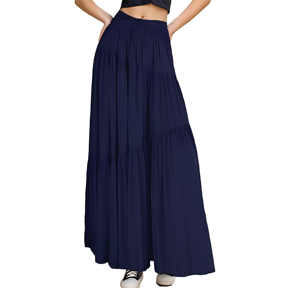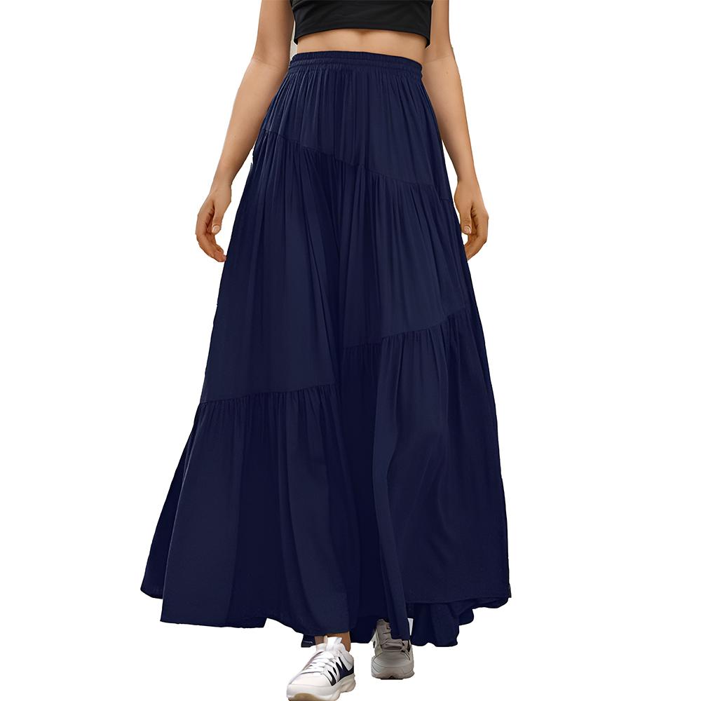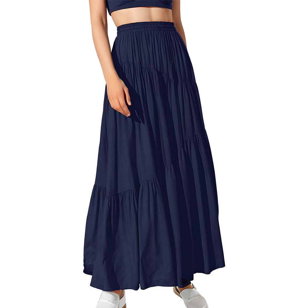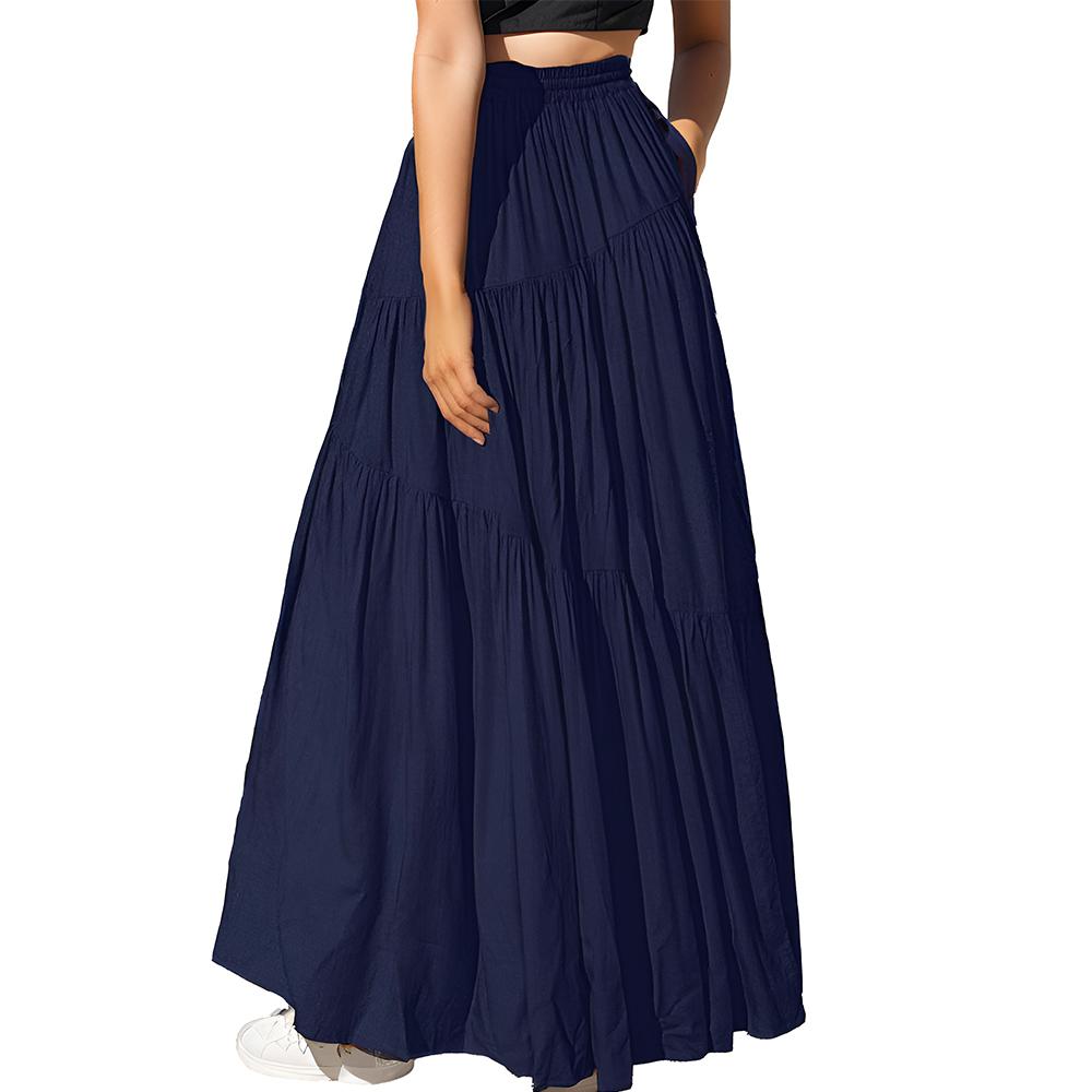 Women's Boho Elastic High Waist Pleated A-Line Long Skirt with Pockets