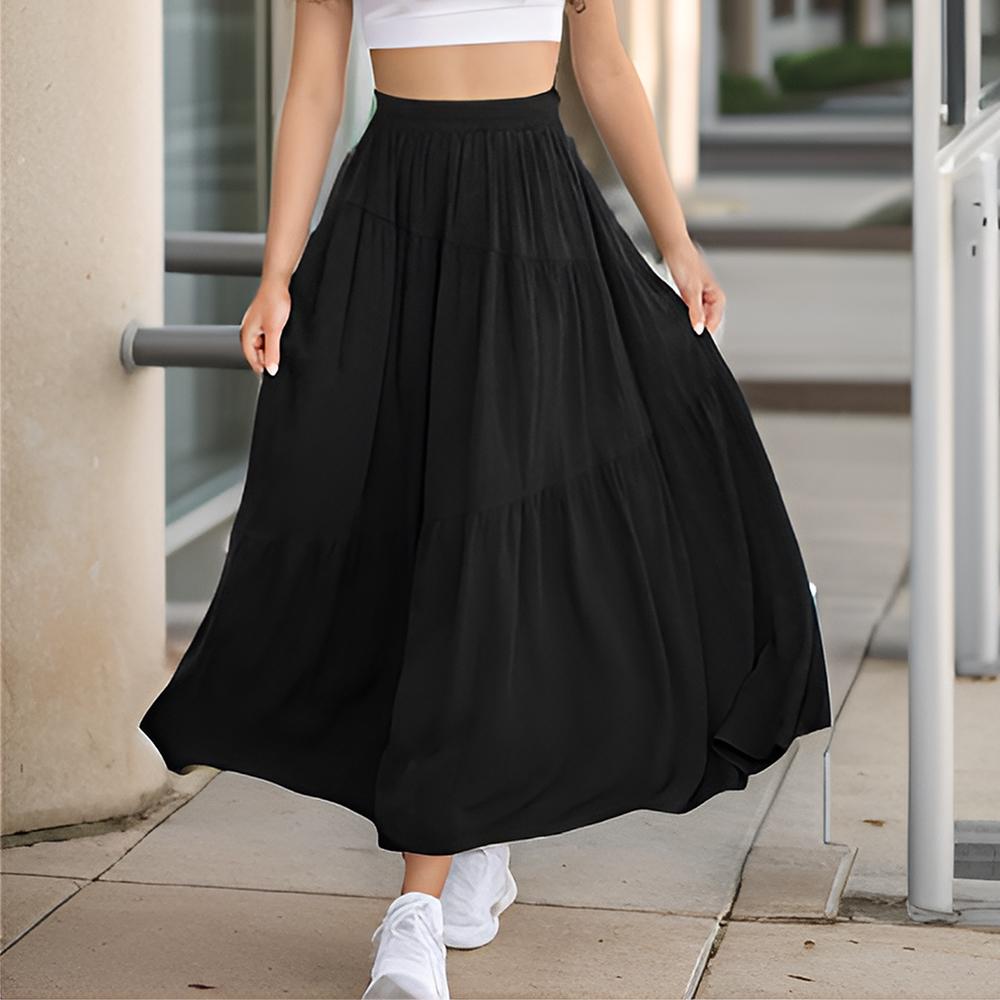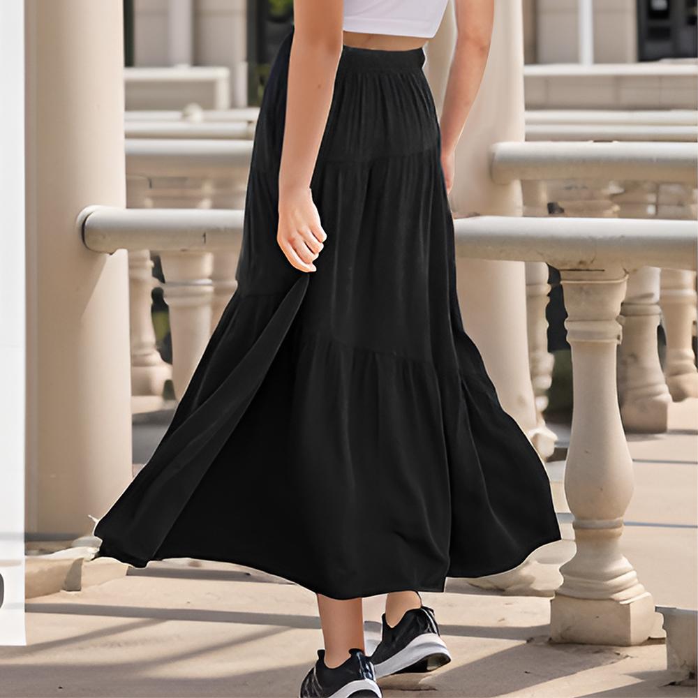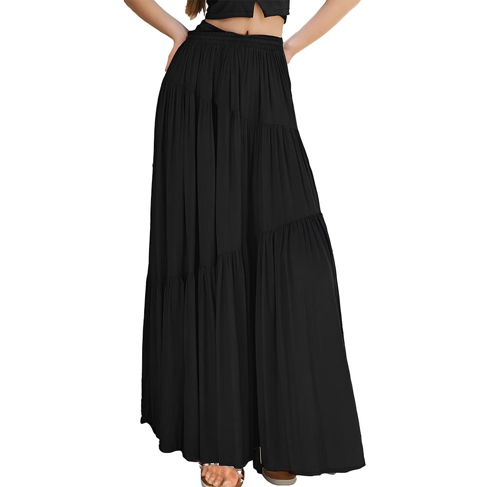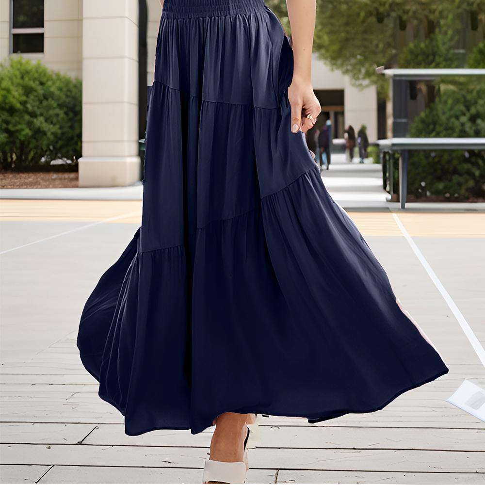 Women's Boho Elastic High Waist Pleated A-Line Long Skirt with Pockets