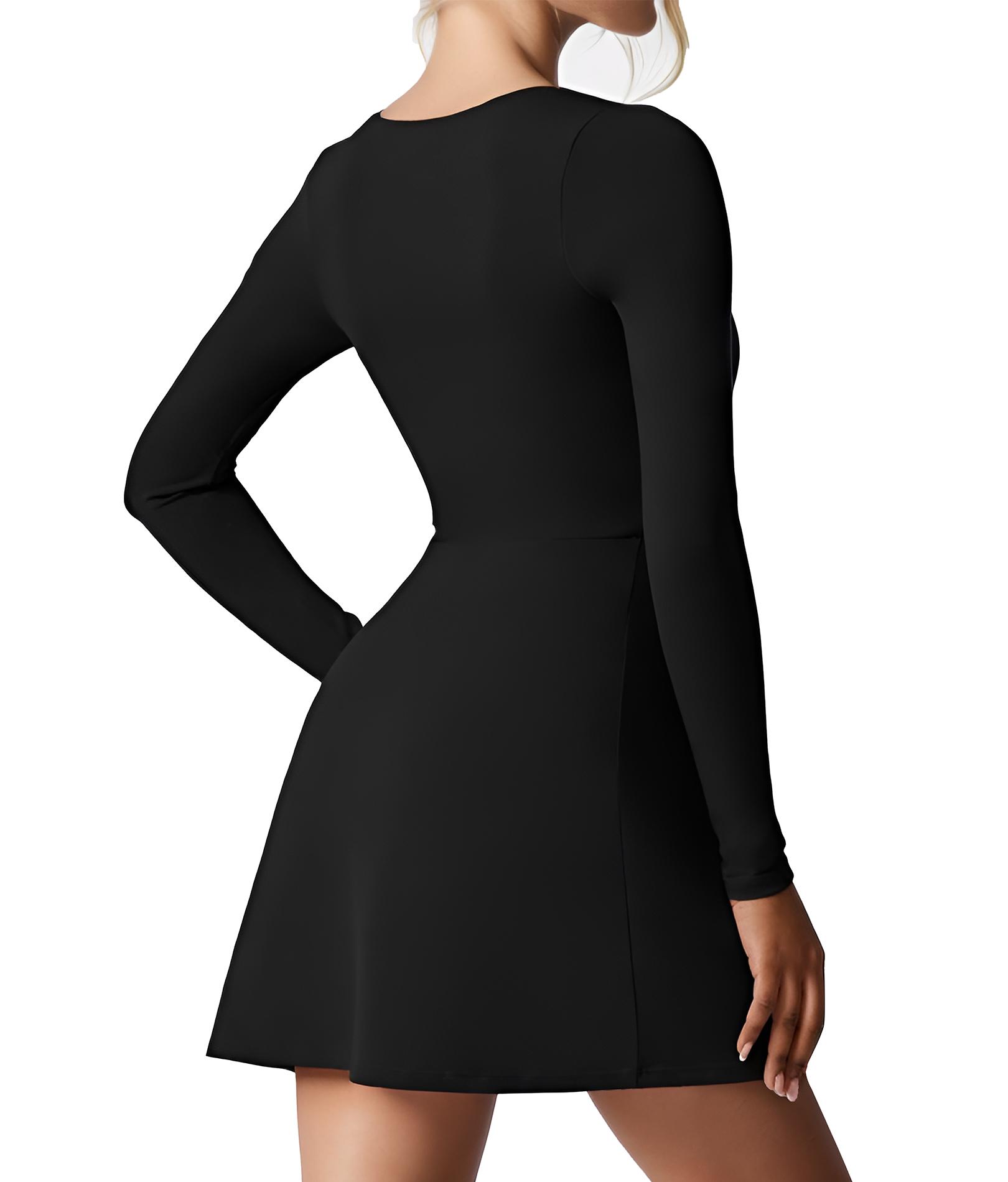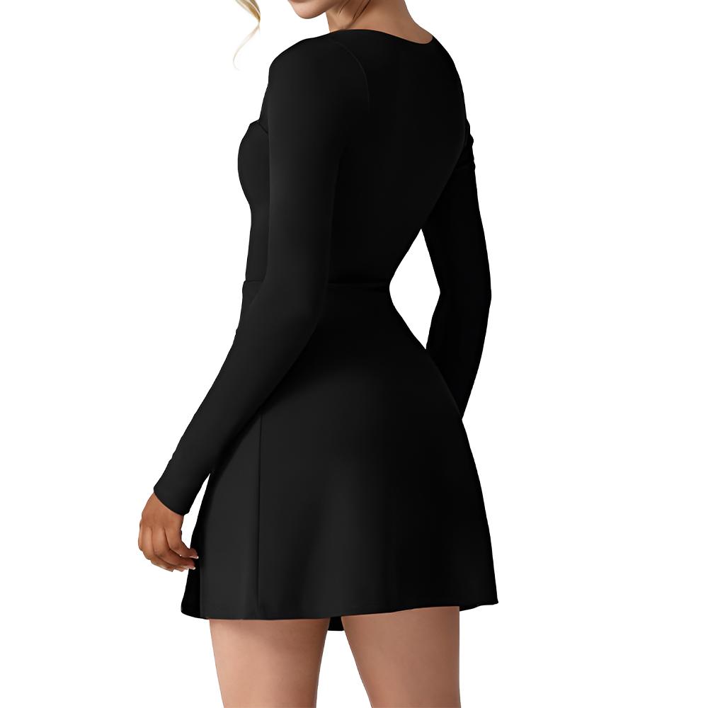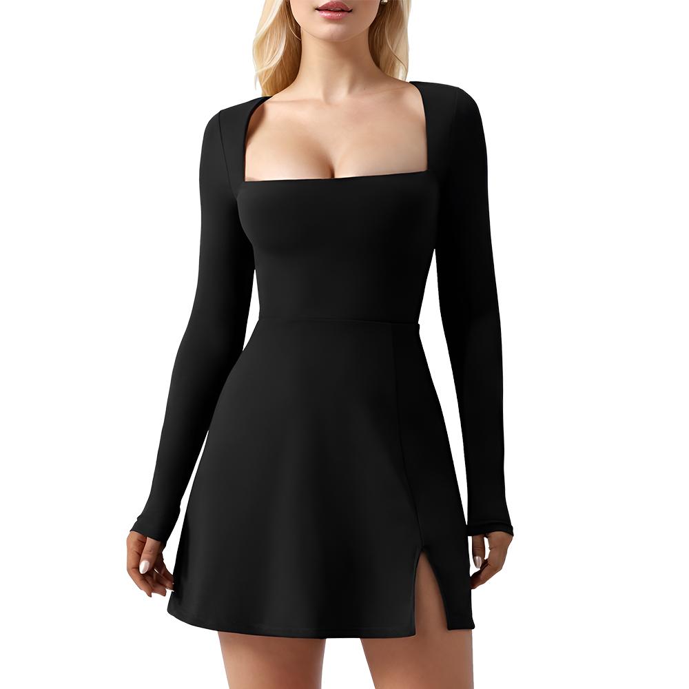 Womens Square Neck Slim Fit Dress Long Sleeve Side Slit Flare Mini Dresses