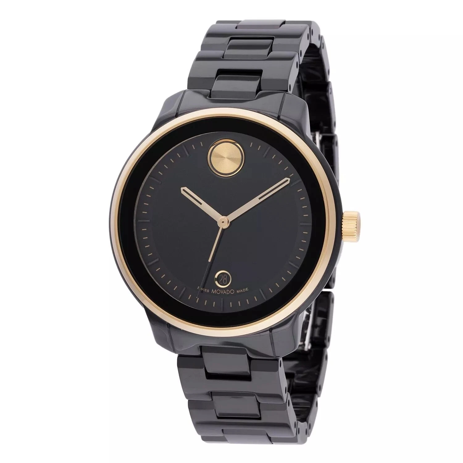 The Movado Bold Verso Women's Black Dial Ceramic Watch (Model 3600936) is a bold statement of modern elegance and luxury. Featuring a sleek black ceramic case and bracelet, this timepiece combines contemporary design with timeless sophistication. The gold-tone stainless steel bezel beautifully contrasts with the black ceramic, adding a touch of refinement. The black dial is paired with striking gold-tone hands and index hour markers, while the iconic Movado dot sits at the 12 o'clock position, offering a unique and distinctive touch. Minute markers around the outer rim enhance the watch’s precision, making it as functional as it is stylish.