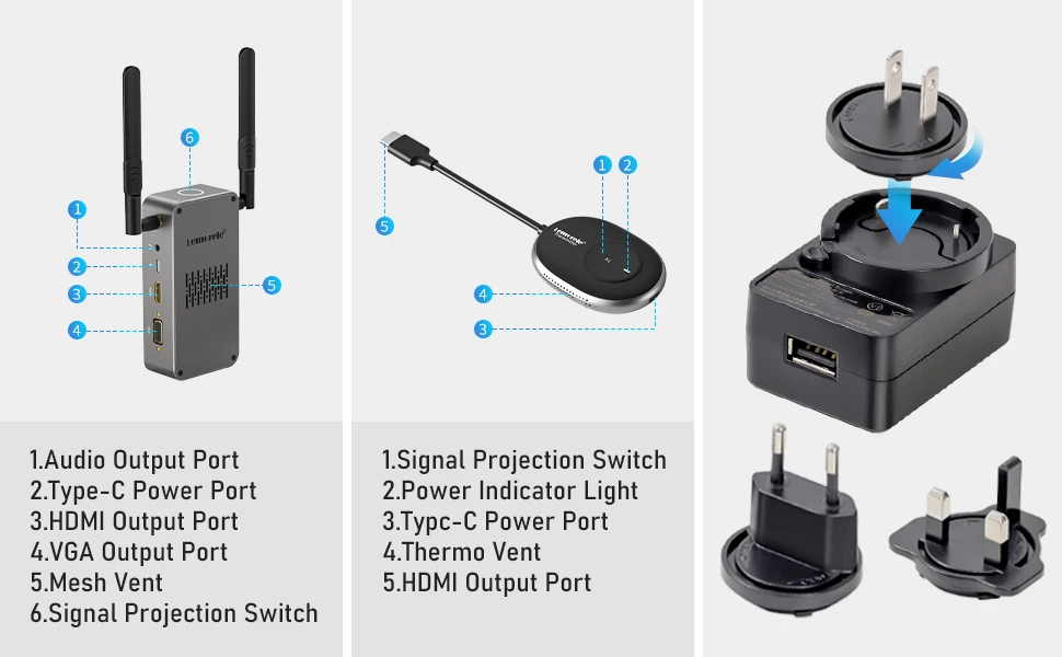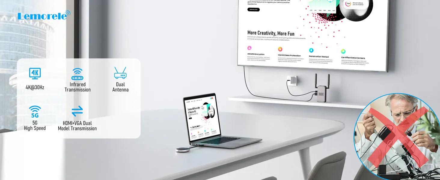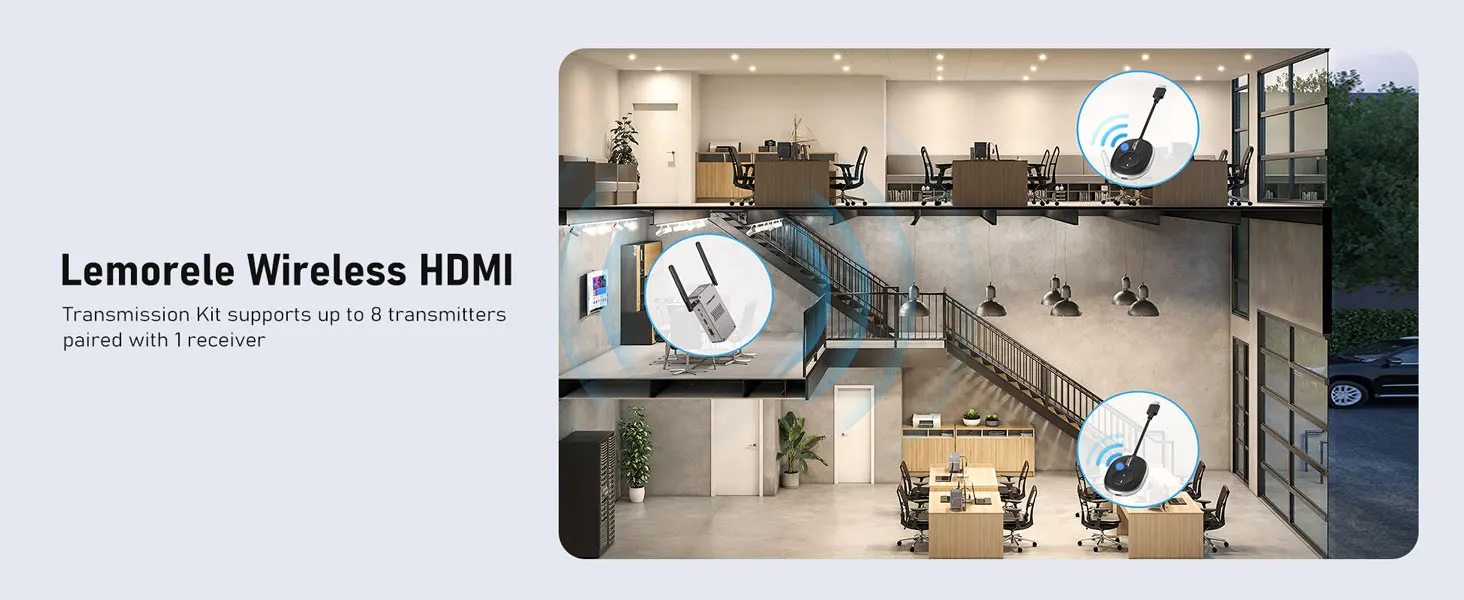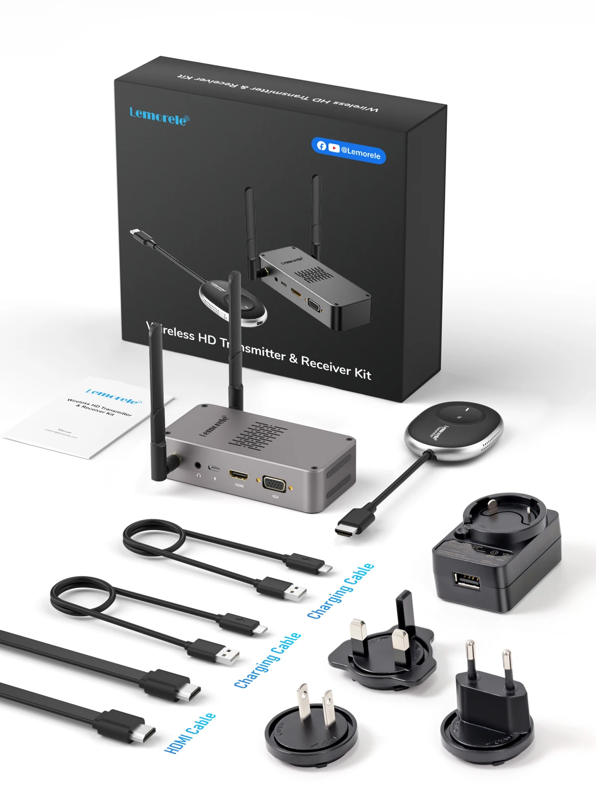Lemorele wireless kit with 1080P resolution, 5G high-speed transmission, HDMI, and VGA dual port truly delivers real-time streaming of HD data, with which you are able to share what you like from your laptop, phone, pad, and any HDMI device to your TV/Projector/Monitor. It is a wonderful choice for conference rooms, home theaters, multimedia education, VLOG filming, real-time monitoring, live streaming, etc.