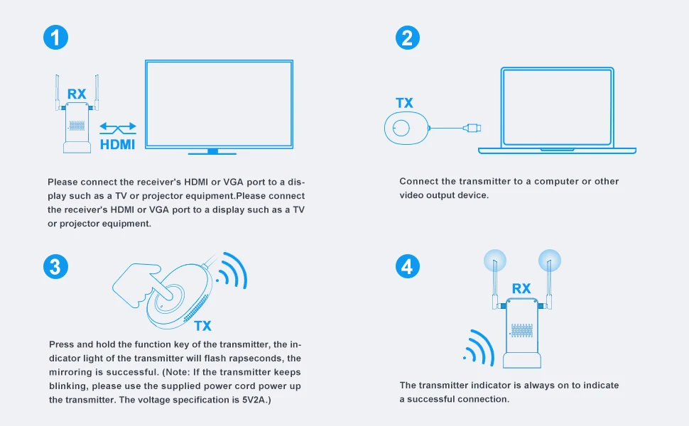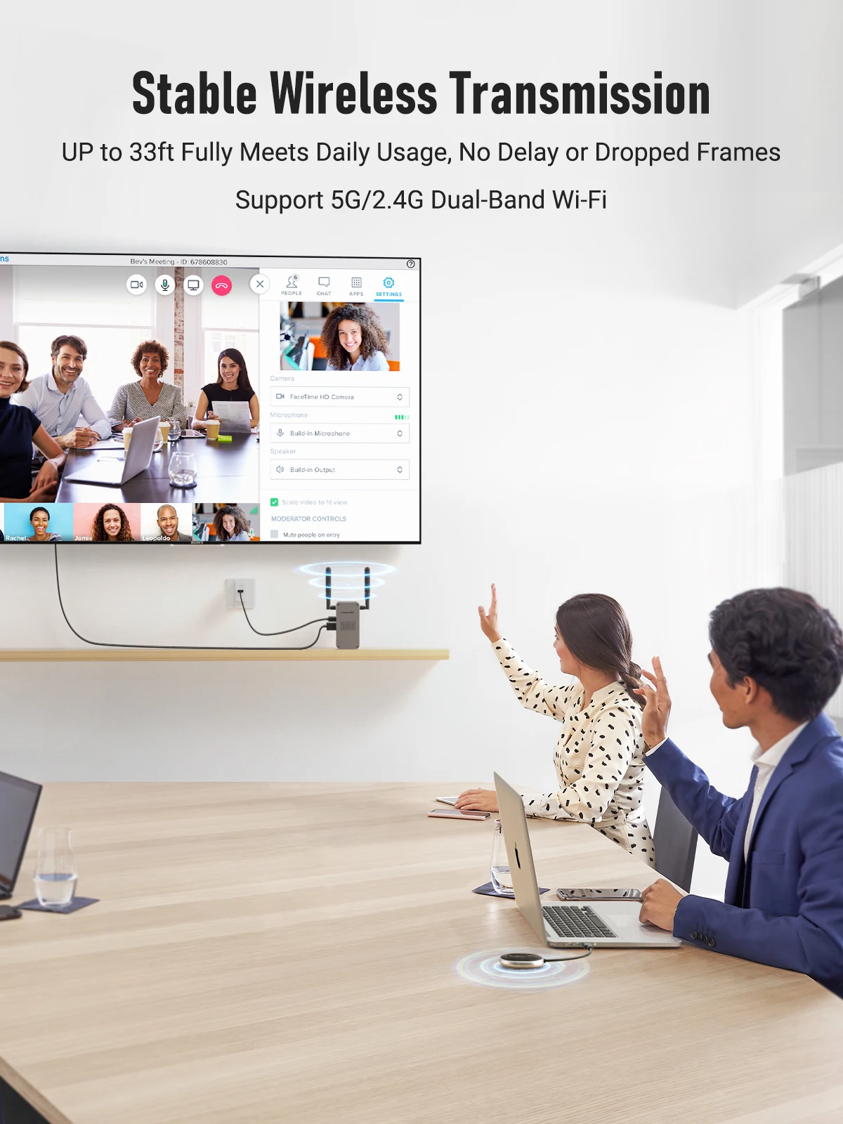 Easy to install, no drive or APP needed, without messy wires. Get up and running in 20 seconds with a true plug-and-play experience. Wireless HDMI transmitter and receiver Built-in 2.4GHz/5GHz WiFi transmission technology with high sensitivity antenna, which can make transmission efficiency faster and more stable.