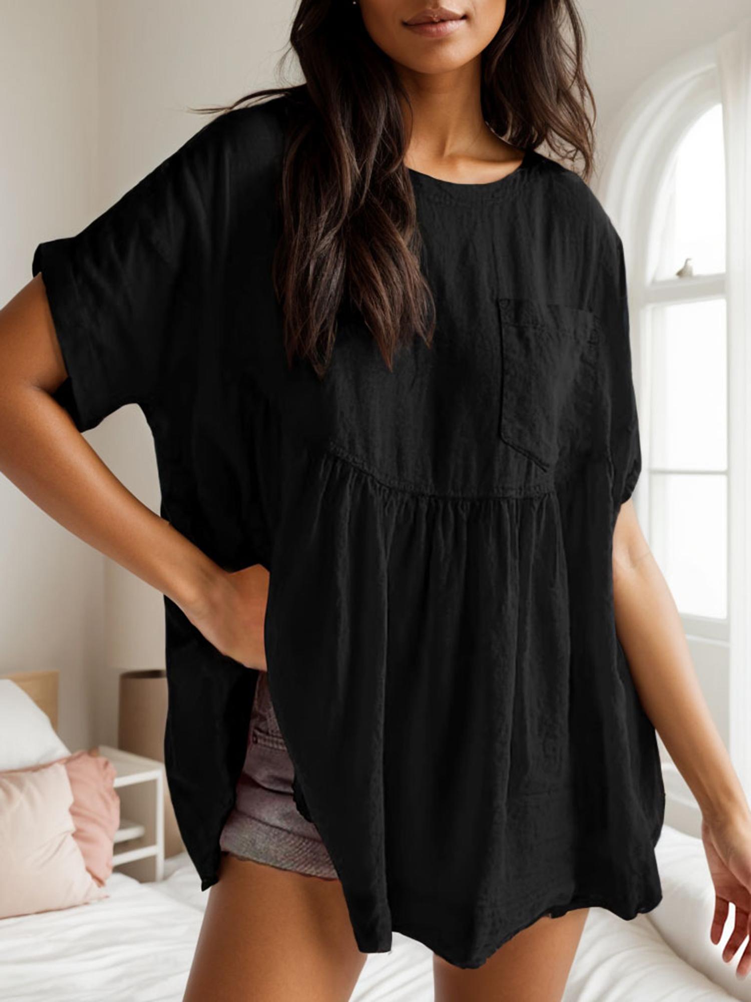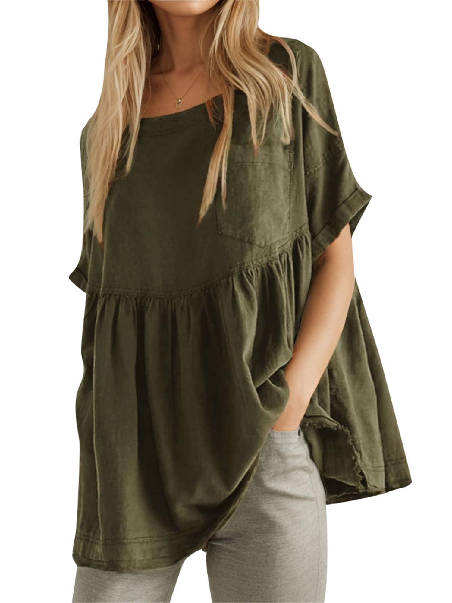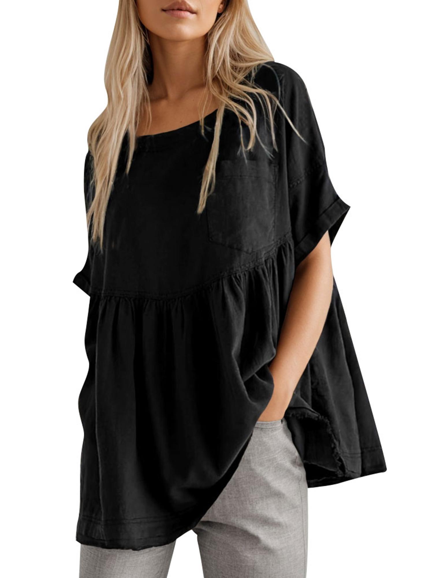 Loose fit, oversized, babydoll-inspired silhouette, short sleeves, crew neck, chest pocket, keyhole closure at the back, pleated details, solid color, summer peplum top, loose mini dress.
