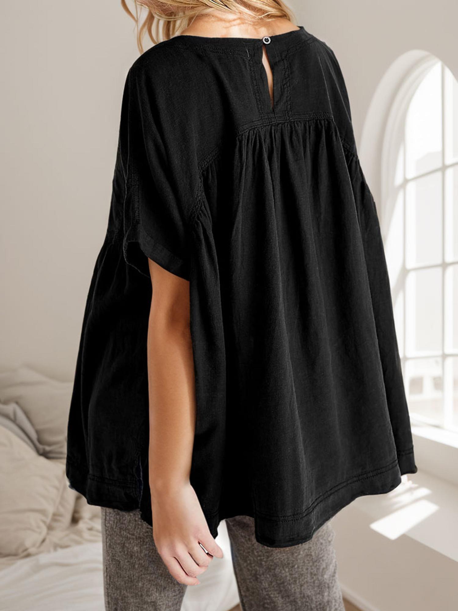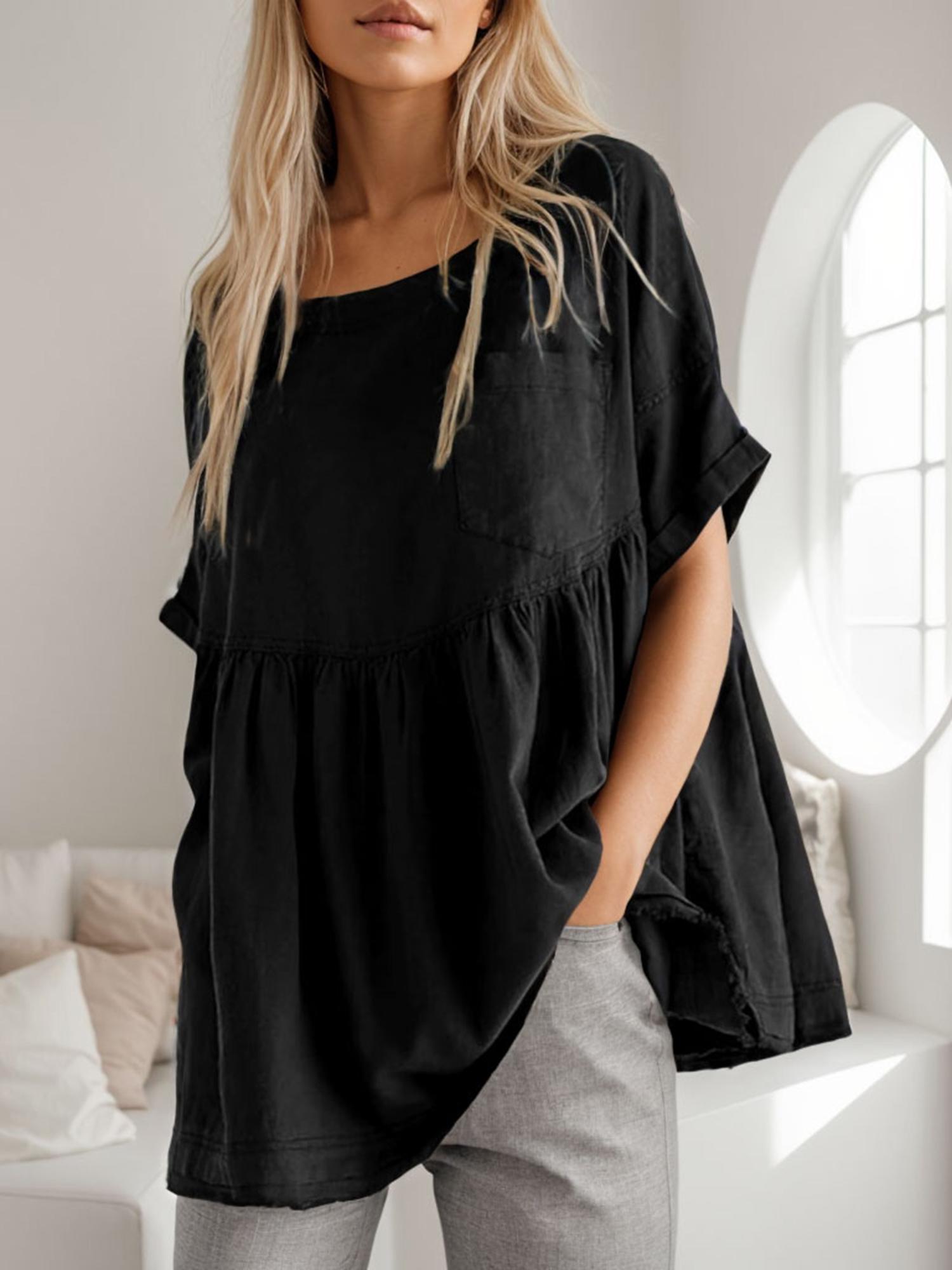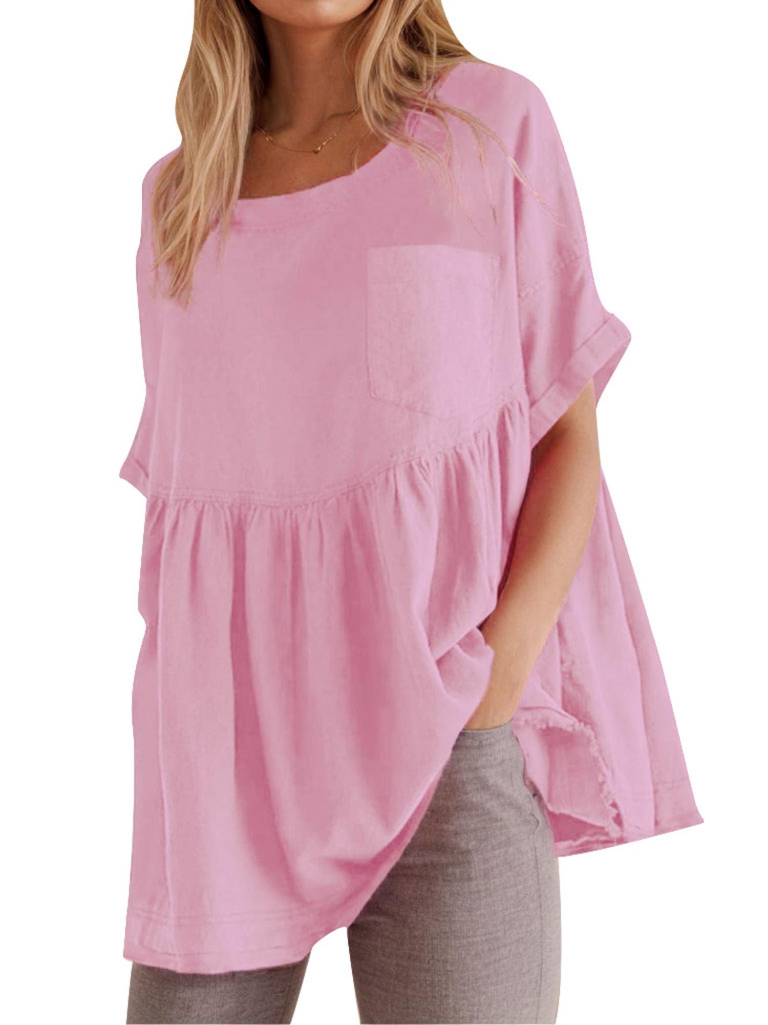 Loose fit, oversized, babydoll-inspired silhouette, short sleeves, crew neck, chest pocket, keyhole closure at the back, pleated details, solid color, summer peplum top, loose mini dress.