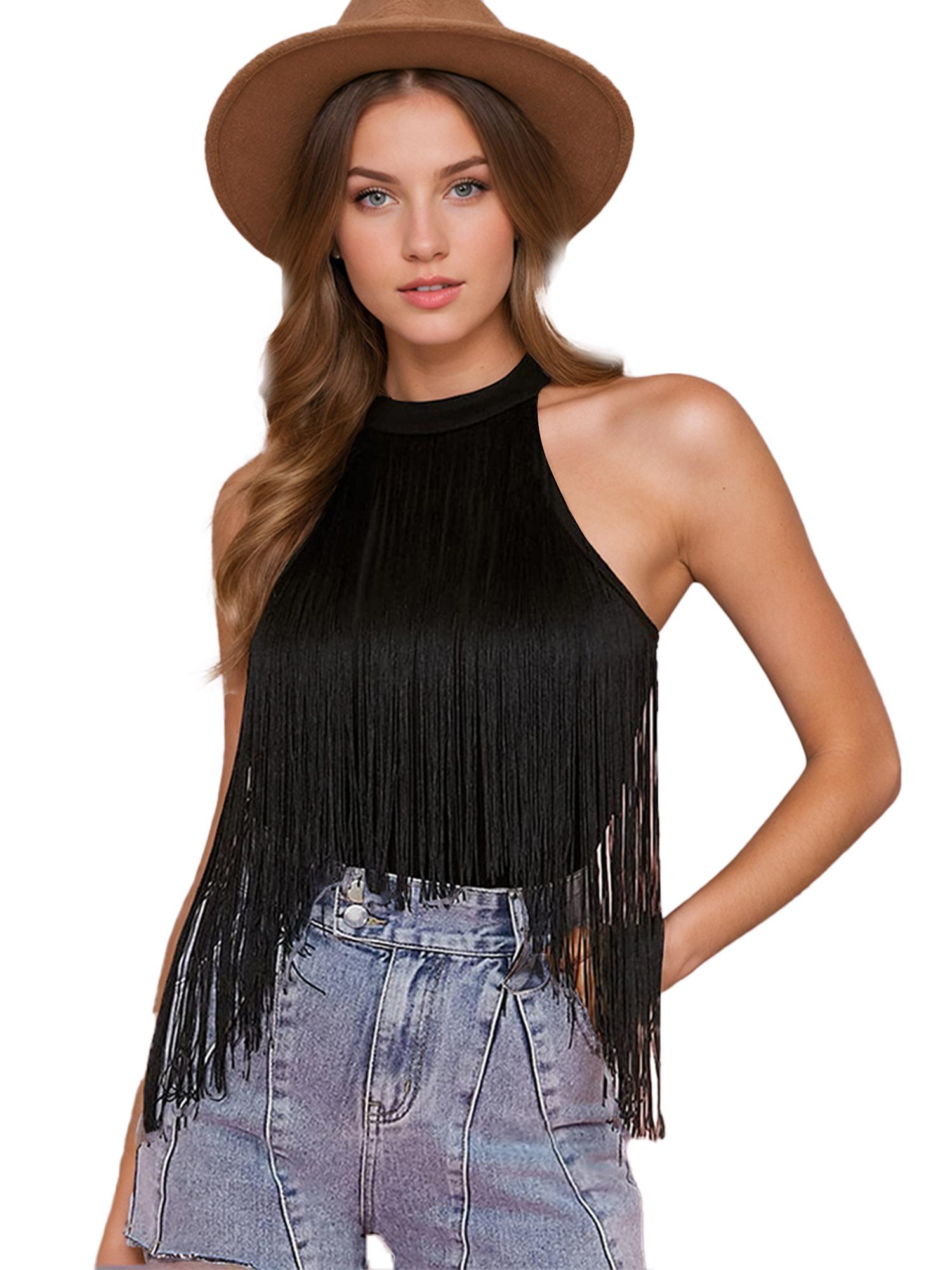 Women's Fringe Sleeveless Bodycon Halter Bodysuit Top