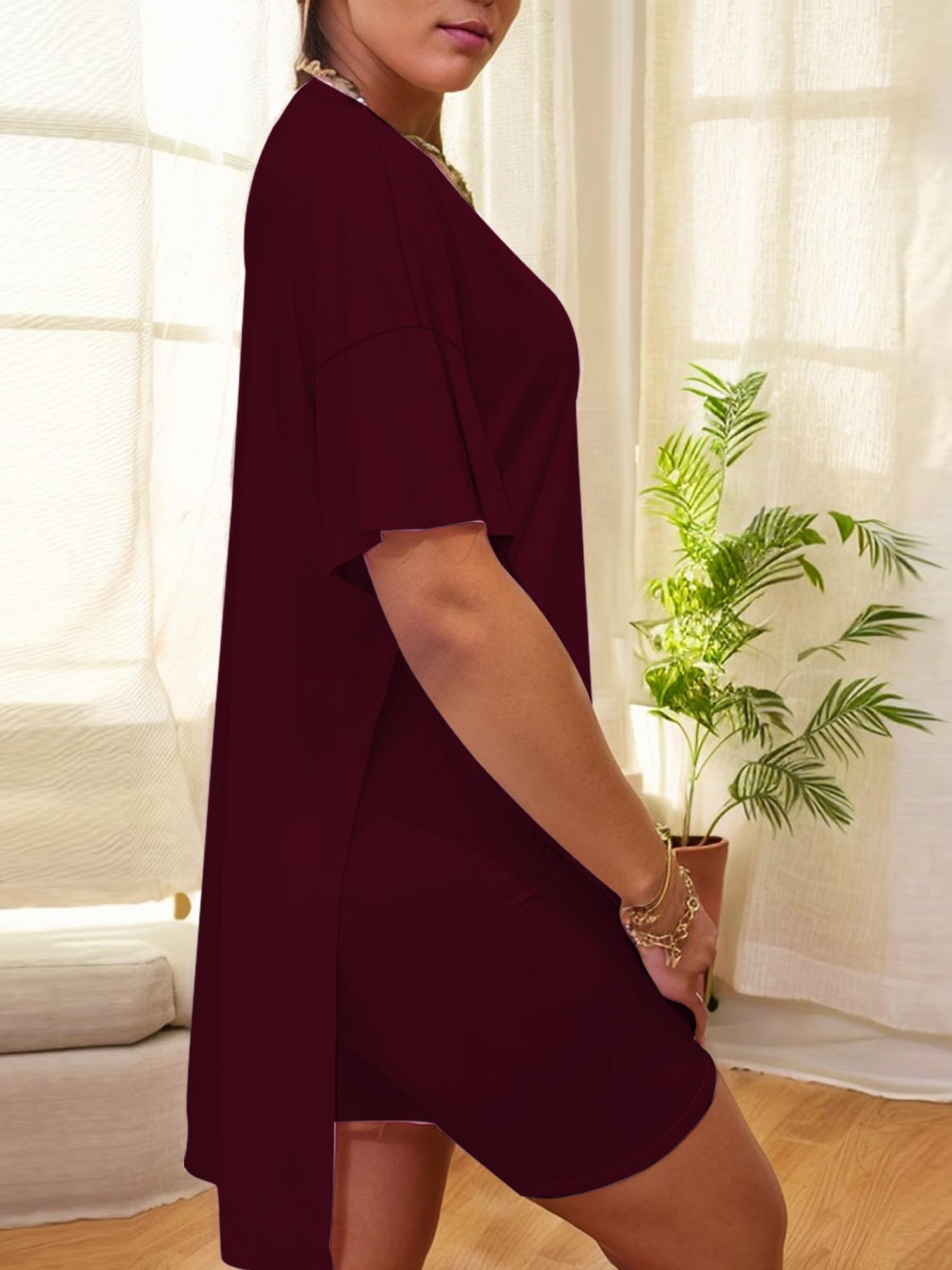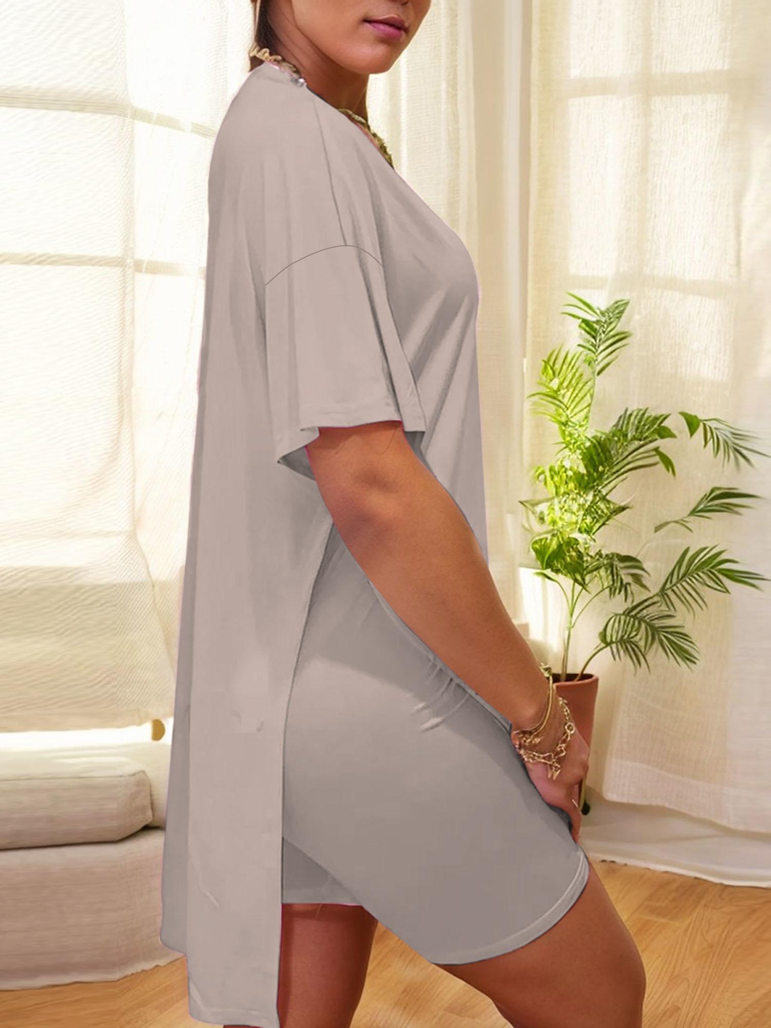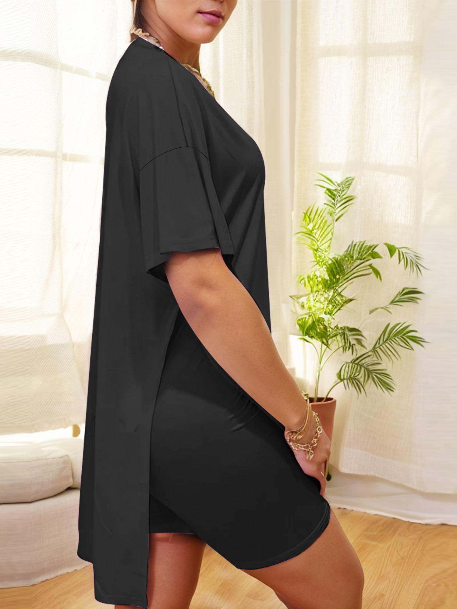 Casual V-neck short sleeve T-shirt, solid color sweatsuit, high waist bike shorts, 2-piece jogging set.