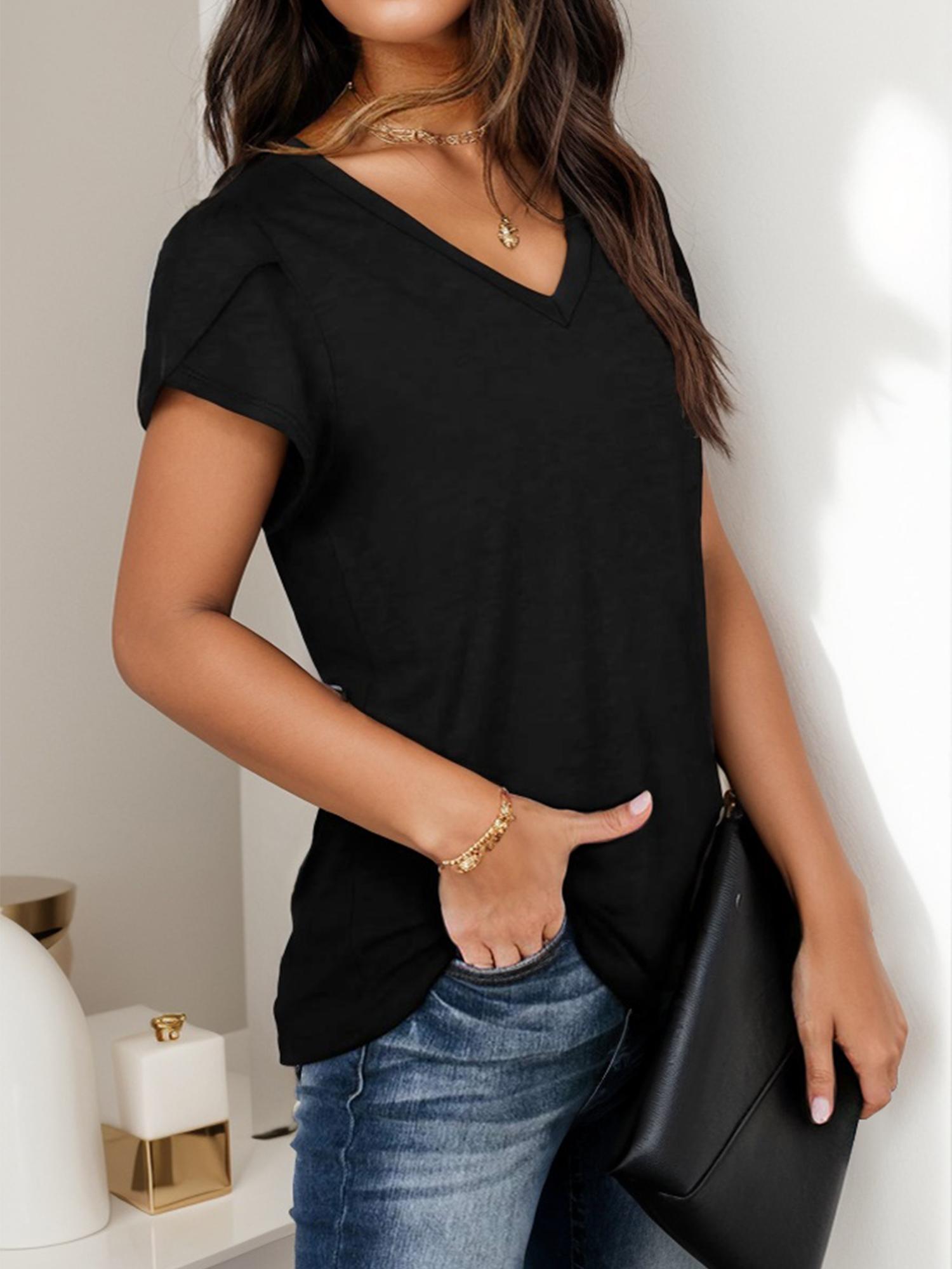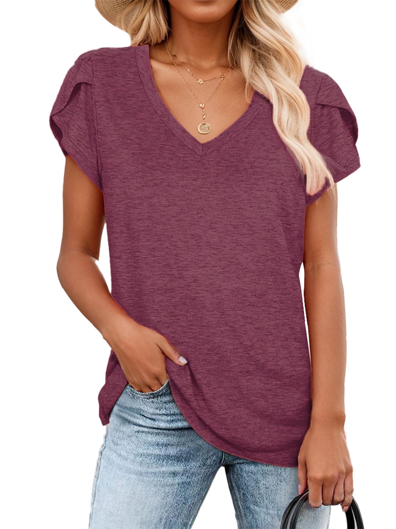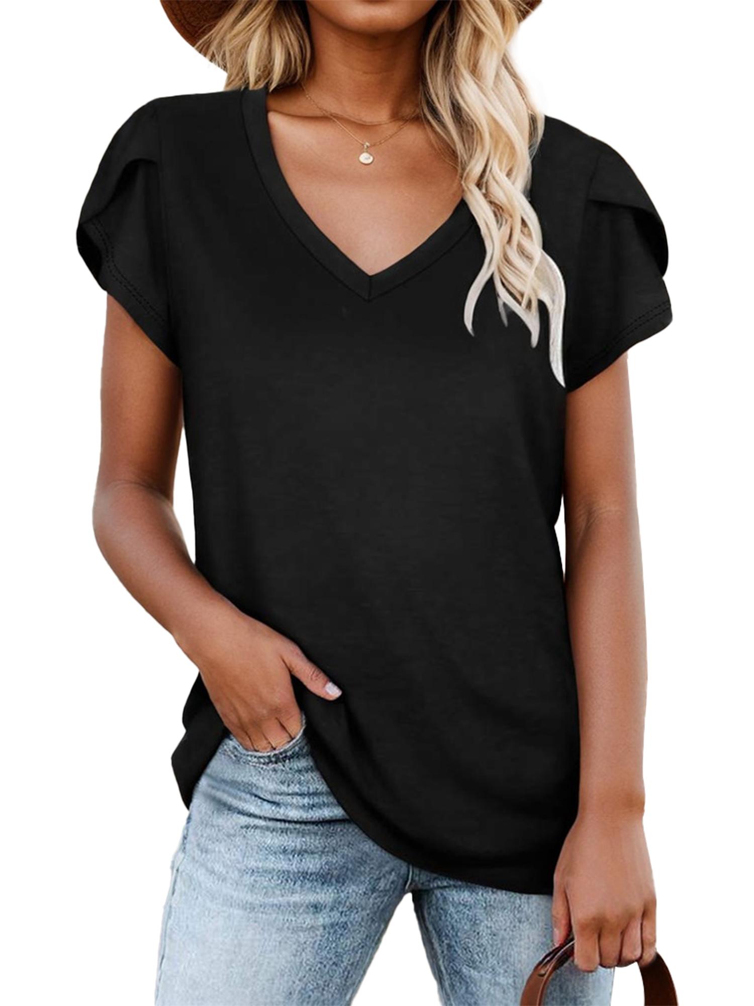 Womens Tops V Neck Petal Sleeve Casual T-shirt