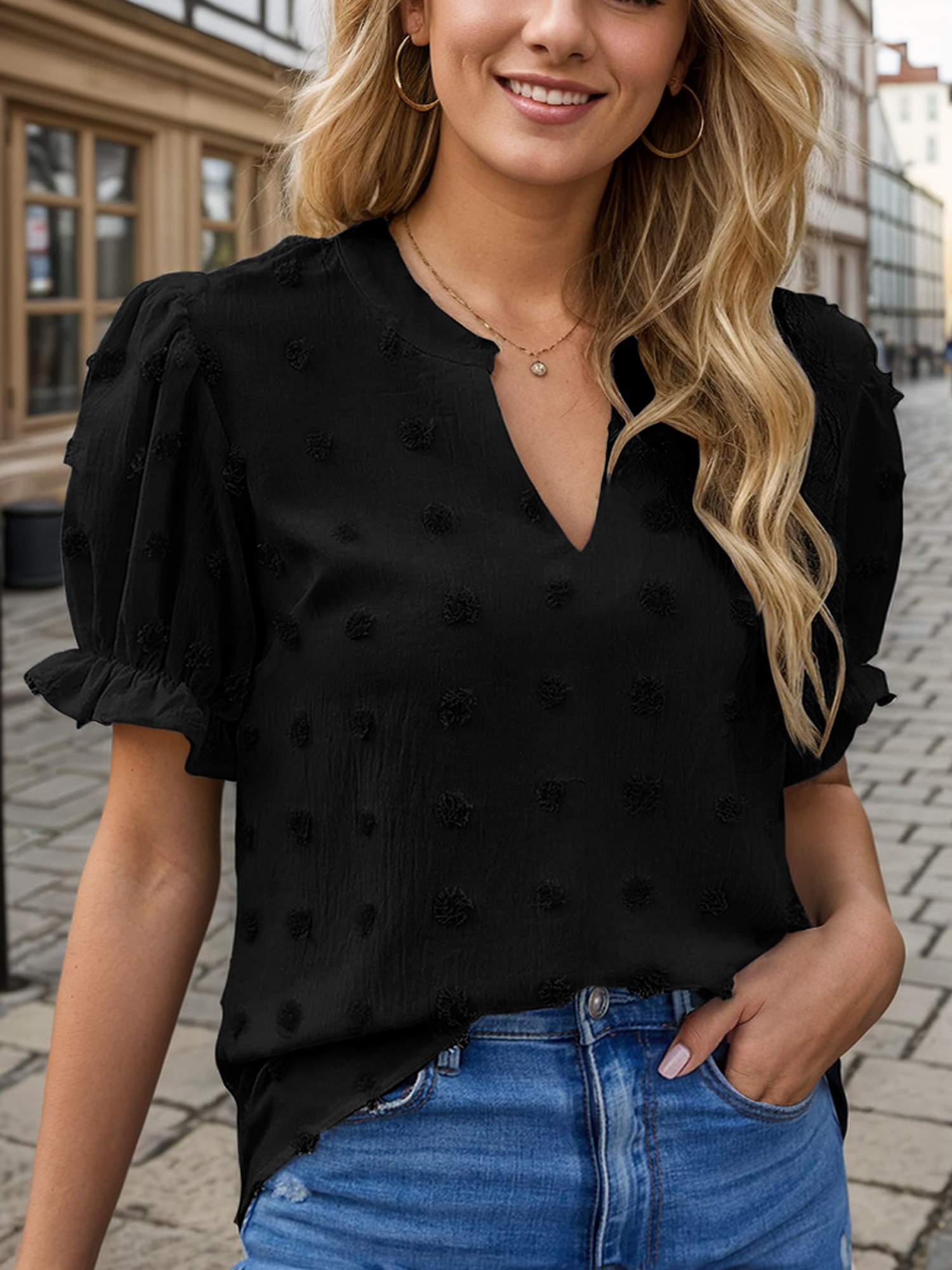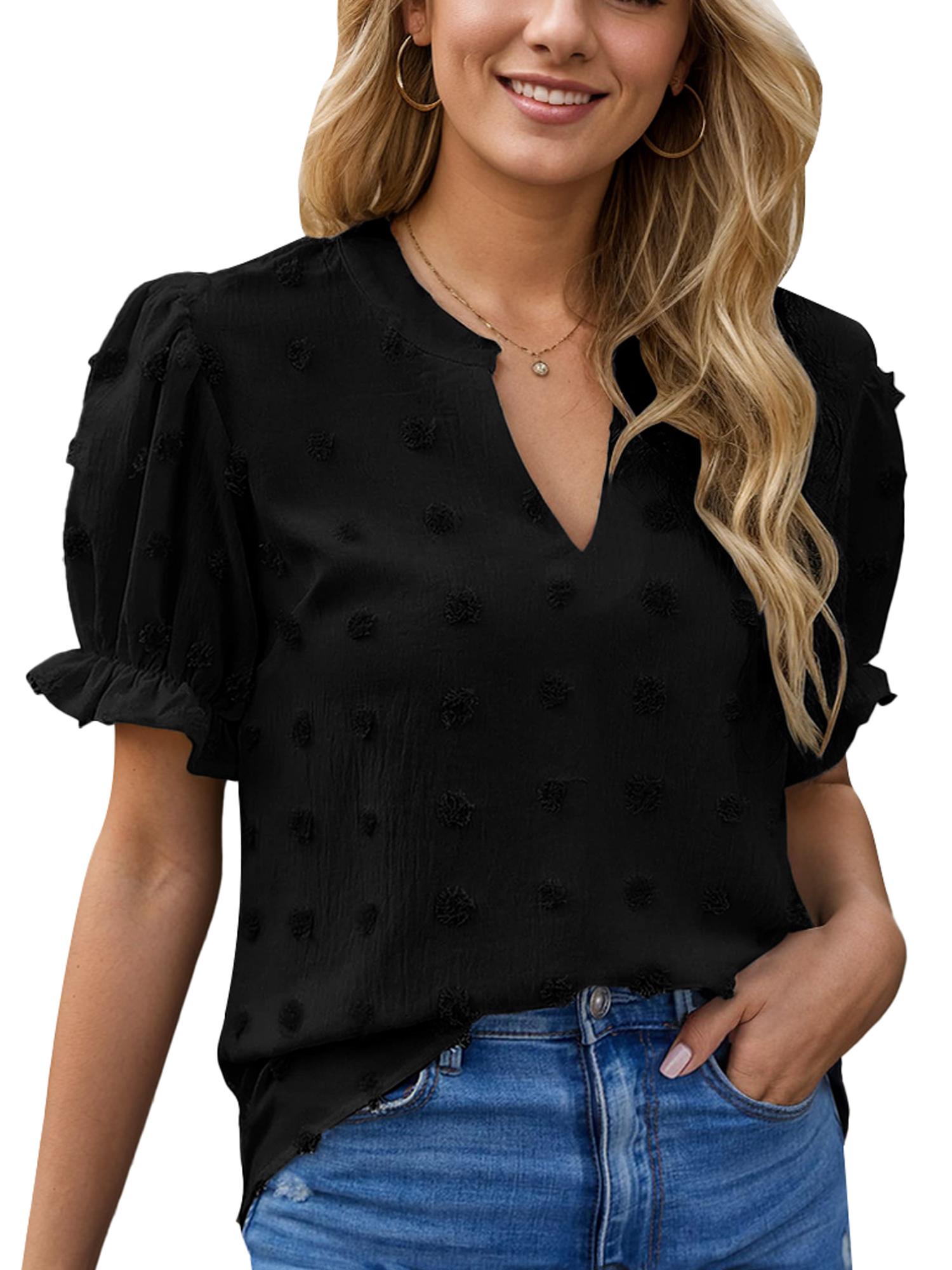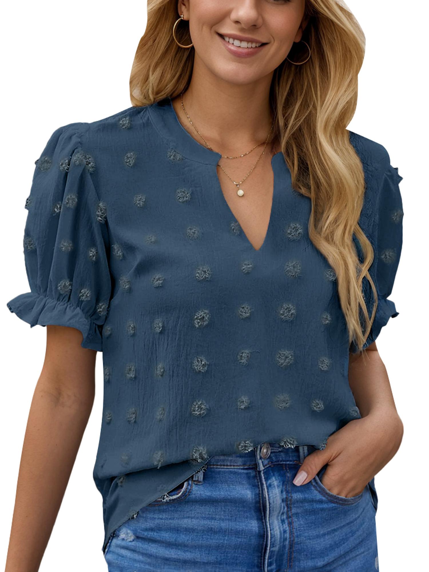 Womens Puff Sleeve Tops Chiffon V Neck Short Sleeve Blouses