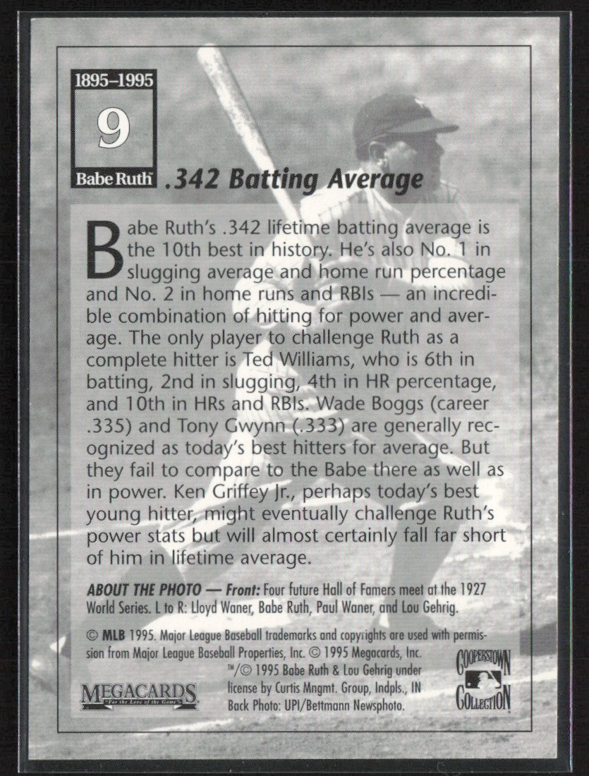 | 1995 Megacards .42 Batting Average Babe Ruth New York Yankees #9 | ||||||||||||||||||
