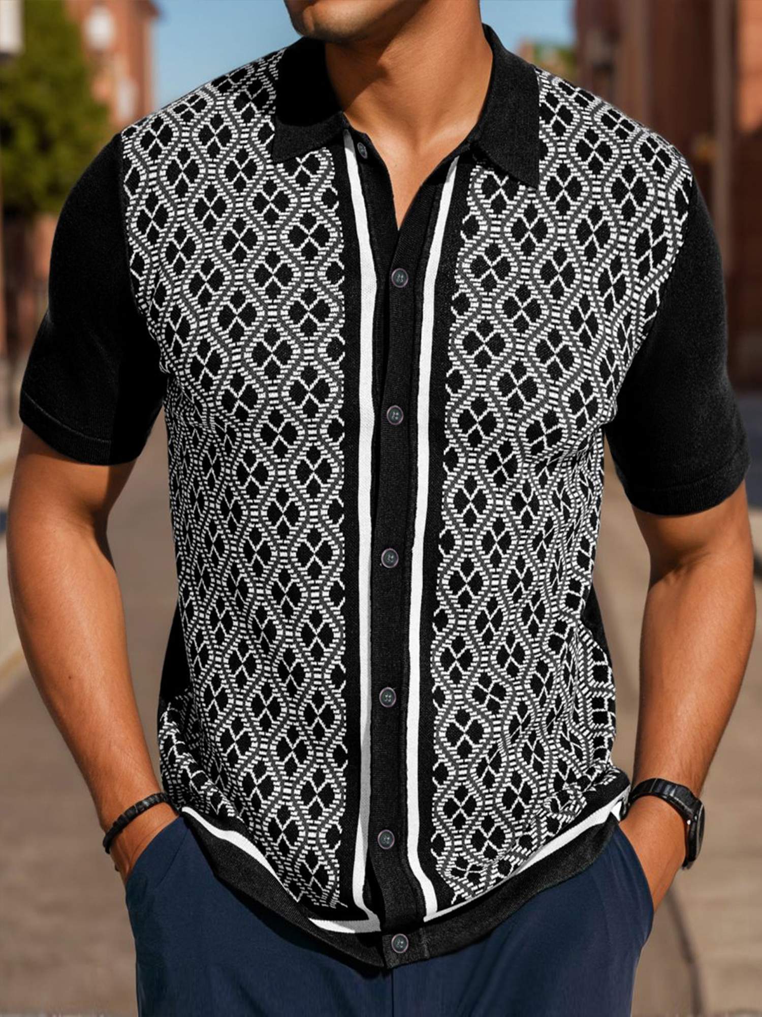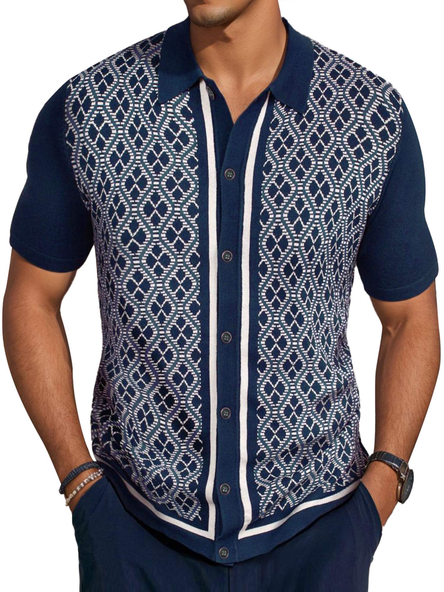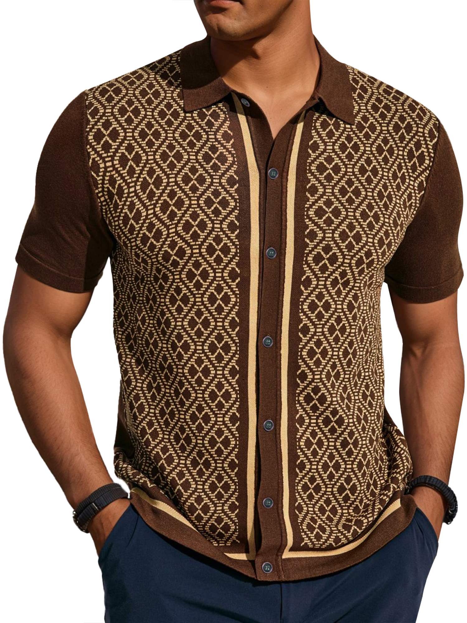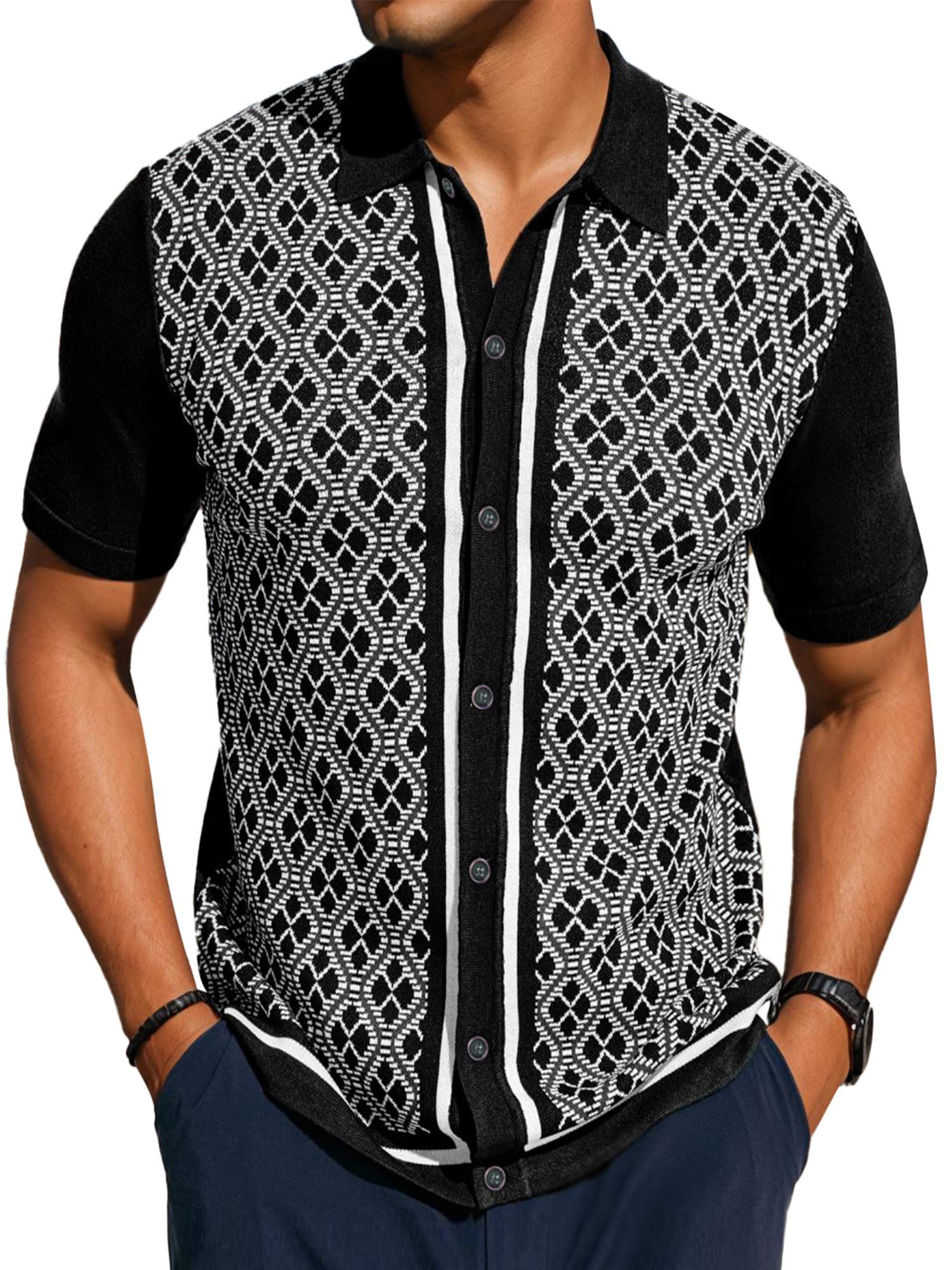 Design: Breathable knit, 70s contrast color, short sleeve, button down, ribbed hem and cuff, button closure