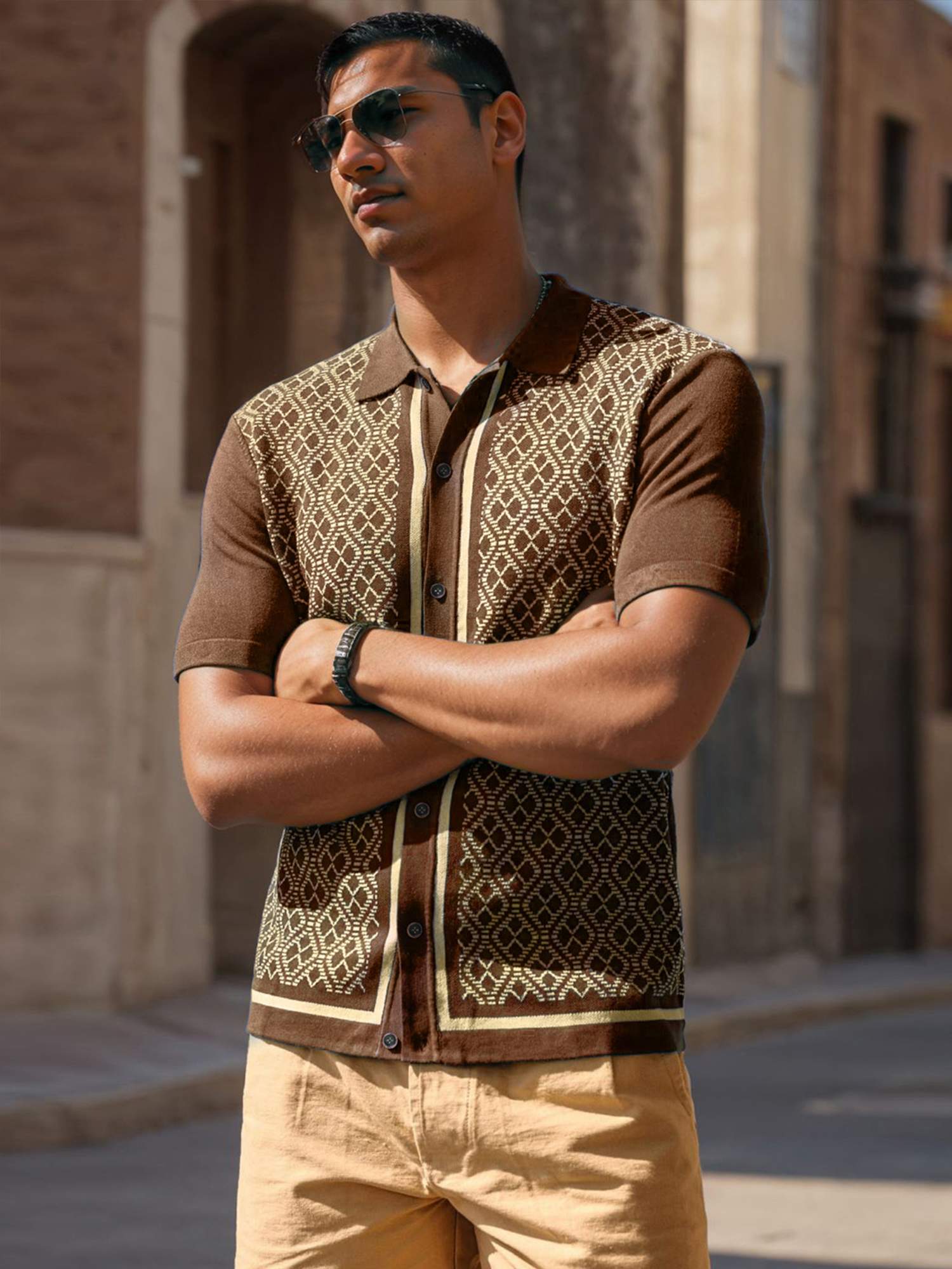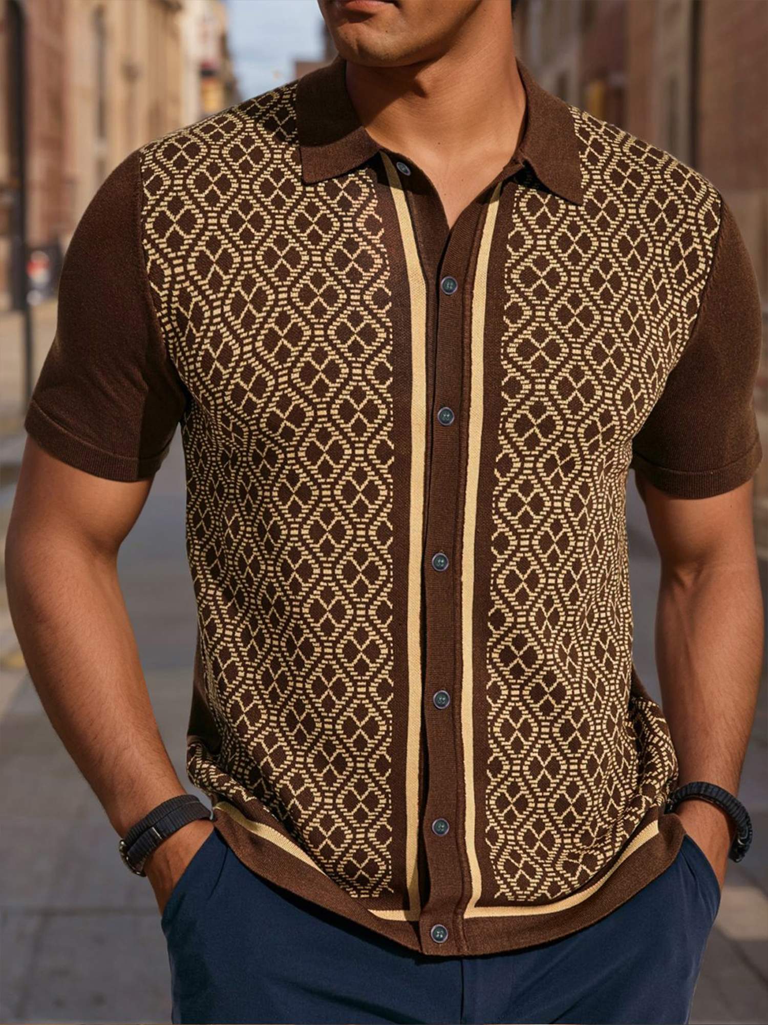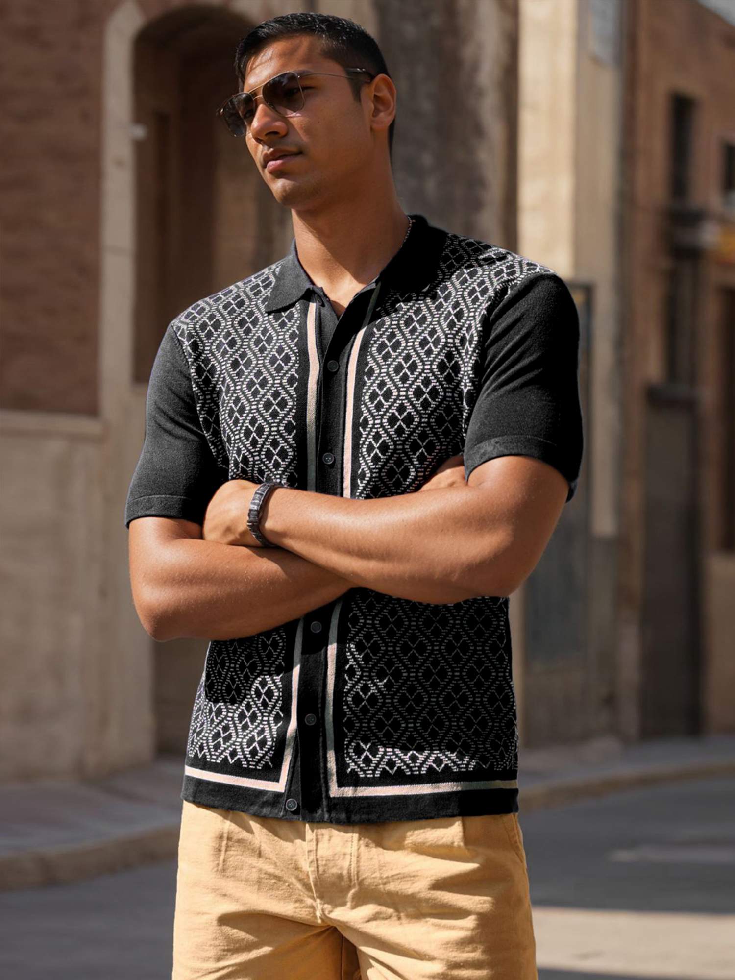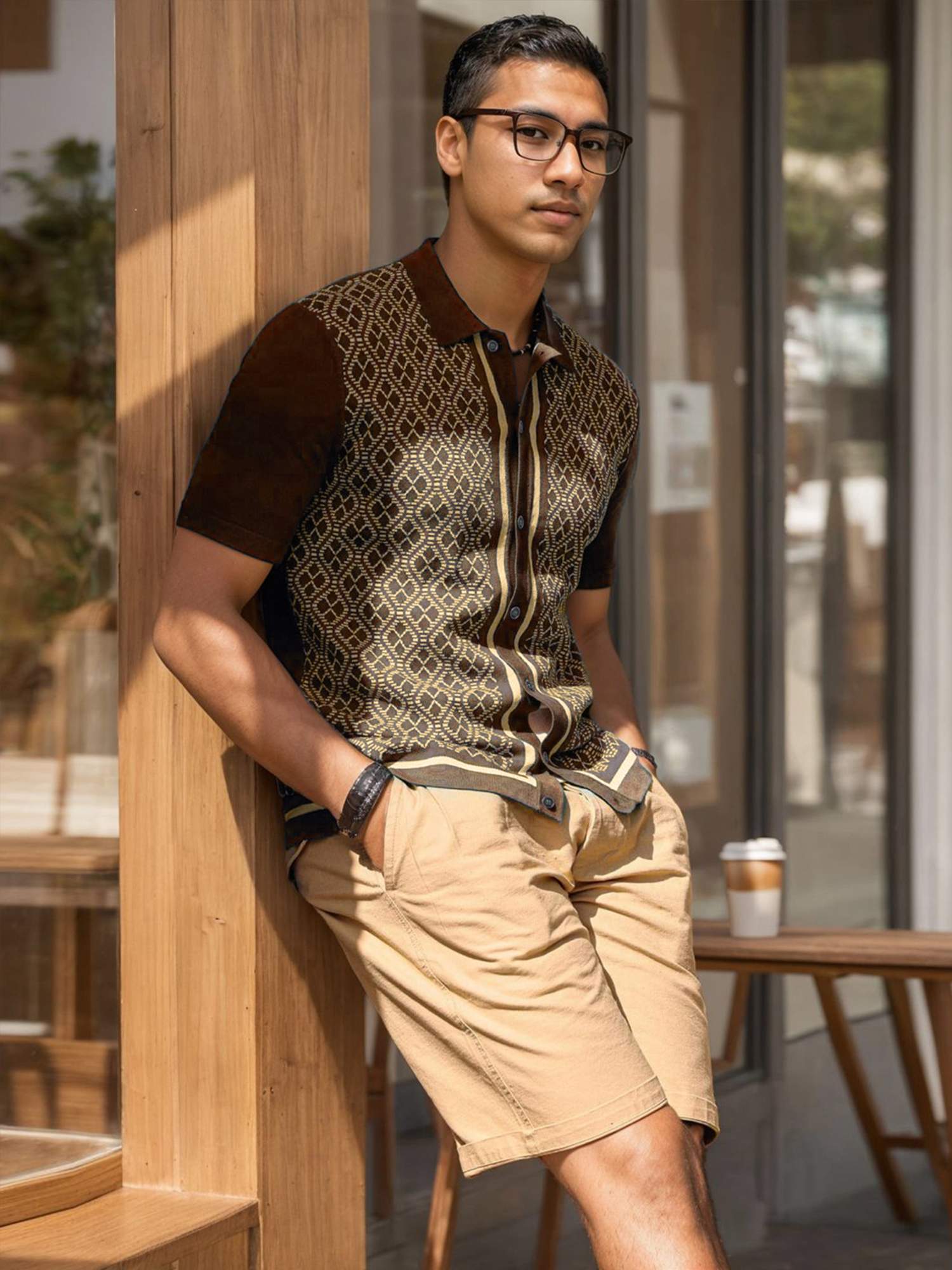 Design: Breathable knit, 70s contrast color, short sleeve, button down, ribbed hem and cuff, button closure
