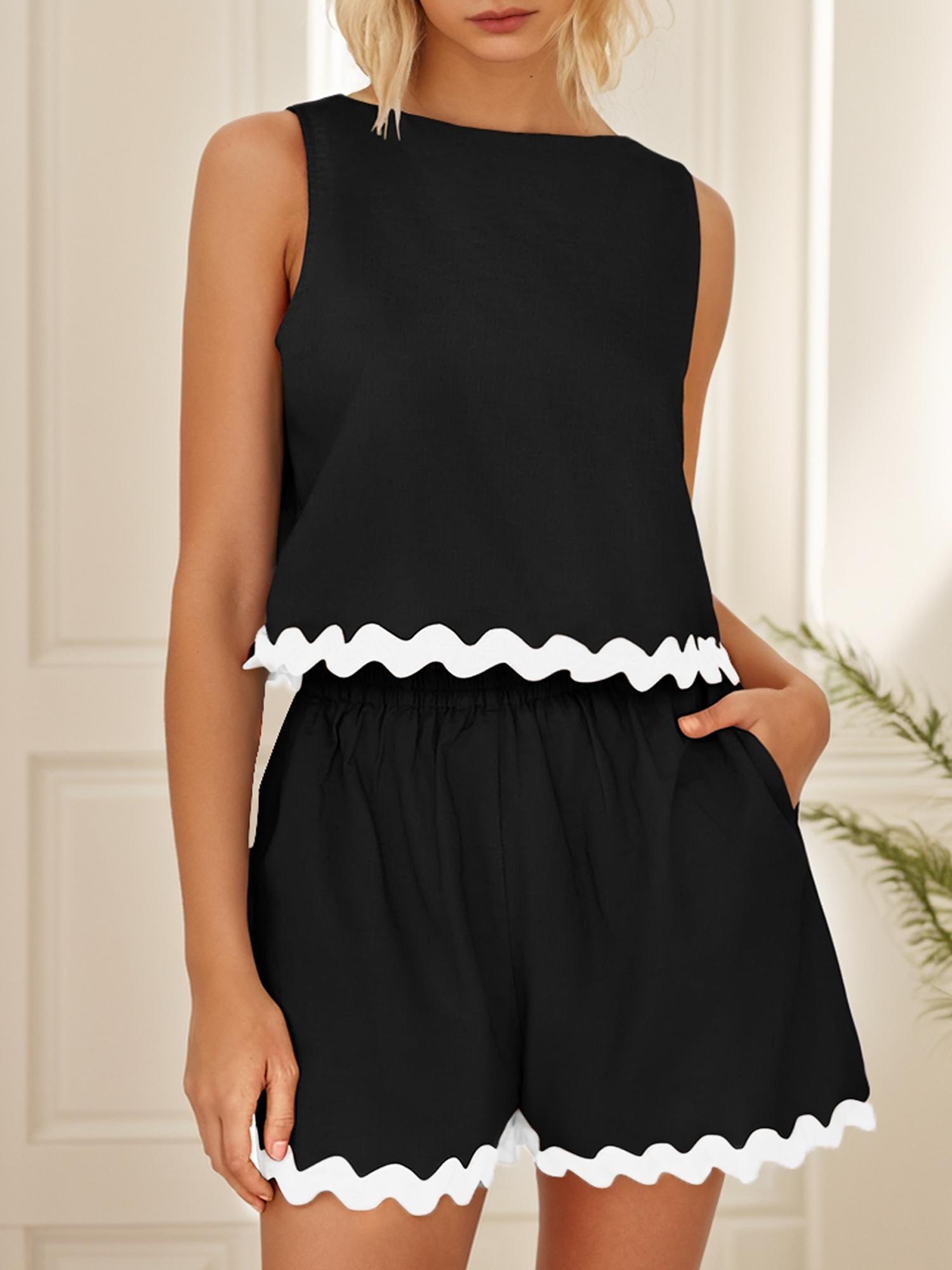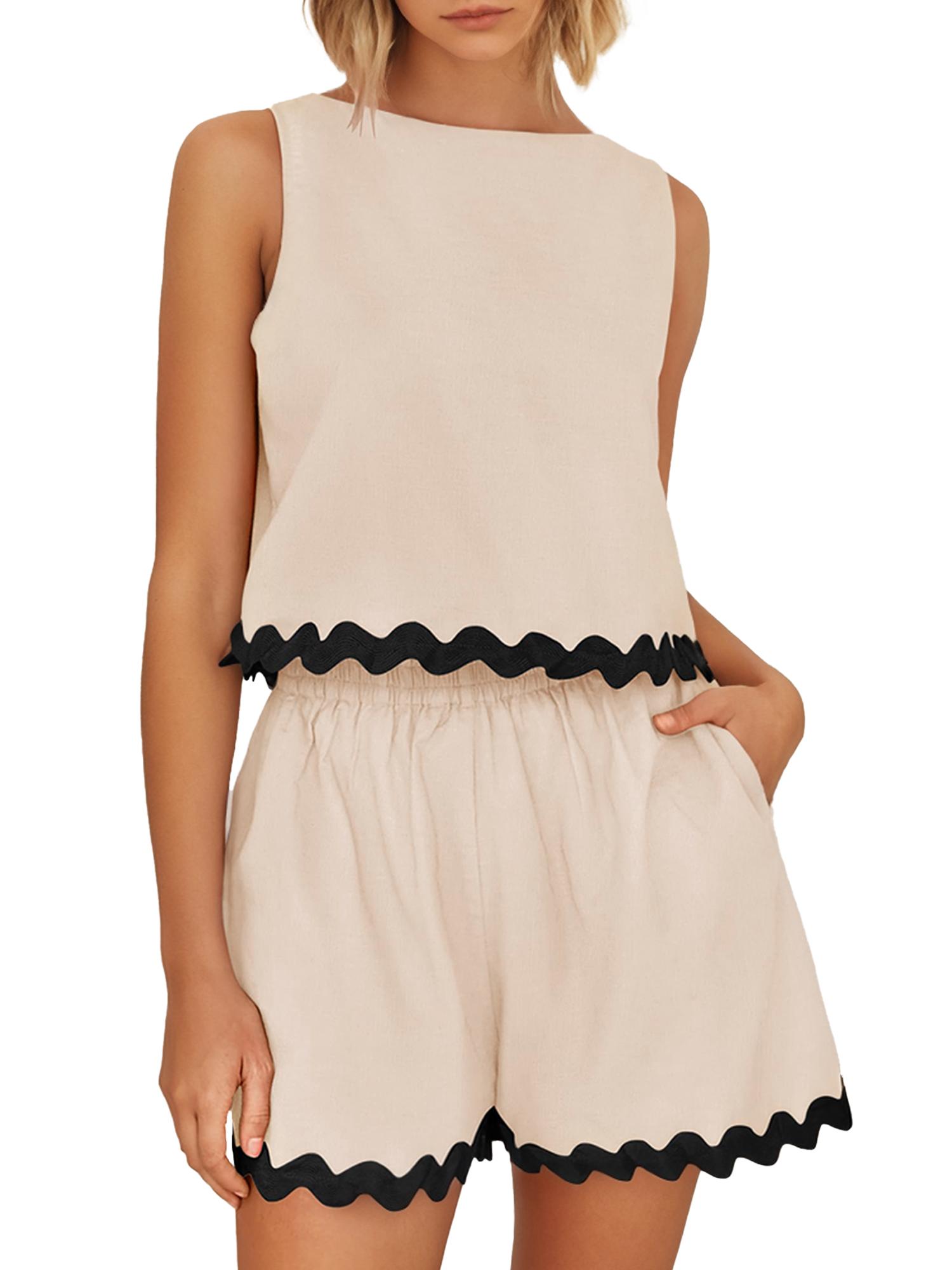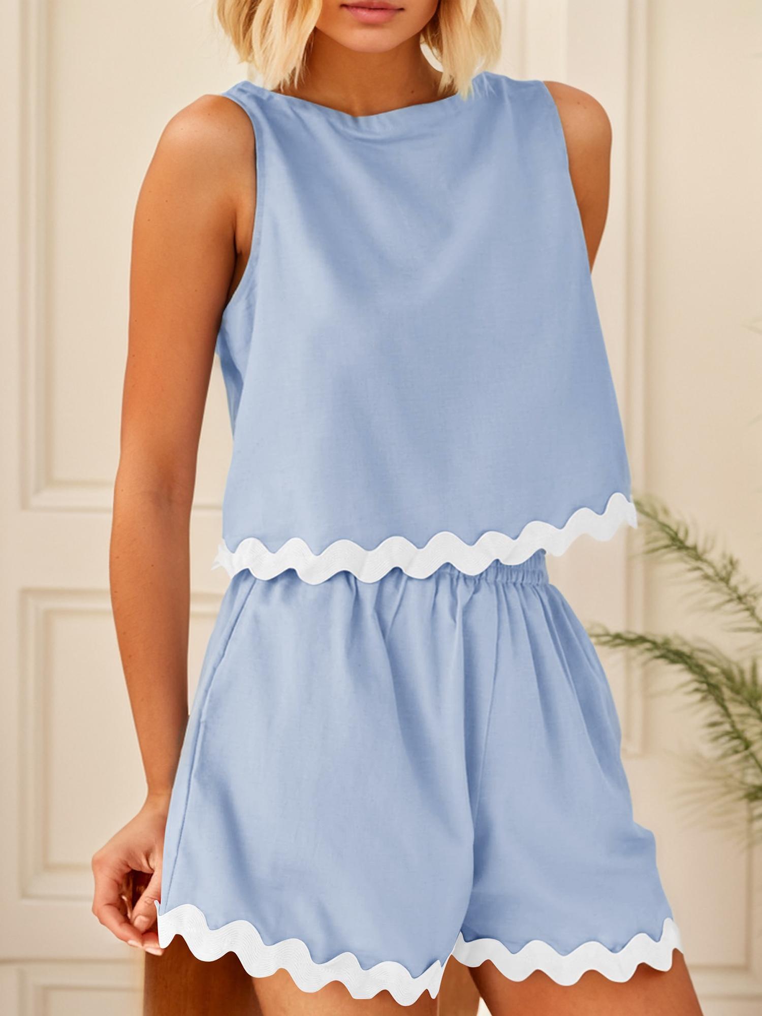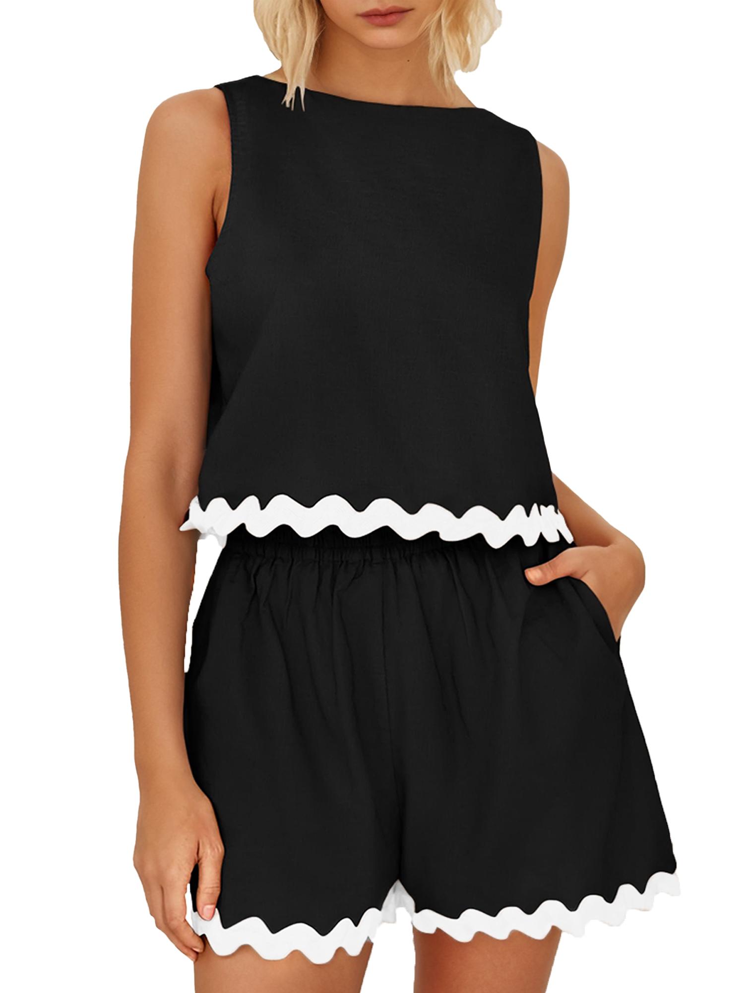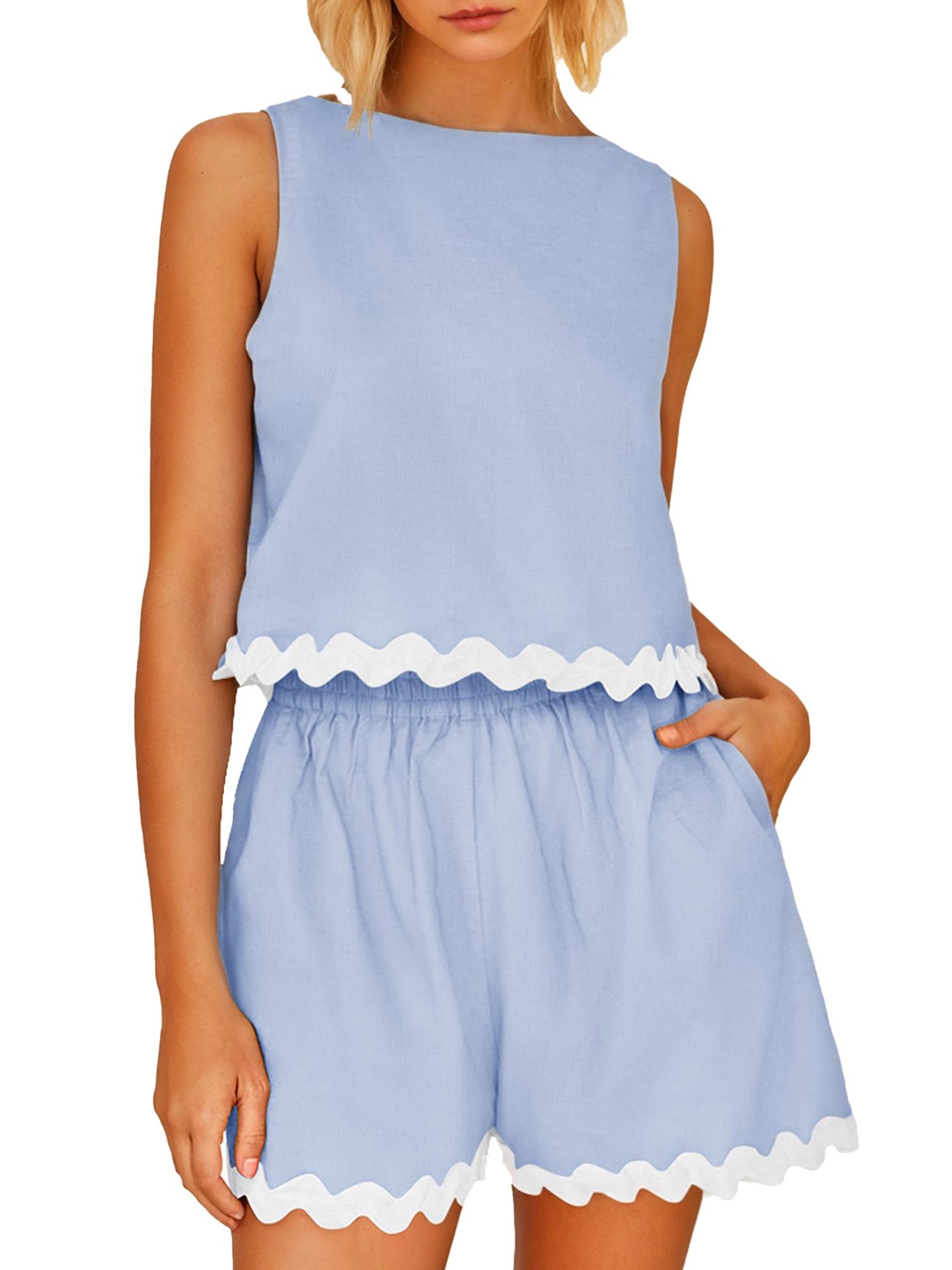 Round neck, sleeveless crop top, high-waist shorts, solid color, loose fit, lace trim, side pockets.