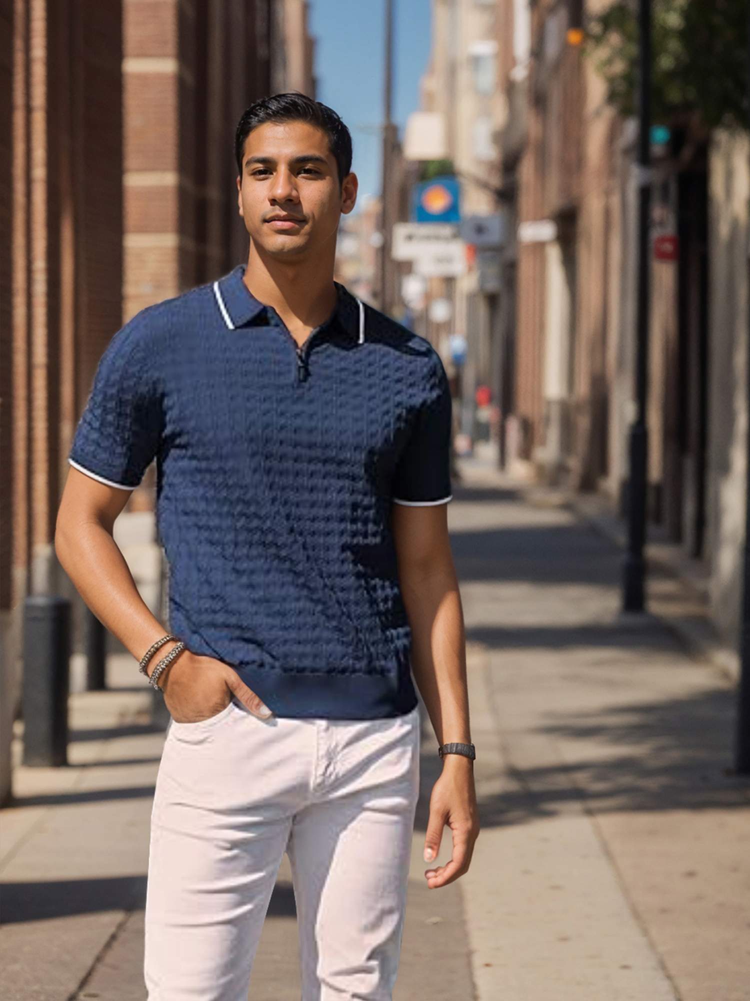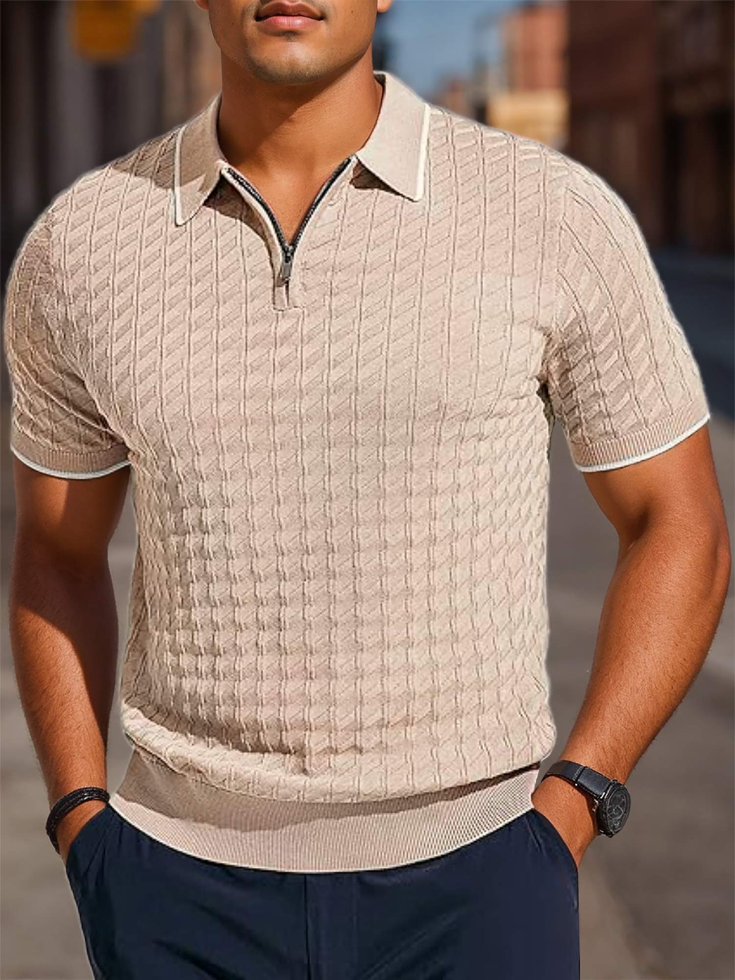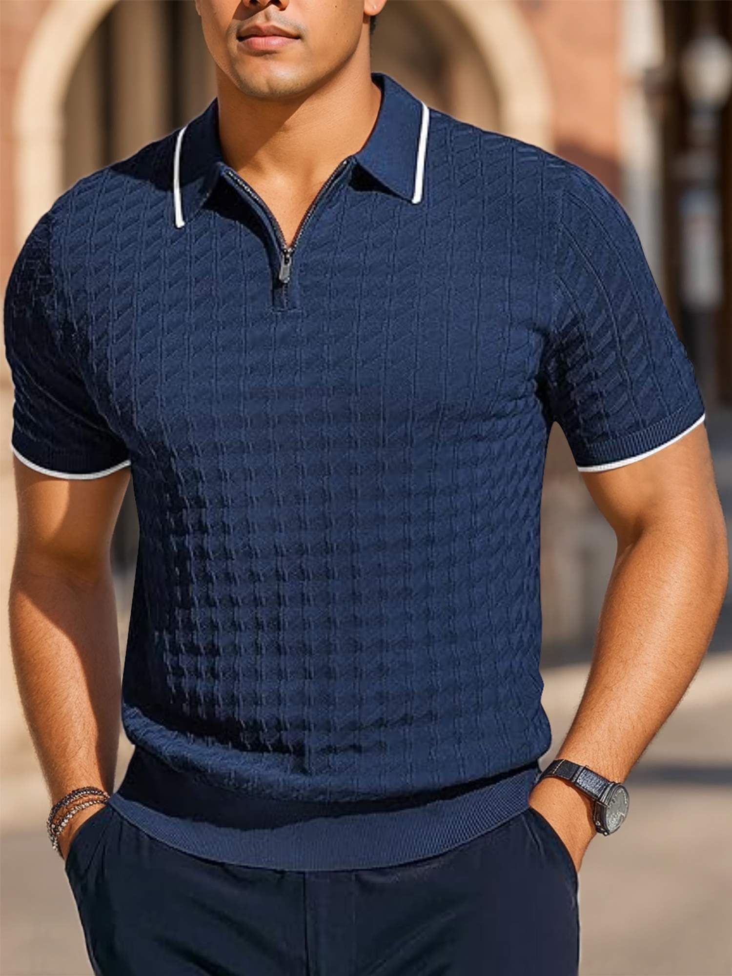 Features a 1/4 zip, turn-down collar, white stripes on collar and cuffs, and textured fabric.