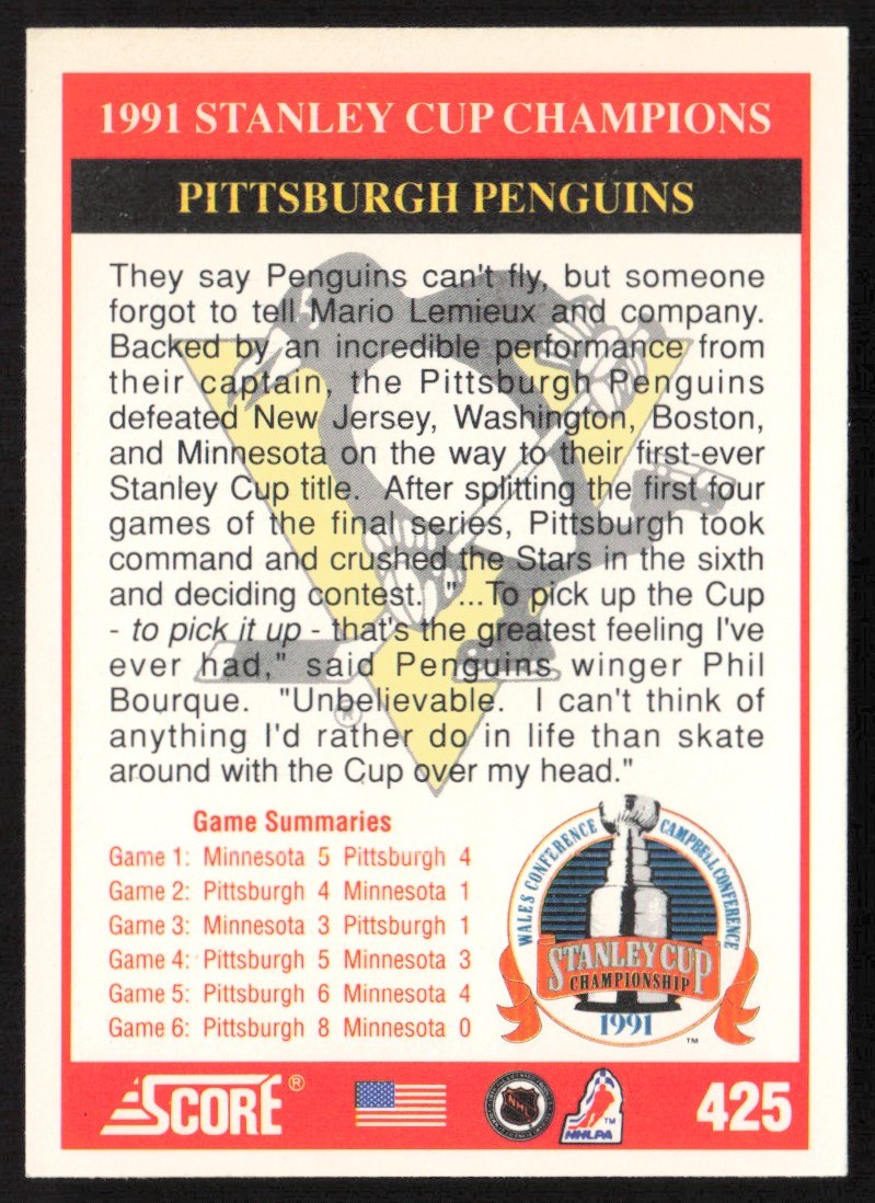 | 1991-92 1991 Stanley Cup Champions Mario Lemieux Pittsburgh Penguins #425 | ||||||||||||||||||