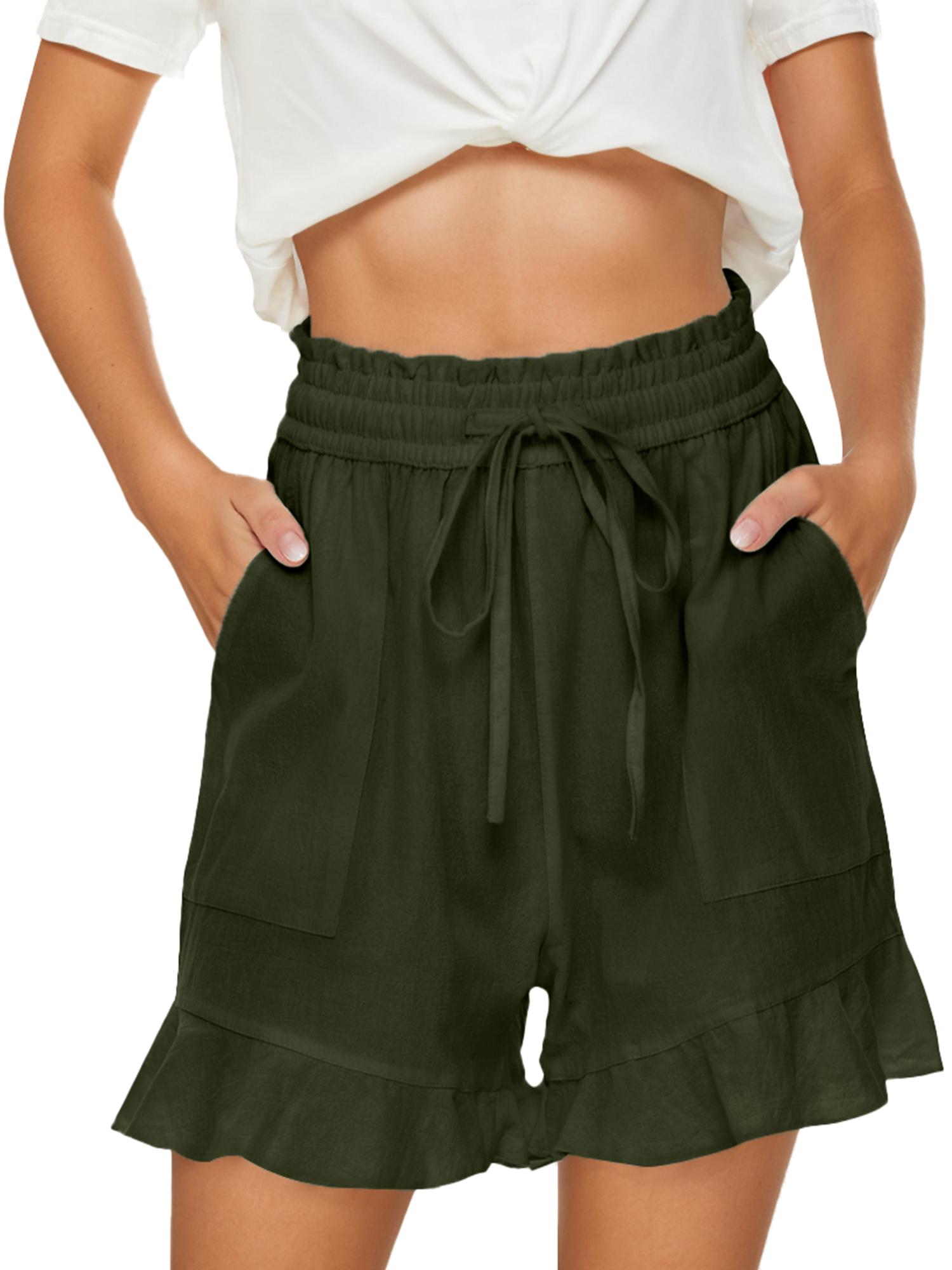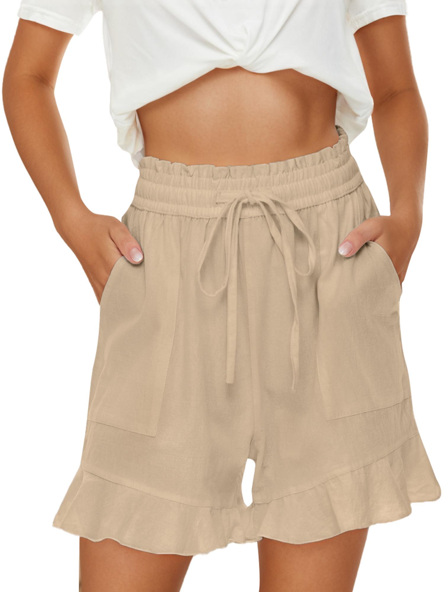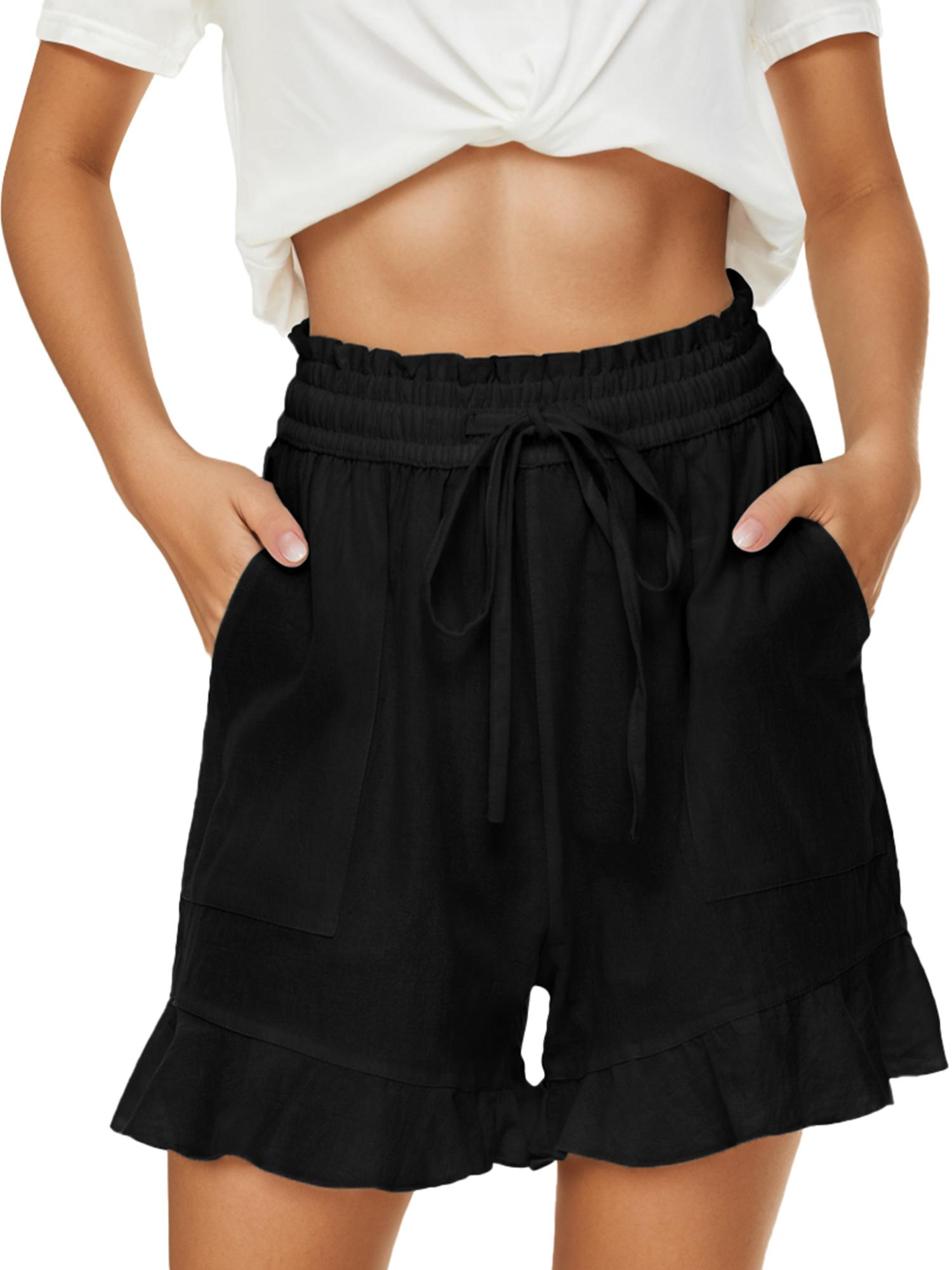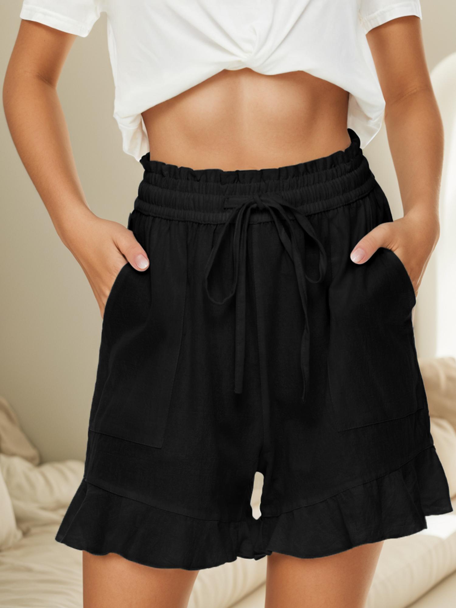 High-waisted, wide-leg summer shorts with ruffle hem, drawstring, and two side pockets.