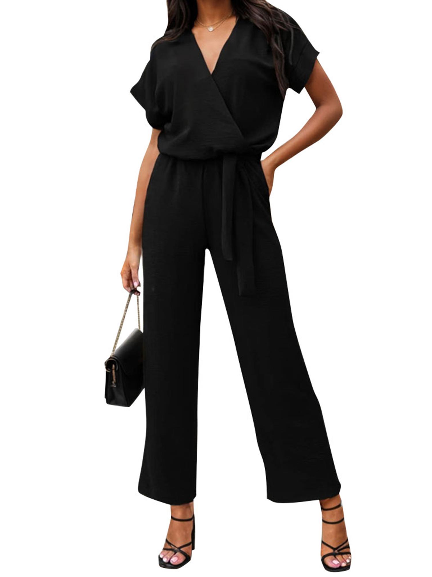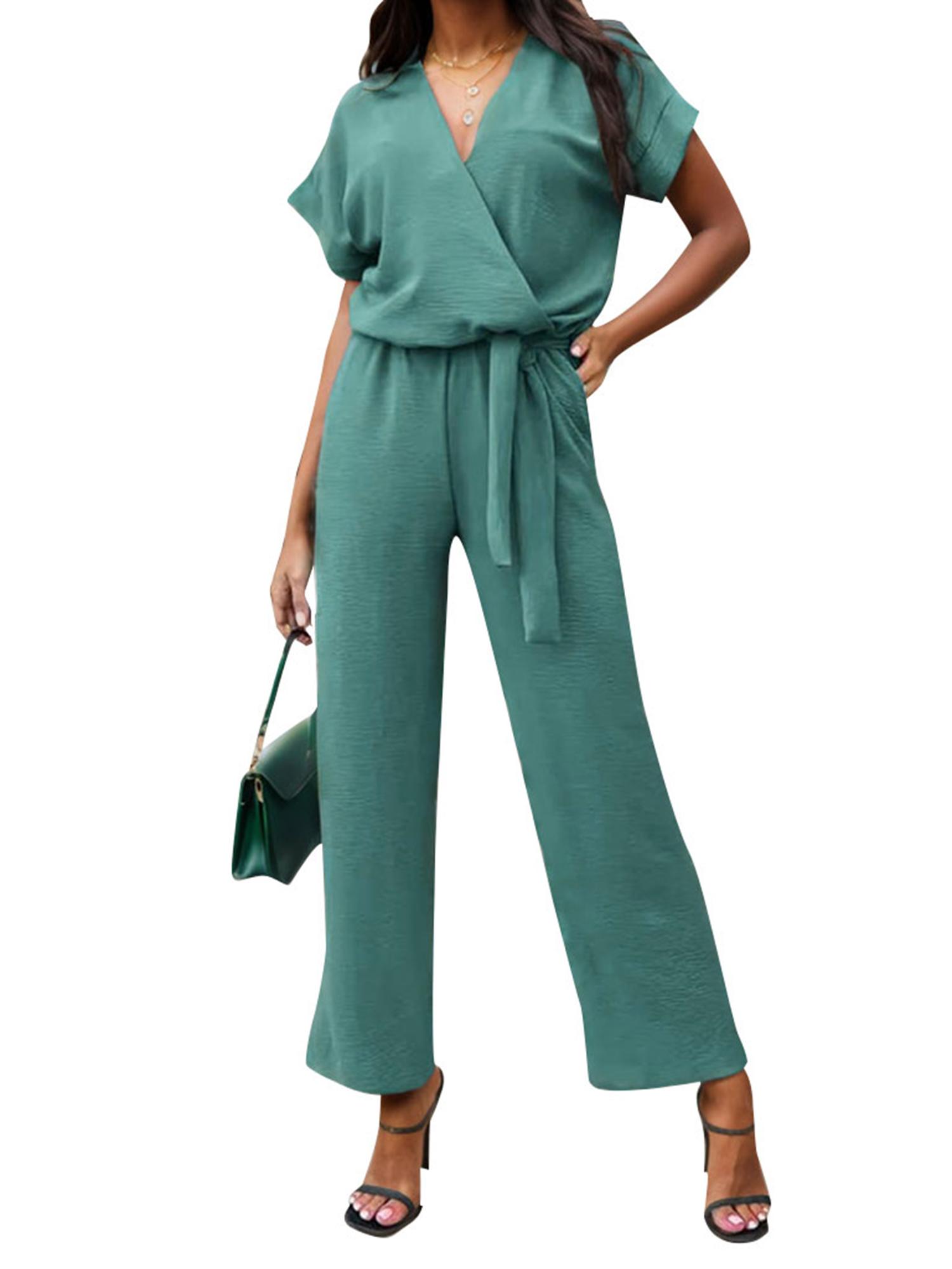 Women's Jumpsuit Casual Short Sleeve Wrap V Neck Belted Wide Leg Pants