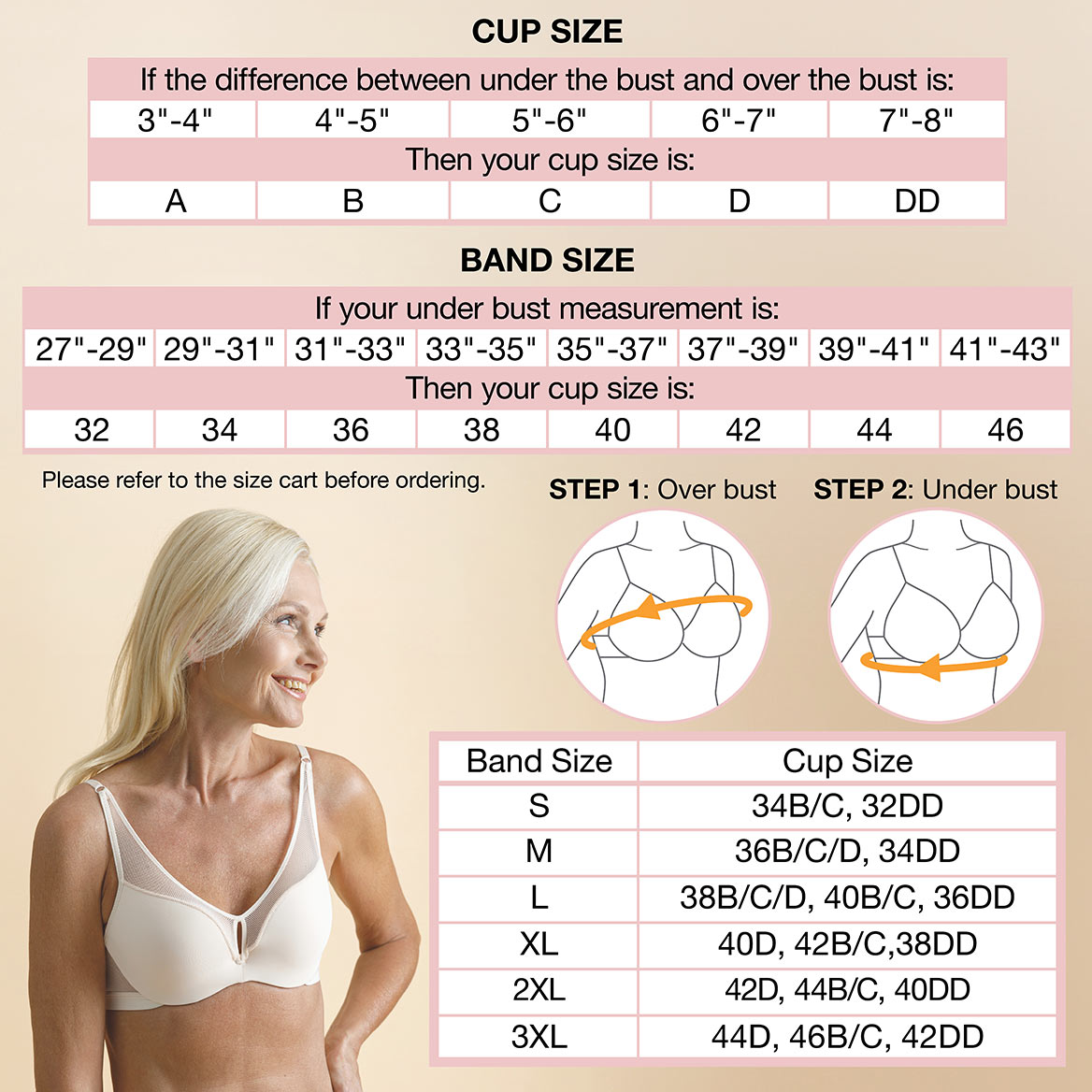 Convenient snap on/off ease means no more struggling with tiny hooks. Four easy snaps make this Snap Front Bra super convenient and helps eliminates straining when you put it on or take it off. A plush, soft fabric-covered 1" elastic band at bottom eliminates painful underwires, while wide back straps provide comfort and support. This wireless bra is a great choice for those who struggle with arthritis or limited dexterity. Stretch cups fit A - DD. Choose size: S (30-32), M (34-36), L ( 38-40), XL (42-44), 2XL (46-48) or 3XL (50 -52). Cotton/spandex; machine wash. Imported.
