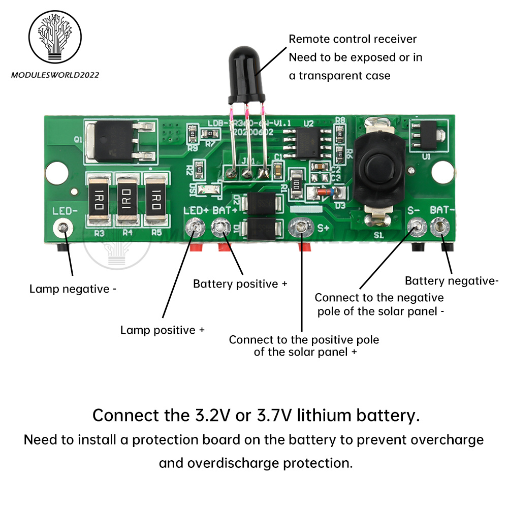 This control board does not come with overcharge and overdischarge protection, connecting the battery needs to be battery comes with a protection board, compatible with 3.2V lithium iron phosphate battery 3.7V lithium battery, can be used for solar integrated street light modification or repair!