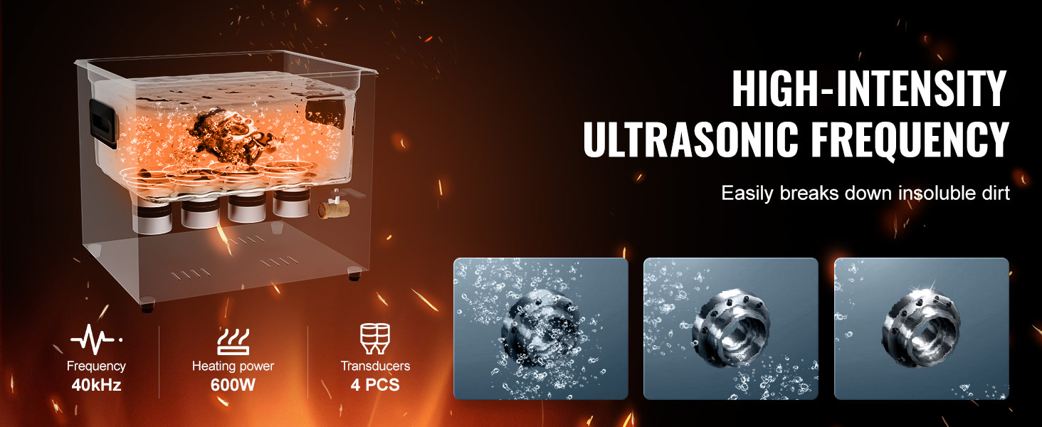 Dank modernster Schallkopftechnologie erzeugen die 40 kHz Ultraschallwellen Millionen kleiner Bläschen, die tief in Oberflächen und Spalten eindringen und den Schmutz effektiv entfernen, ohne das Aussehen oder die Qualität des Objektes zu beeinträchtigen.