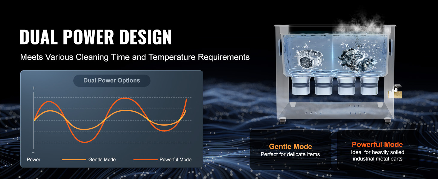 Der Entgasungsmodus beseitigt große Blasen für eine gründliche Reinigung der inneren Löcher und Spalten. Dadurch wird eine präzise Null-Winkel-Reinigung erreicht und die Reinigungseffizienz um 30 % gesteigert. Die beiden Leistungsstufen bieten eine sanfte Reinigungsoption zum Schutz empfindlicher Objekte.