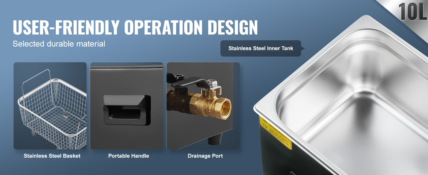 Langlebiges & praktisches Design: Der Reiniger besteht aus korrosionsbeständigem 304-Edelstahl und verfügt über einen Korb zum Schutz vor Kratzern sowie einen tragbaren Griff für eine einfache Handhabung. Das Abflusssystem vereinfacht den Reinigungsvorgang