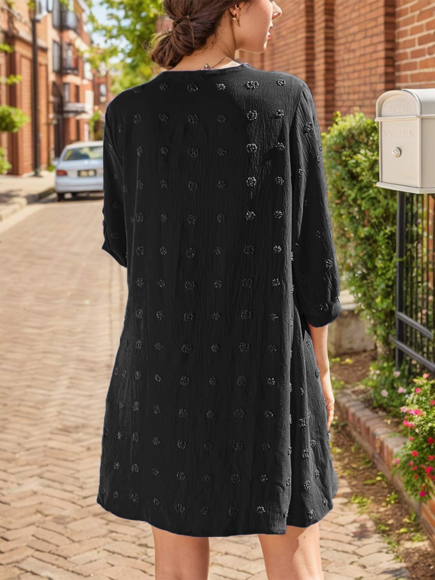 S wiss dots, 3/4 sleeves, loose fit, long enough to cover the hips, suitable for all body shapes.