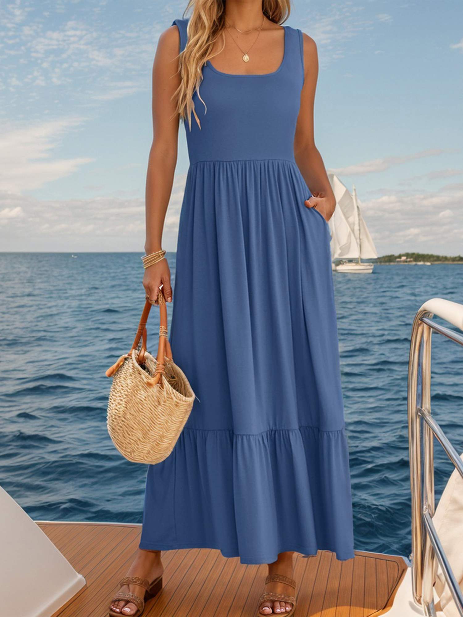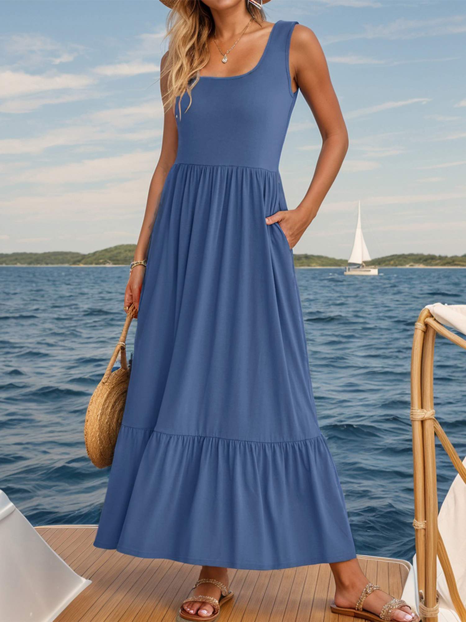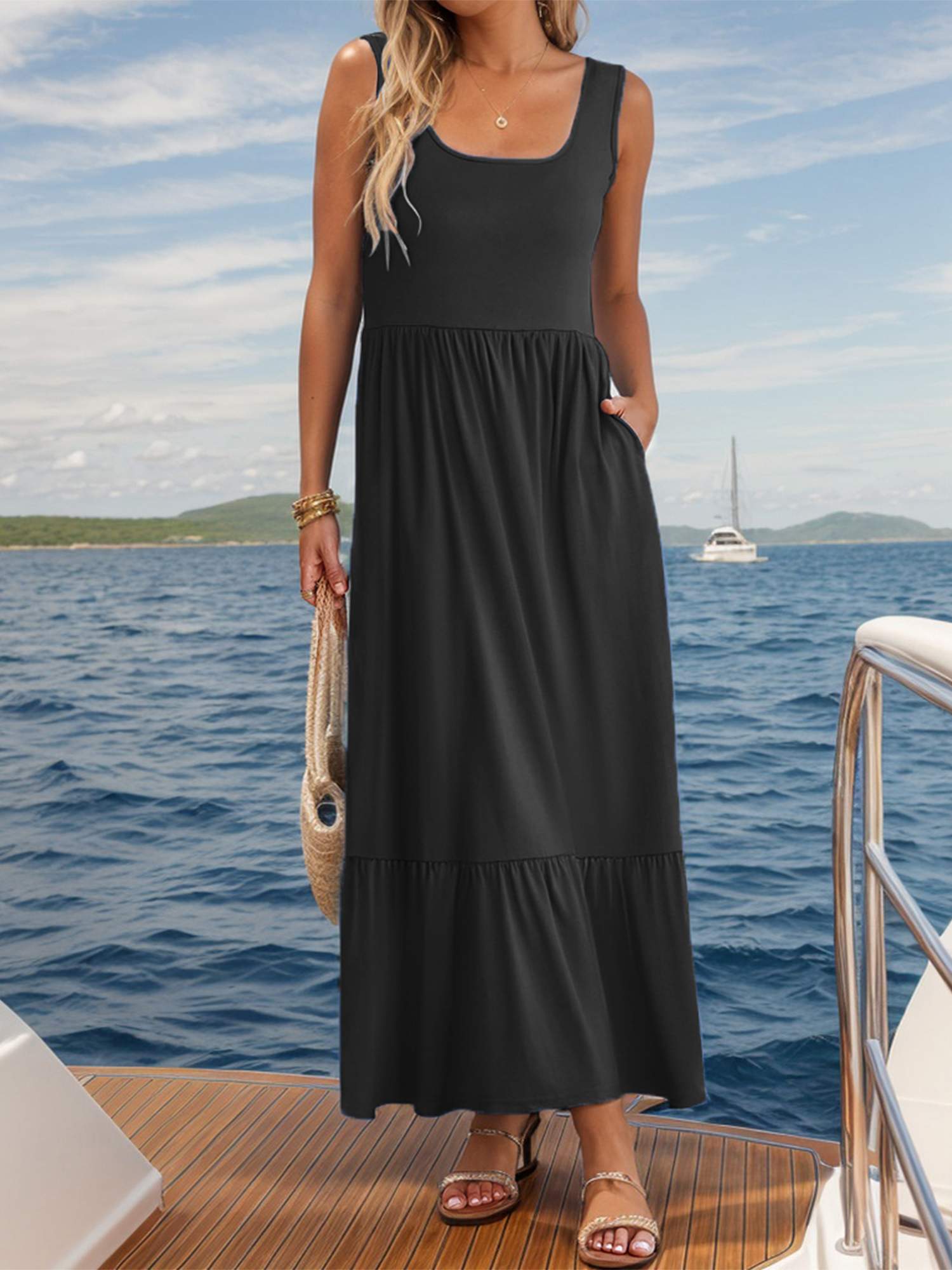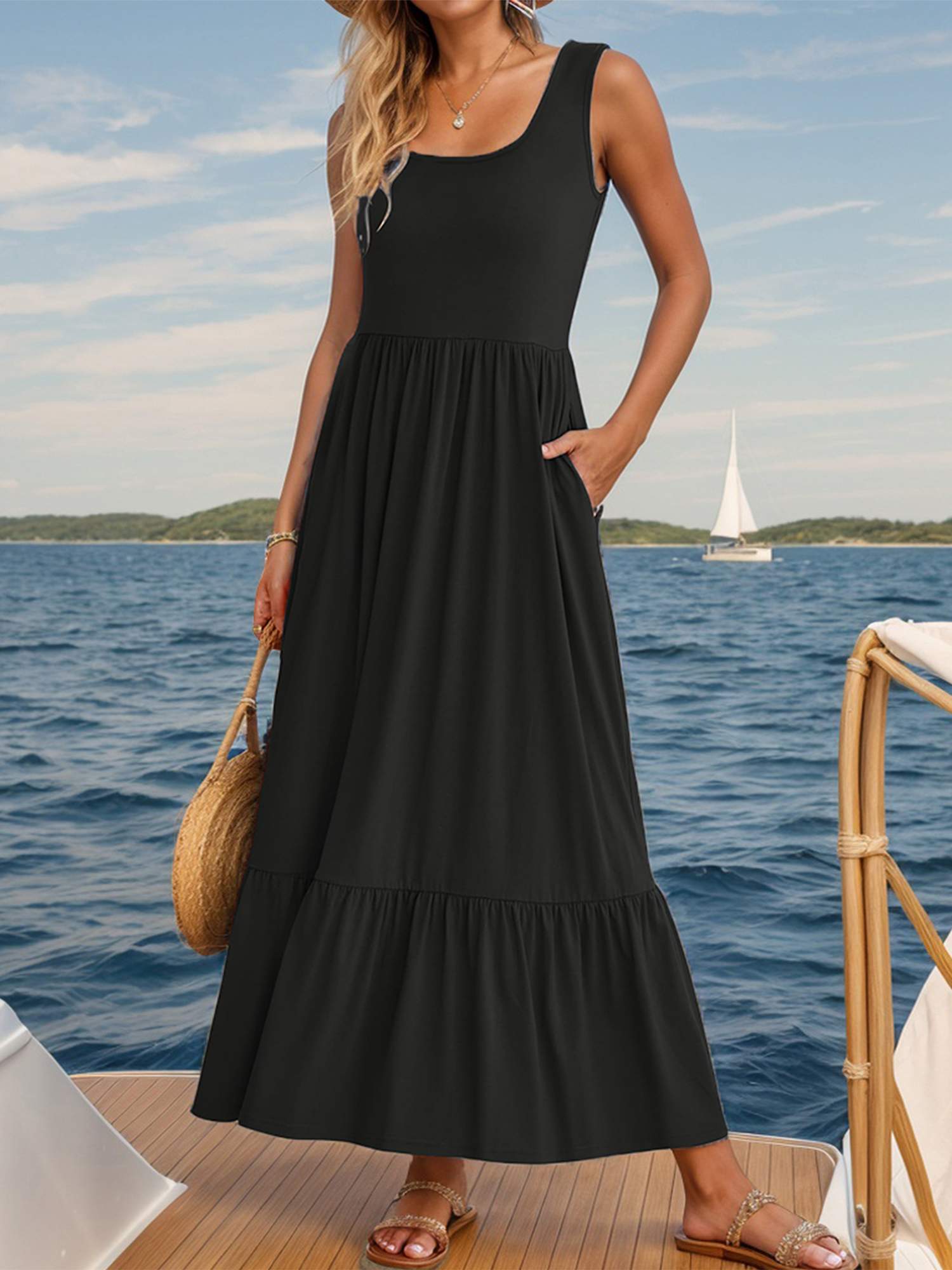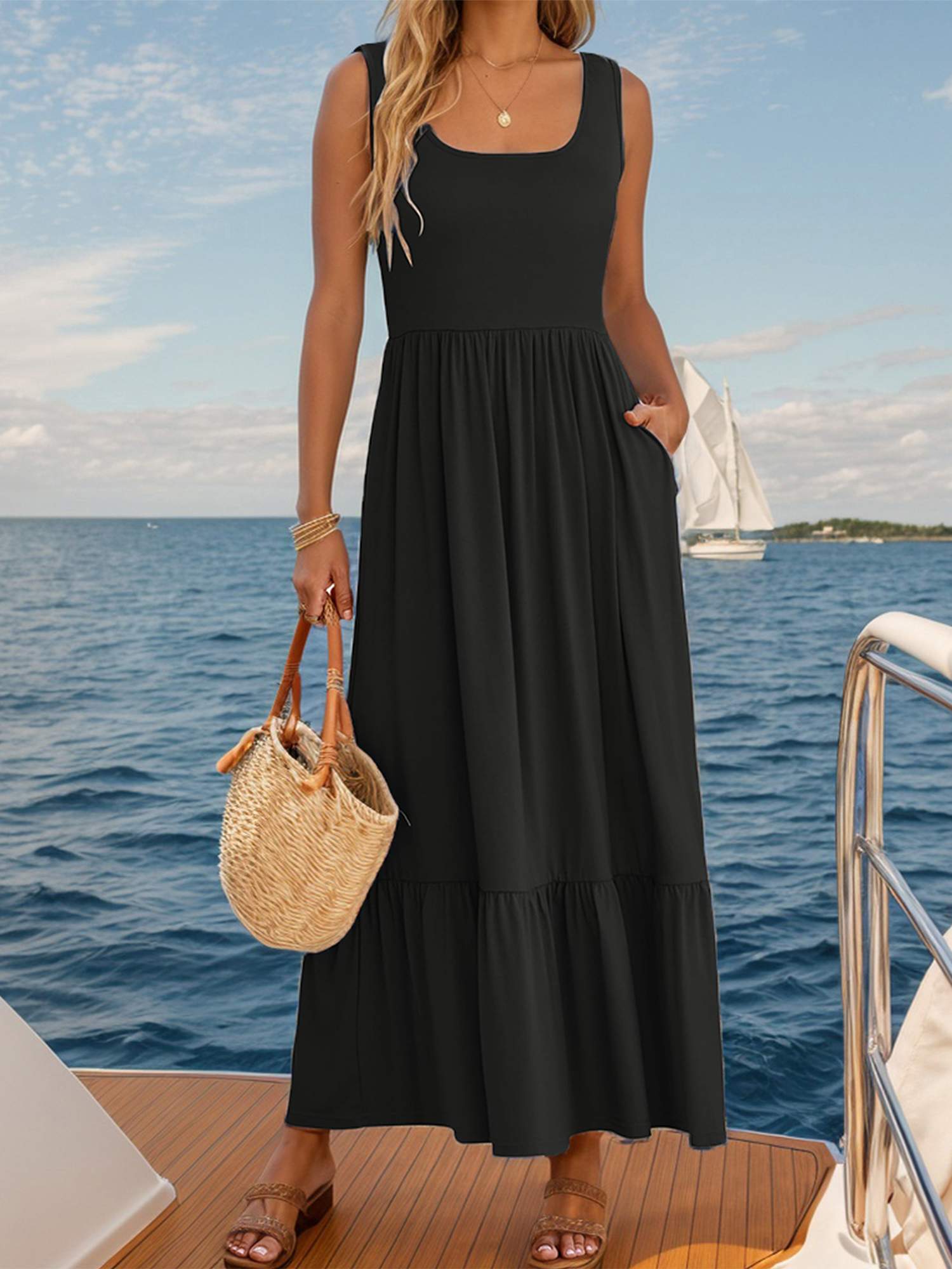 Casual maxi dress, sleeveless, solid color, stretchy, with two side pockets, tiered flowy design..