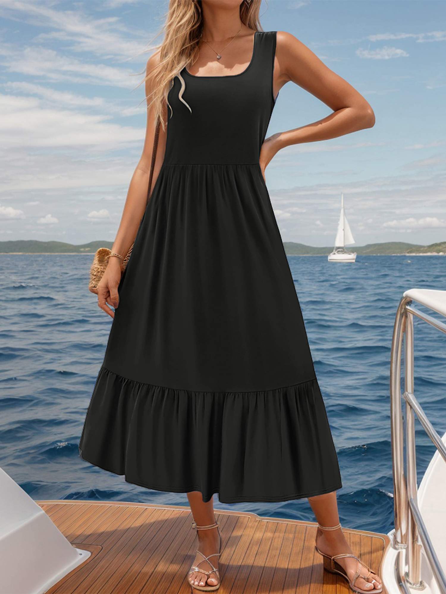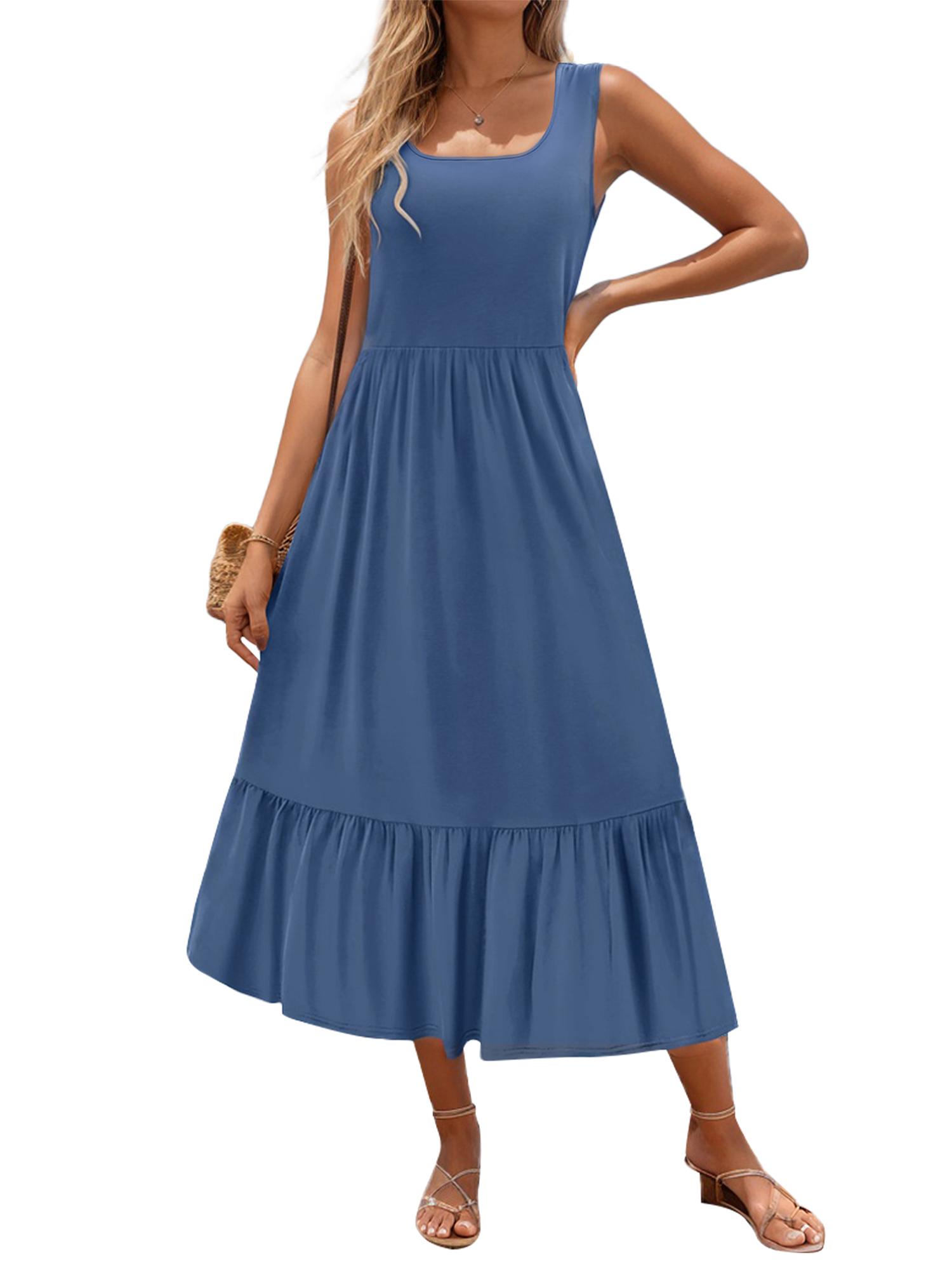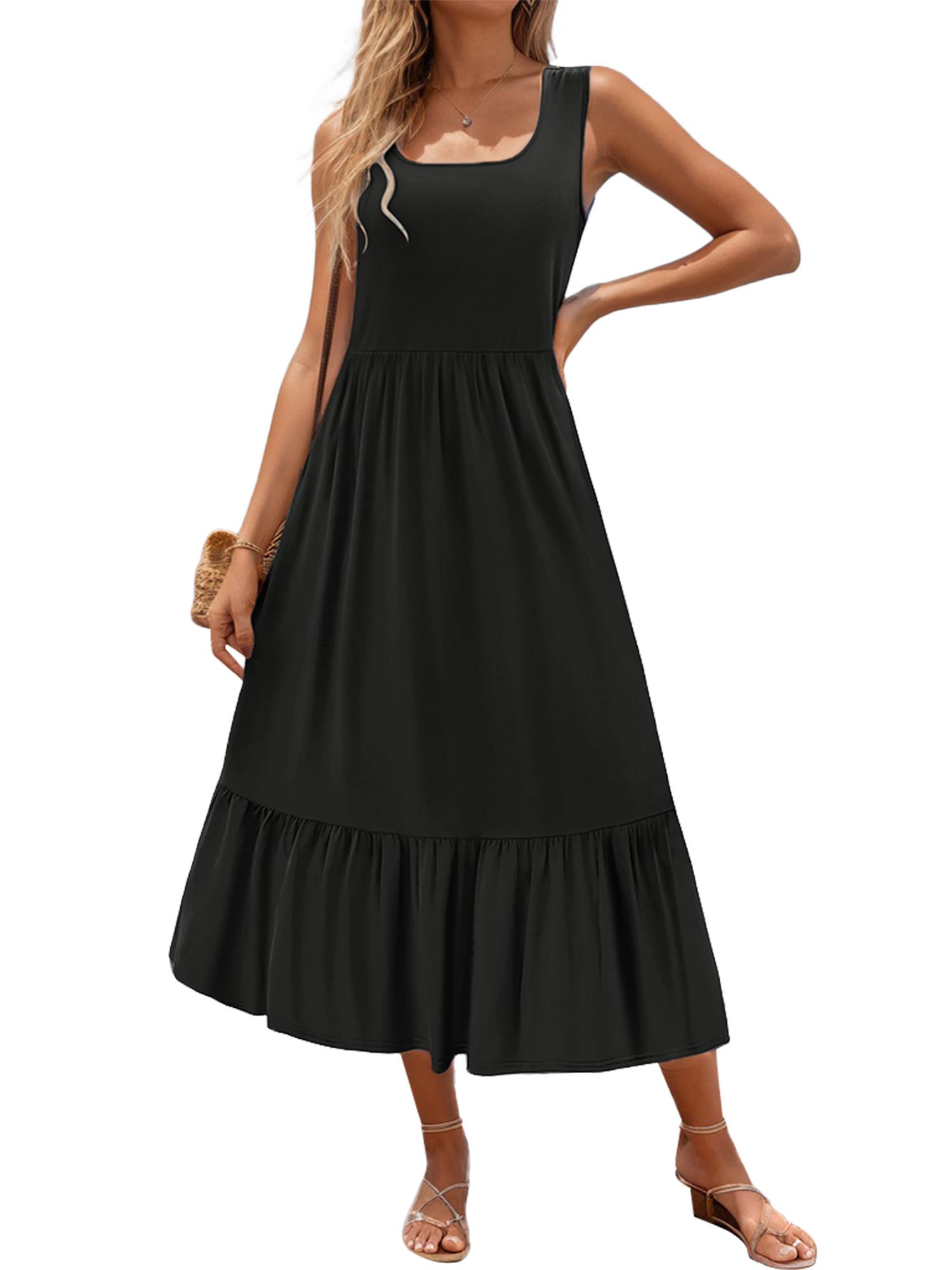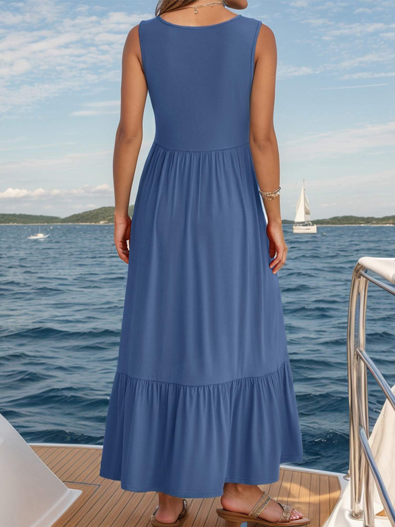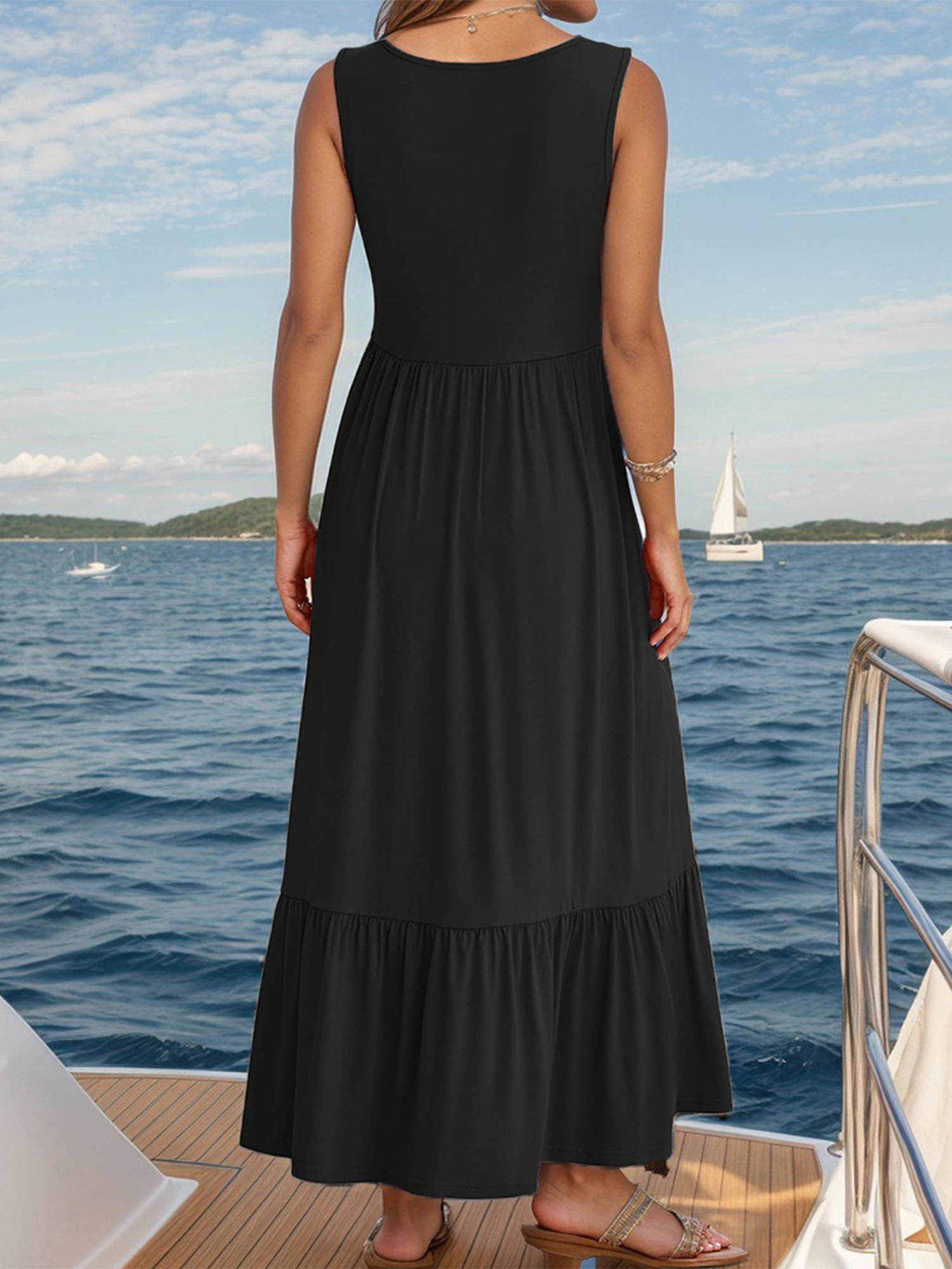 Casual maxi dress, sleeveless, solid color, stretchy, with two side pockets, tiered flowy design..