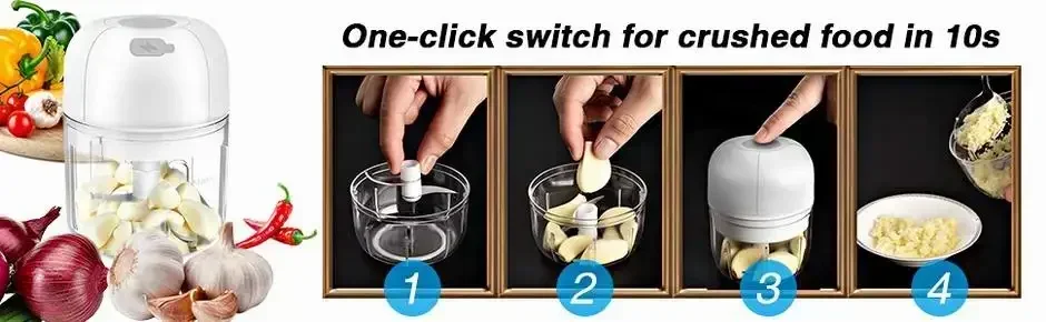 The electric garlic masher is a one-button switch operation.Press the button on the top and it will mash your food automatically. Put the ingredients into the container, close the lid, press the switch, and the food can be chopped in a few seconds.