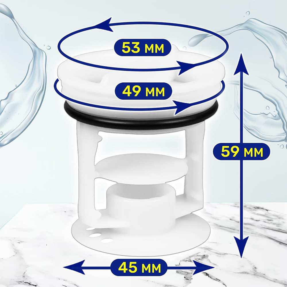 Abmessungen: Höhe 59 mm, Kappendurchmesser 53 mm, Gewindedurchmesser 49 mm, Basisdurchmesser 45 mm