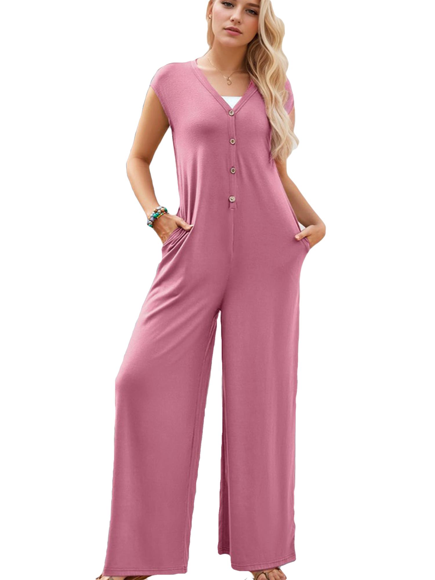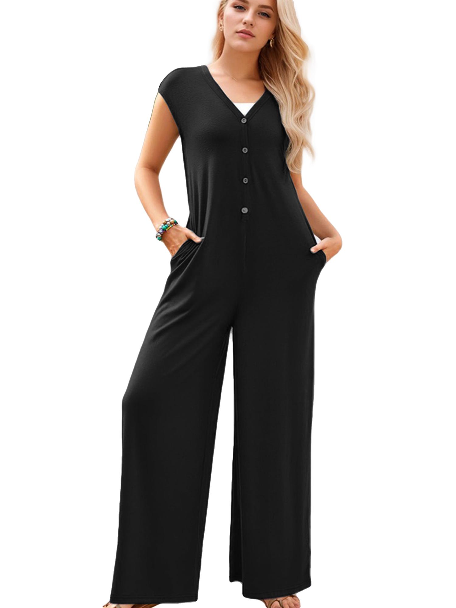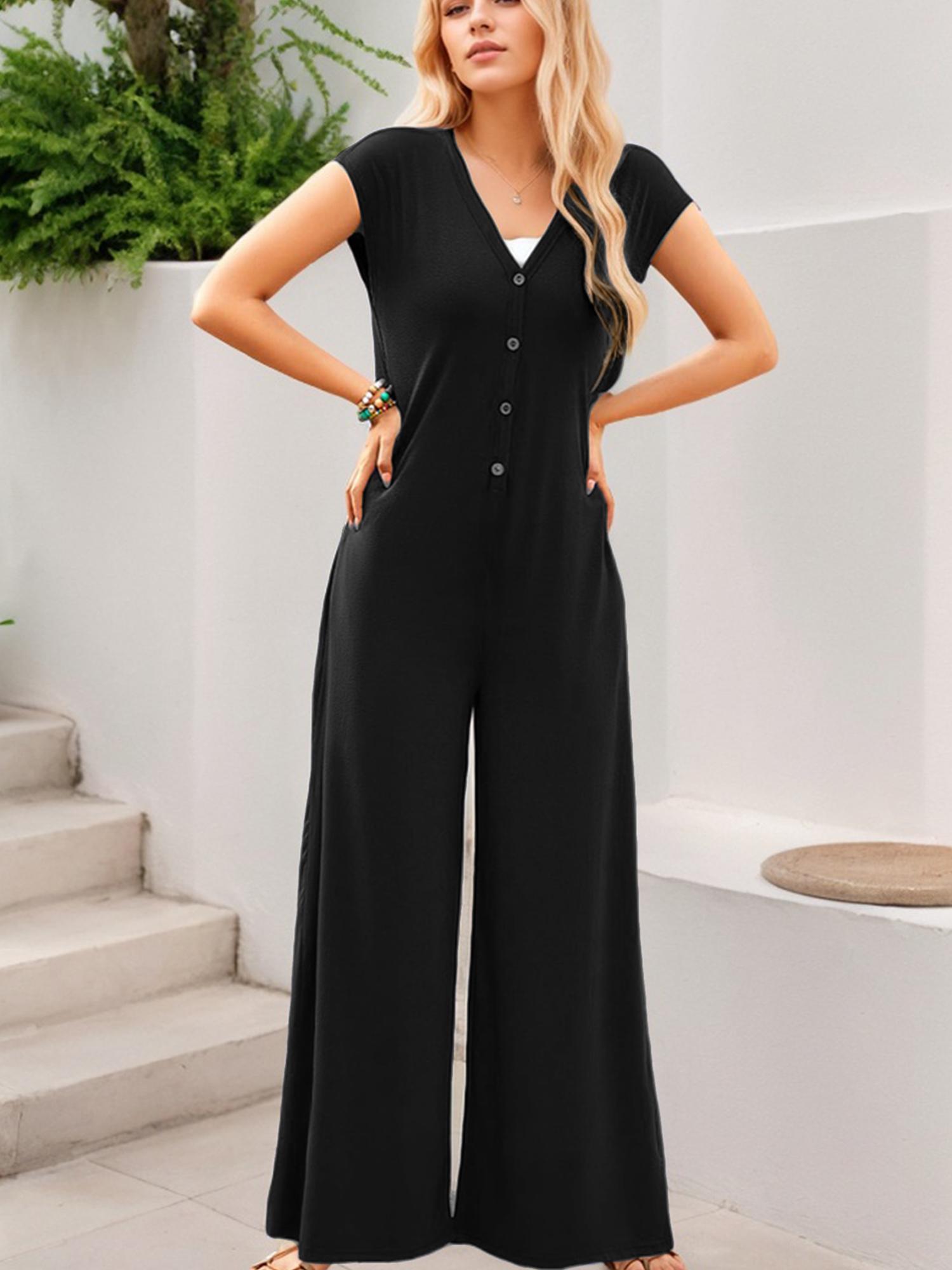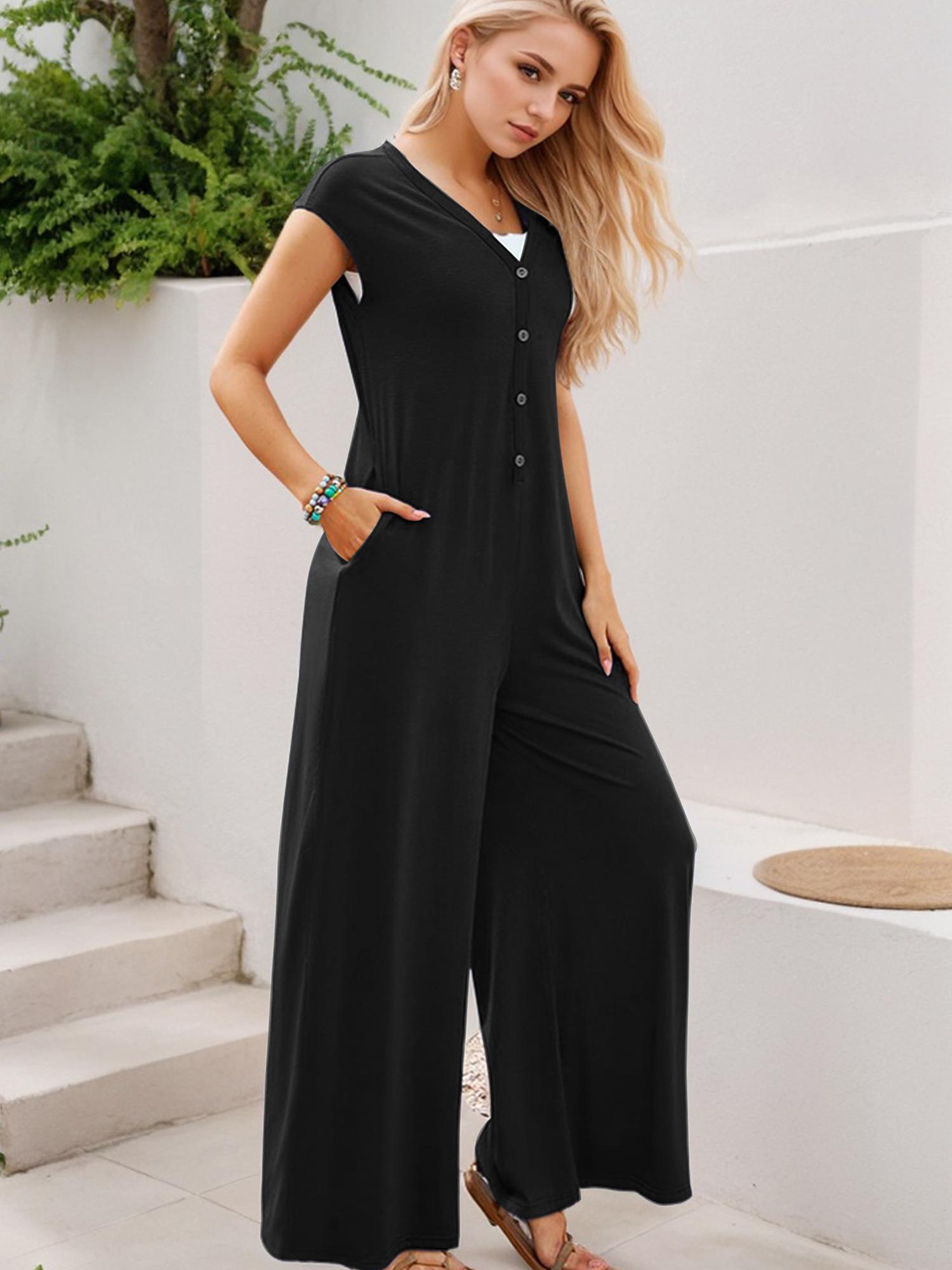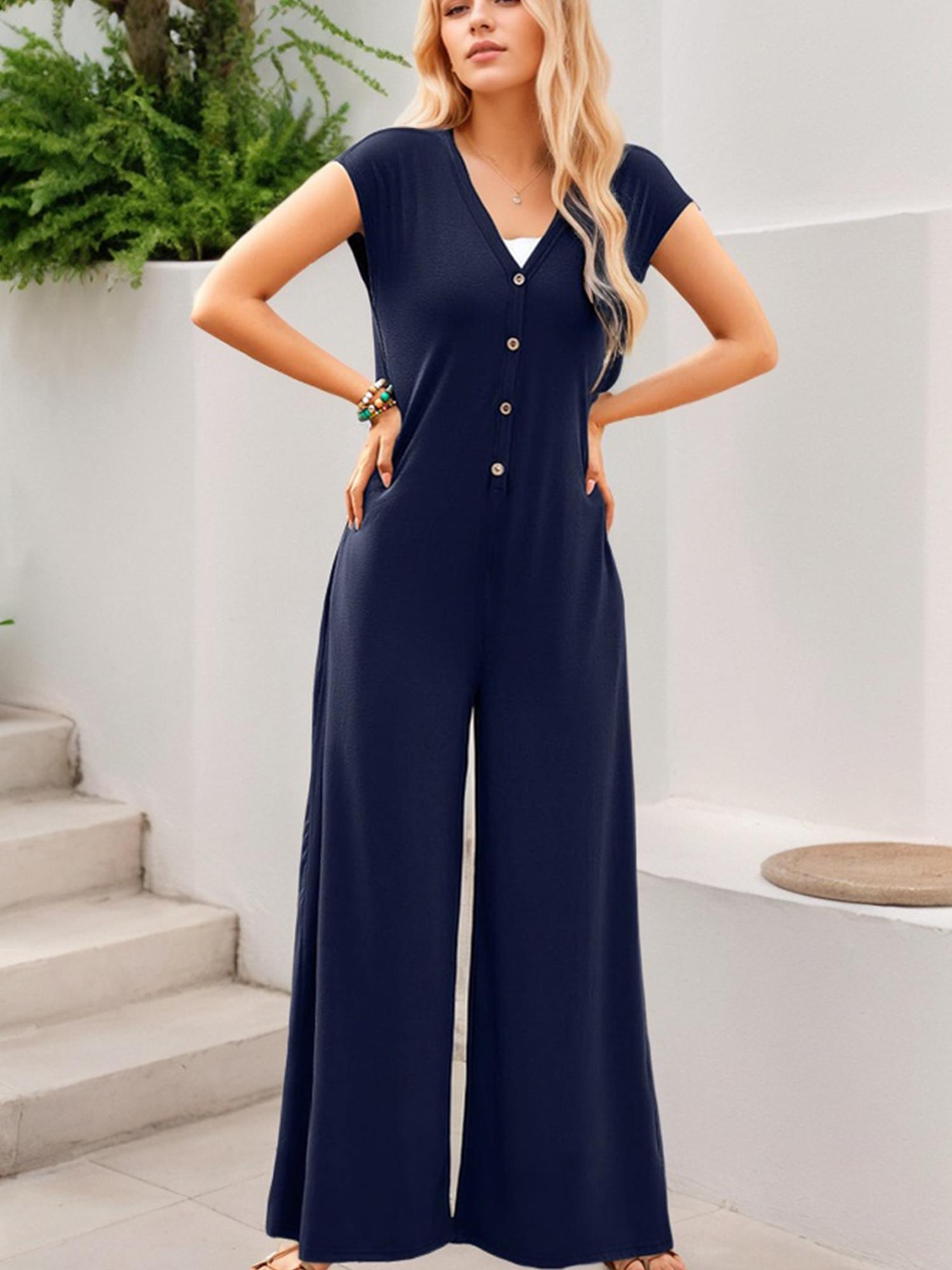 Women's Deep V Neck Cap Sleeve Jumpsuits Button Wide Leg Pants Rompers