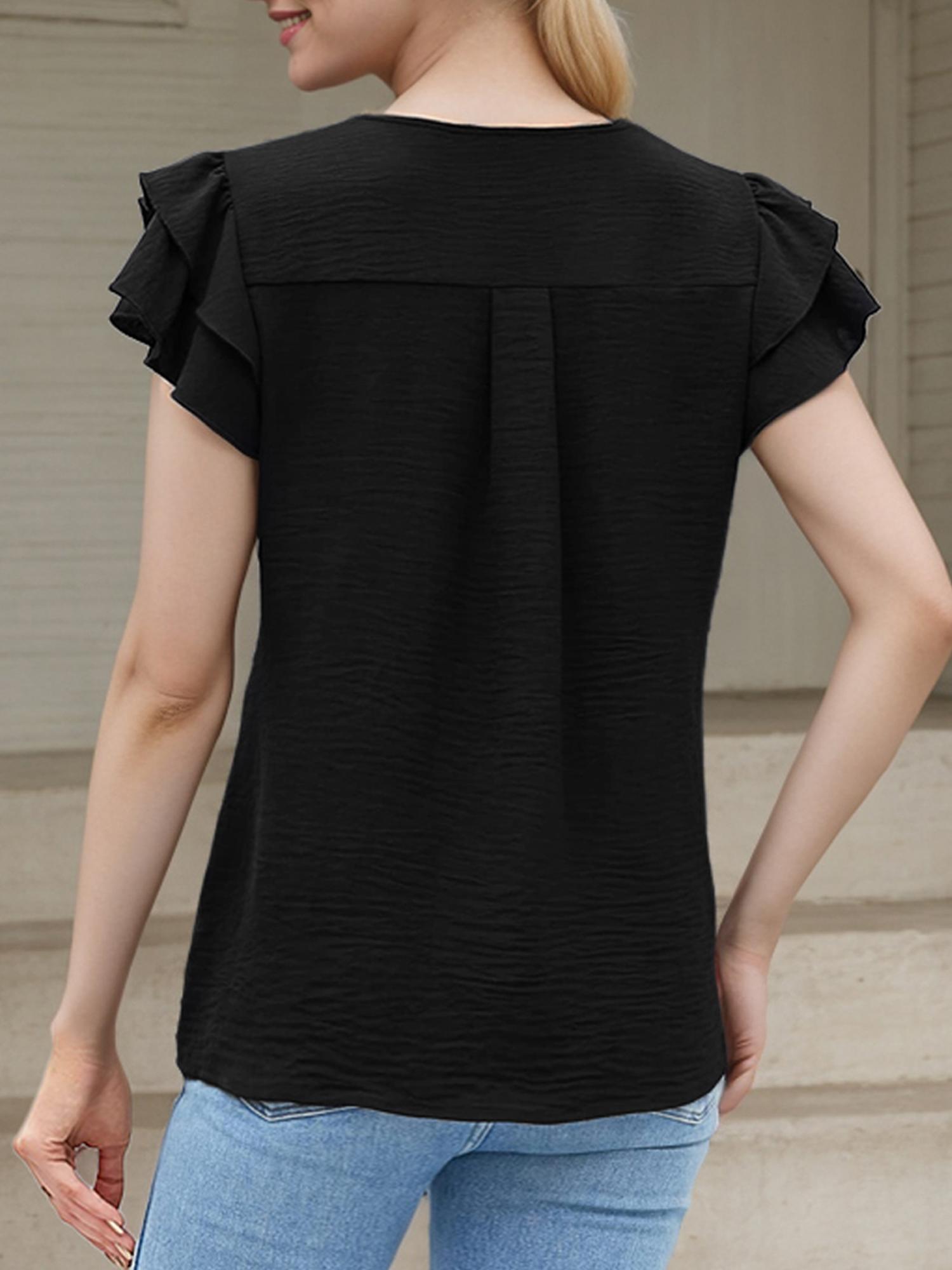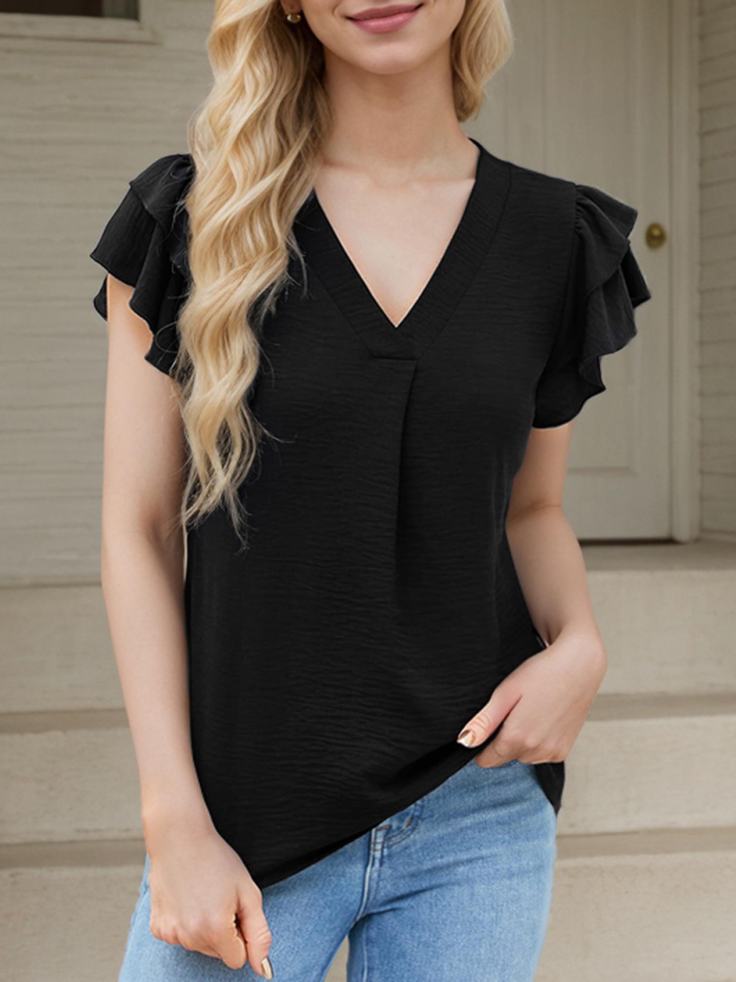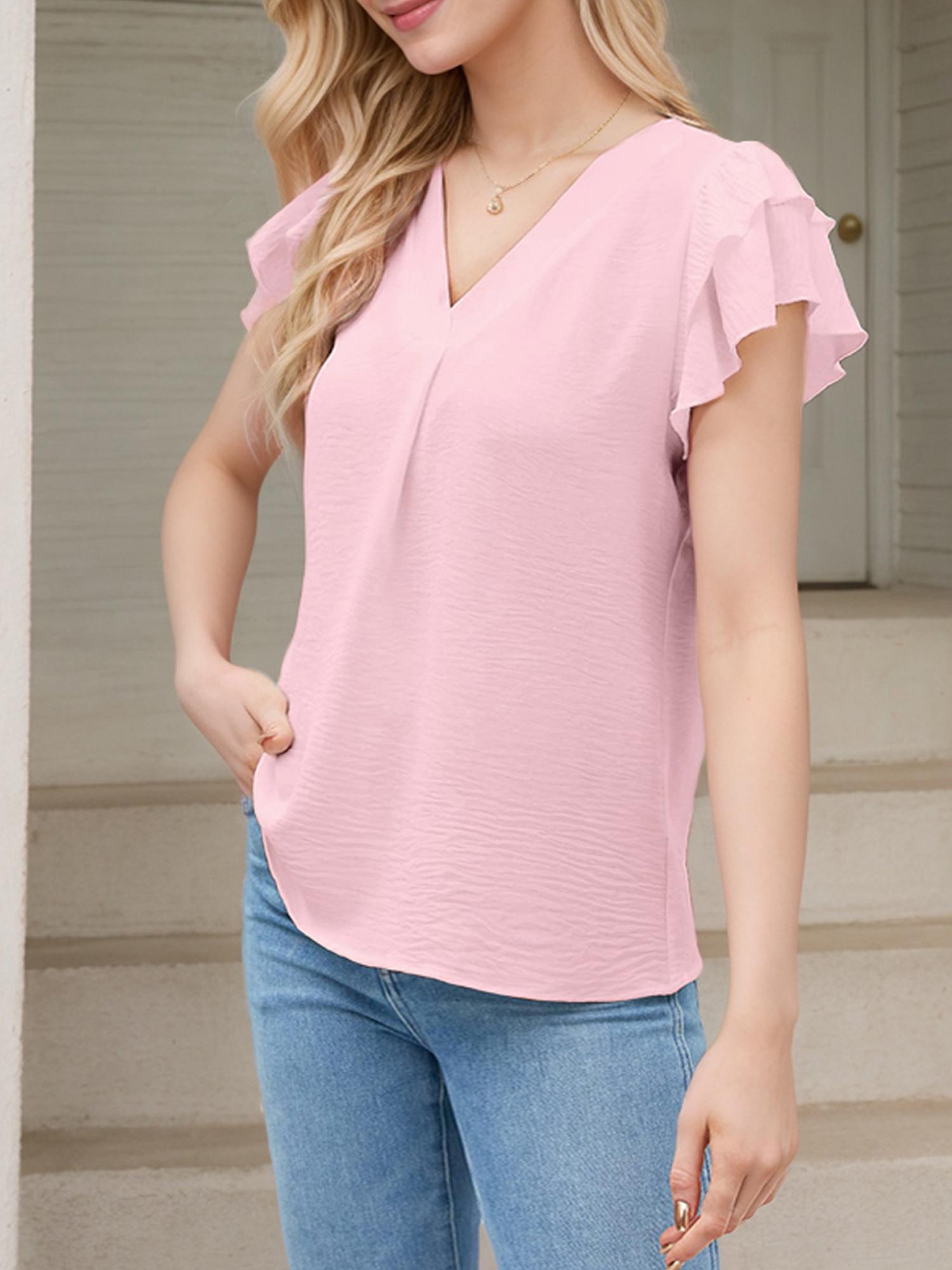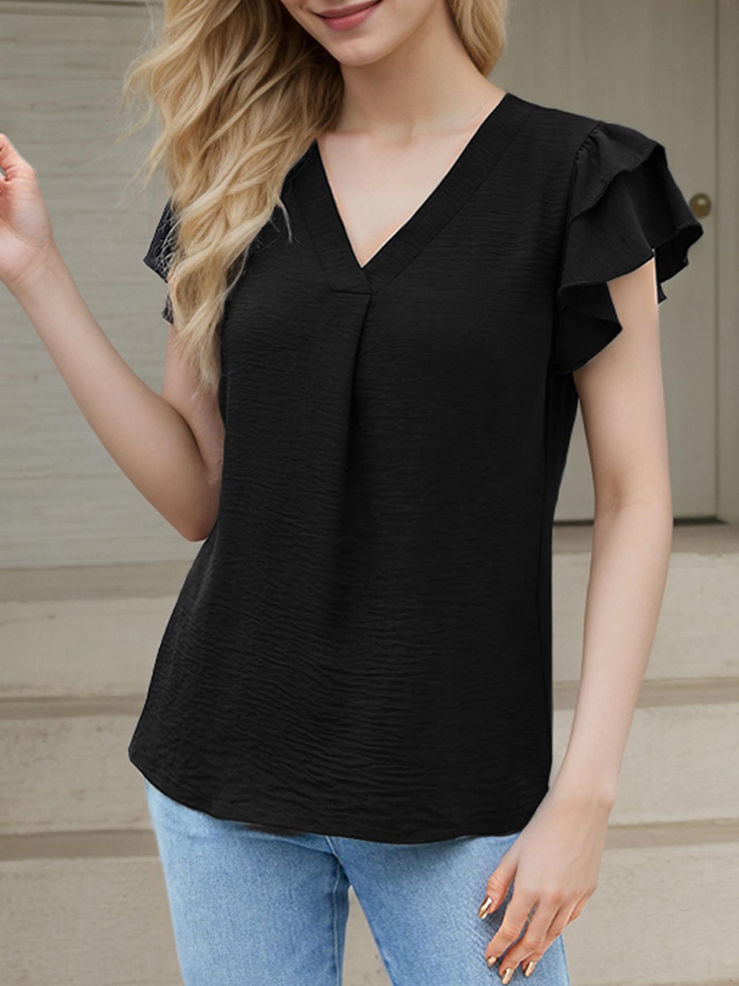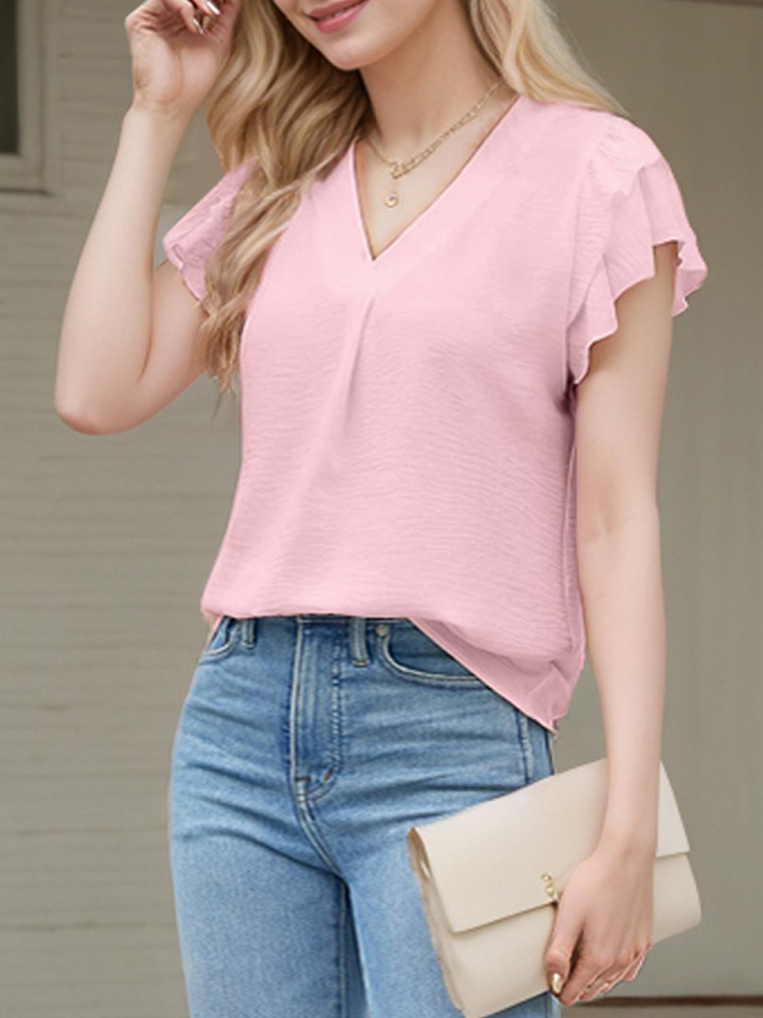 Classic V-neck, flutter short sleeves, pleats at the bust, and non-transparent fabric.