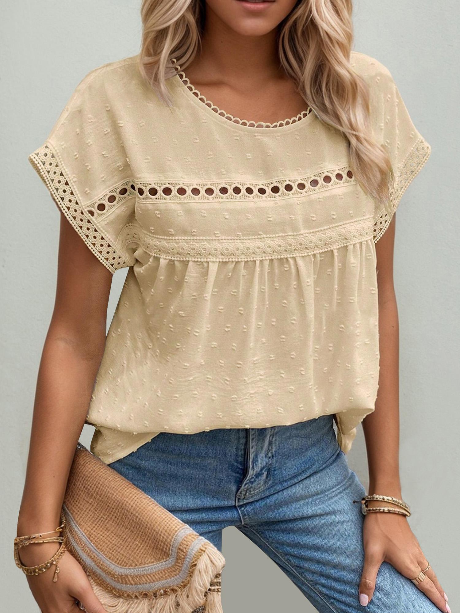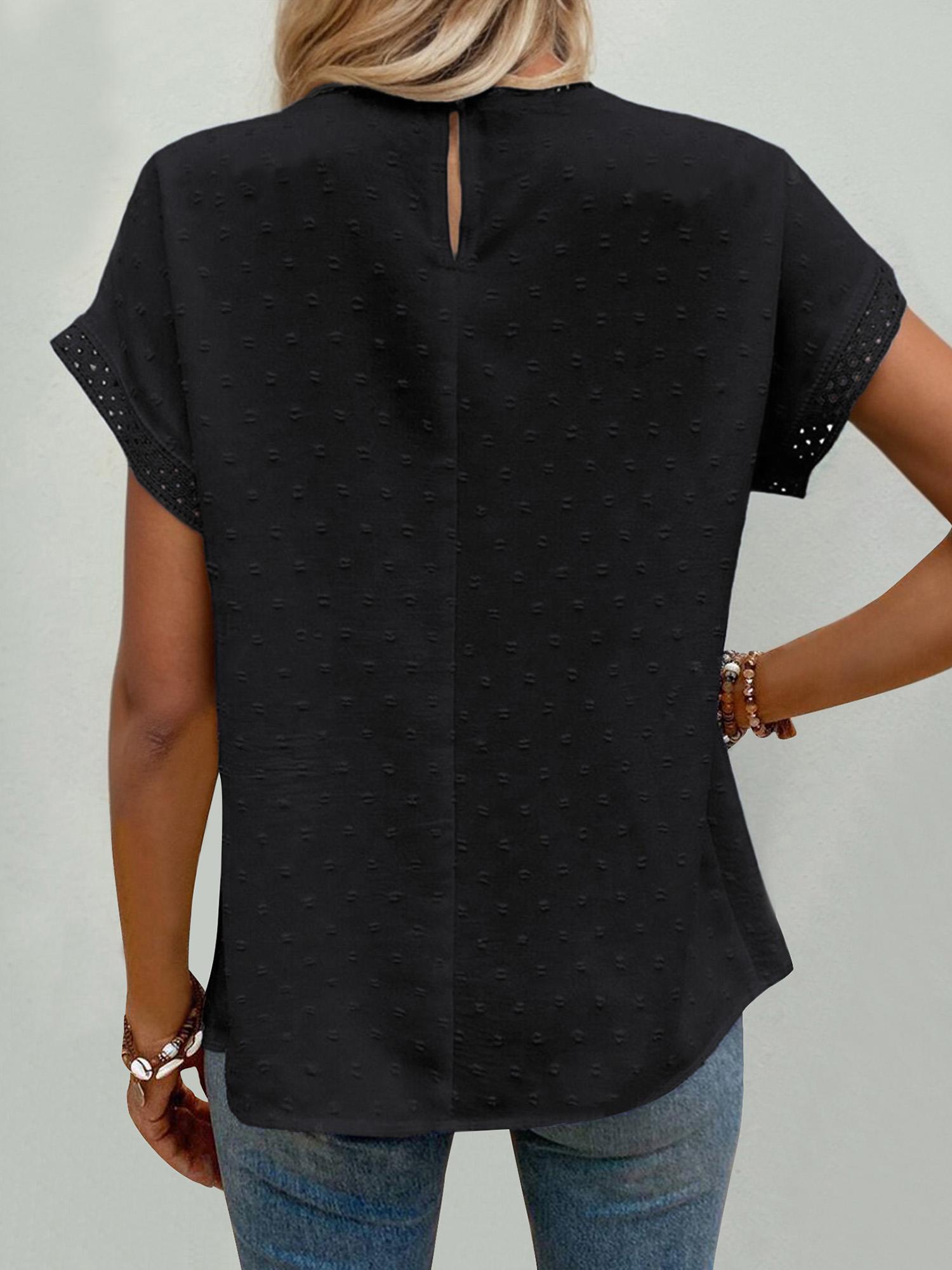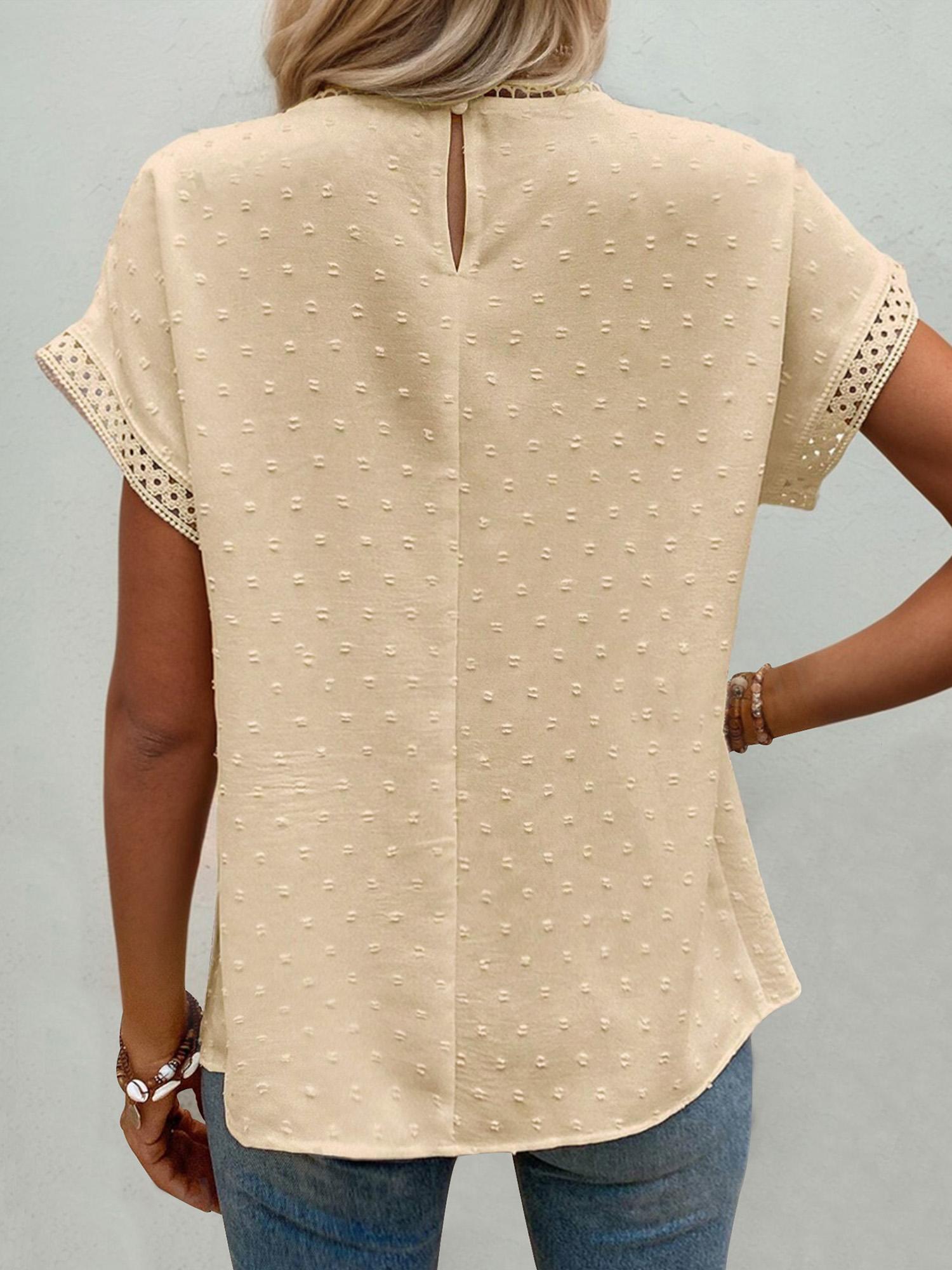 Women S wiss Dot Lace Round Neck Short Sleeve Blouse