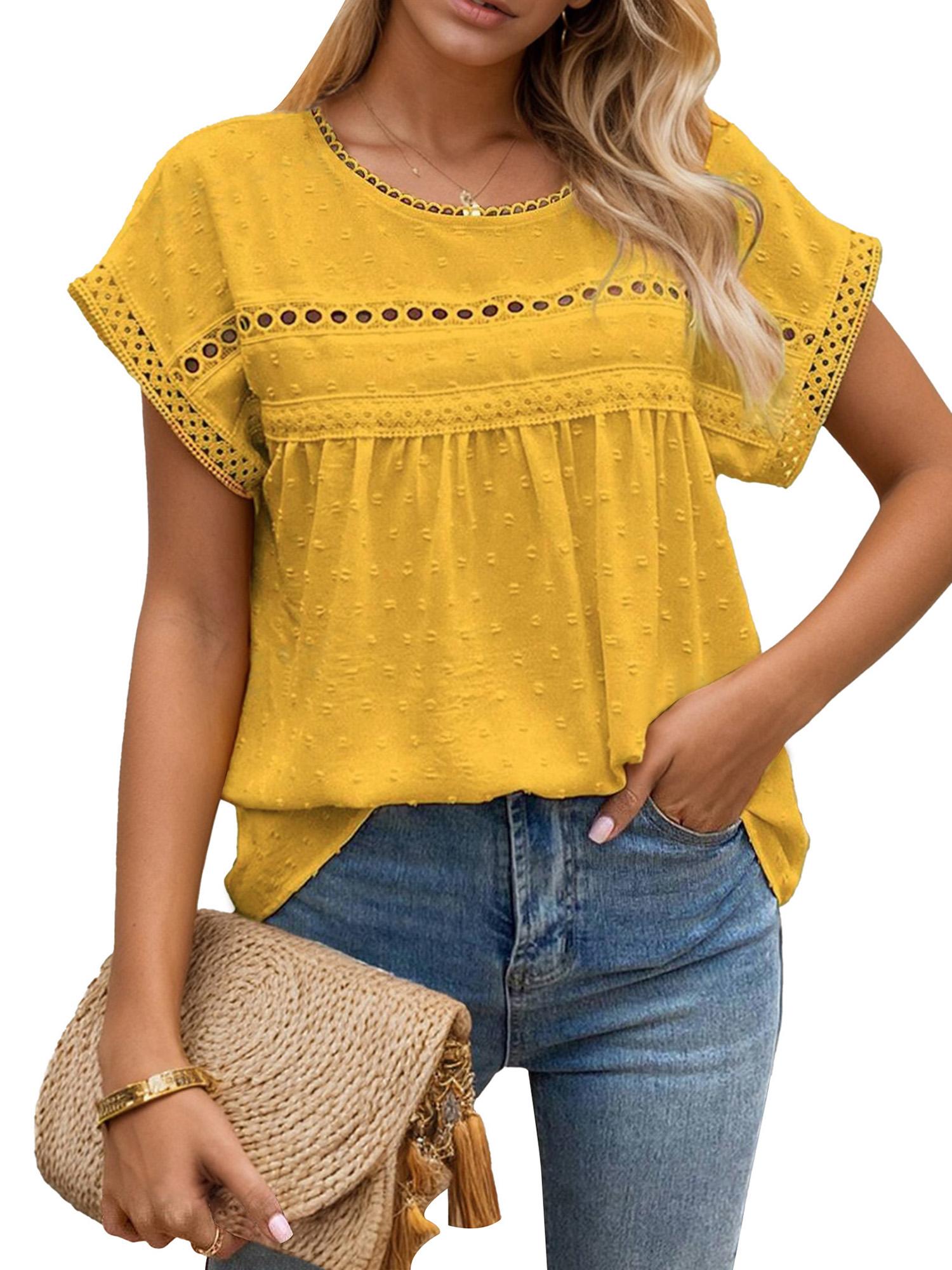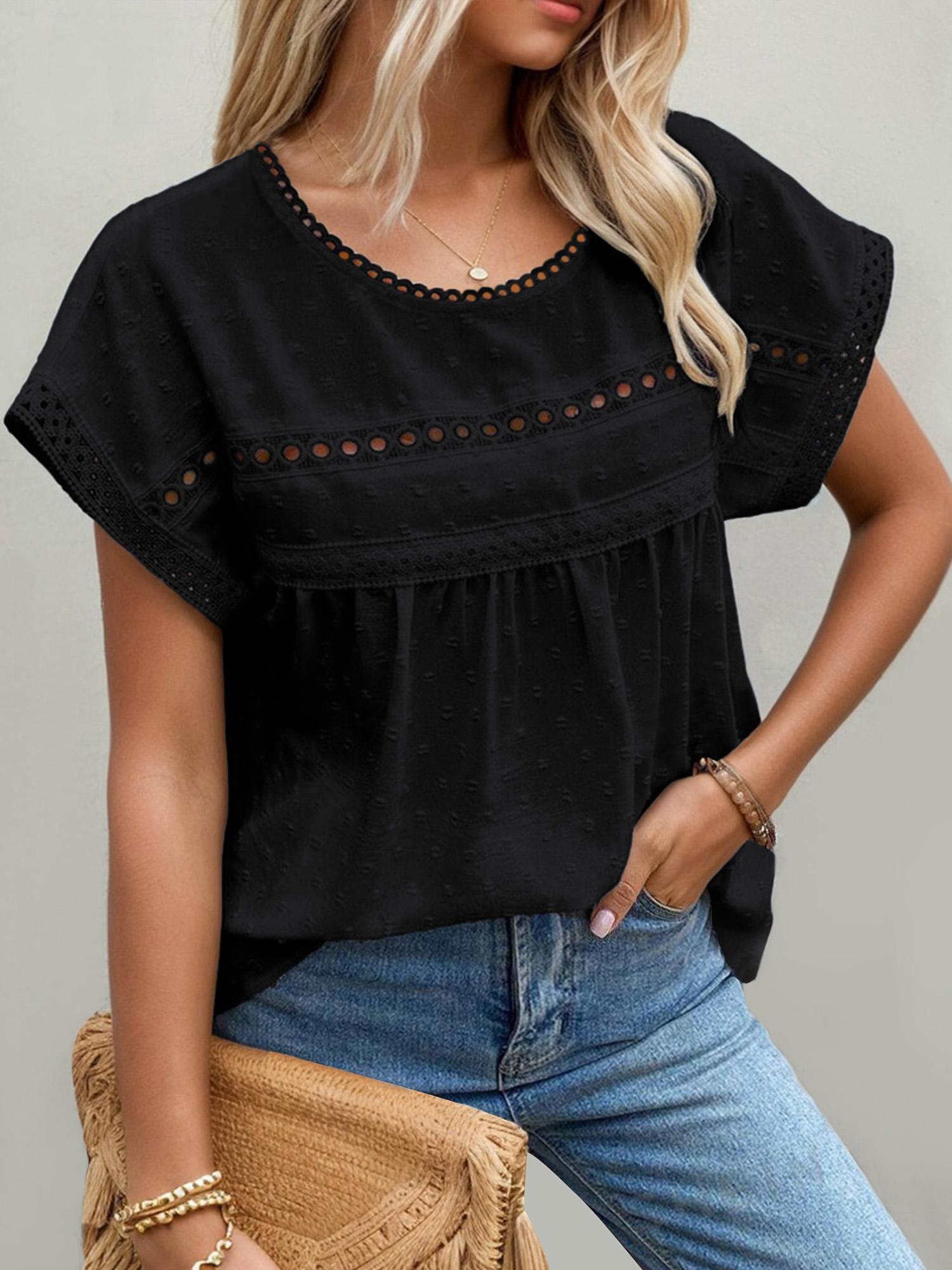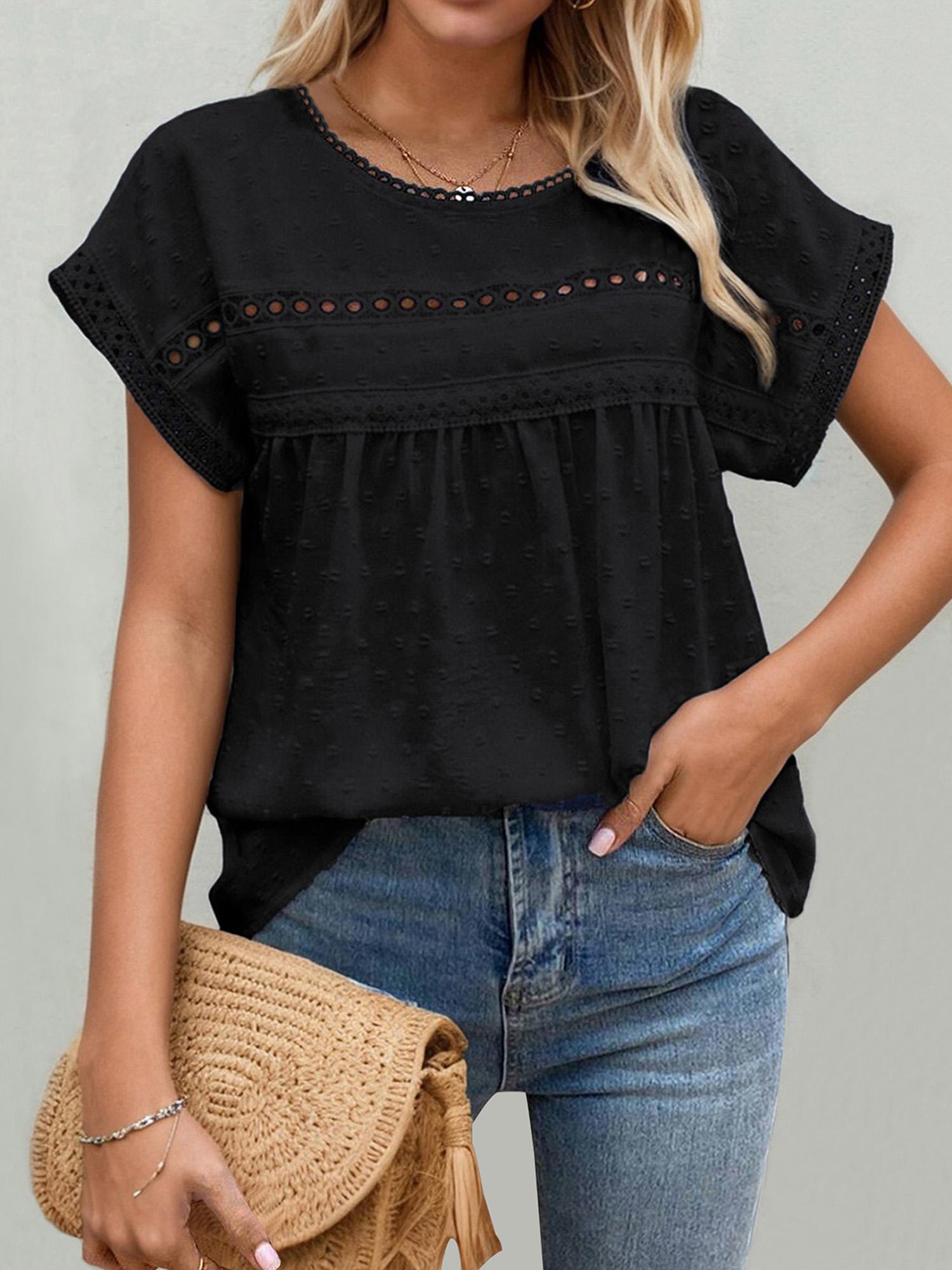 Women S wiss Dot Lace Round Neck Short Sleeve Blouse
