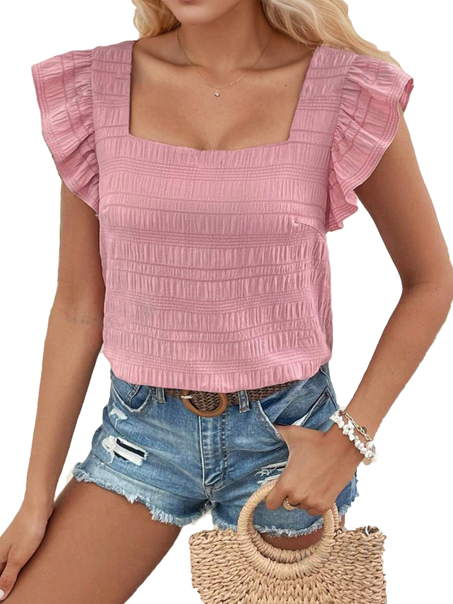 Women Solid Puff Sleeve Ruffle Trim Blouse Square Neck Top