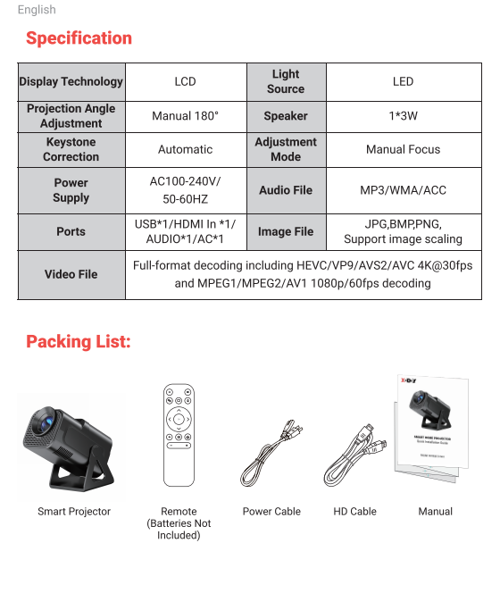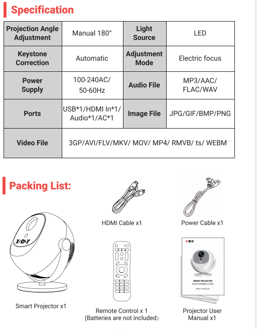 Specification: Support resolution: 4k, 1920 x 1080p, 1280 x 720p Native resolution: 1280 x 720p Brightness: 12000 lumens Contrast ratio: 8000:1 Projection Size: 40-120 inches Lamp Life: 50,000 hours Connectivity: HDMI, USB Wireless Connectivity: WiFi 6, Bluetooth 5.0 Aspect Ratio: 16:9, 4:3 Package: 1 x Projector 1 x Remote Control 1 x Power Cable 1 x HDMI Cable 1 x User Manual |