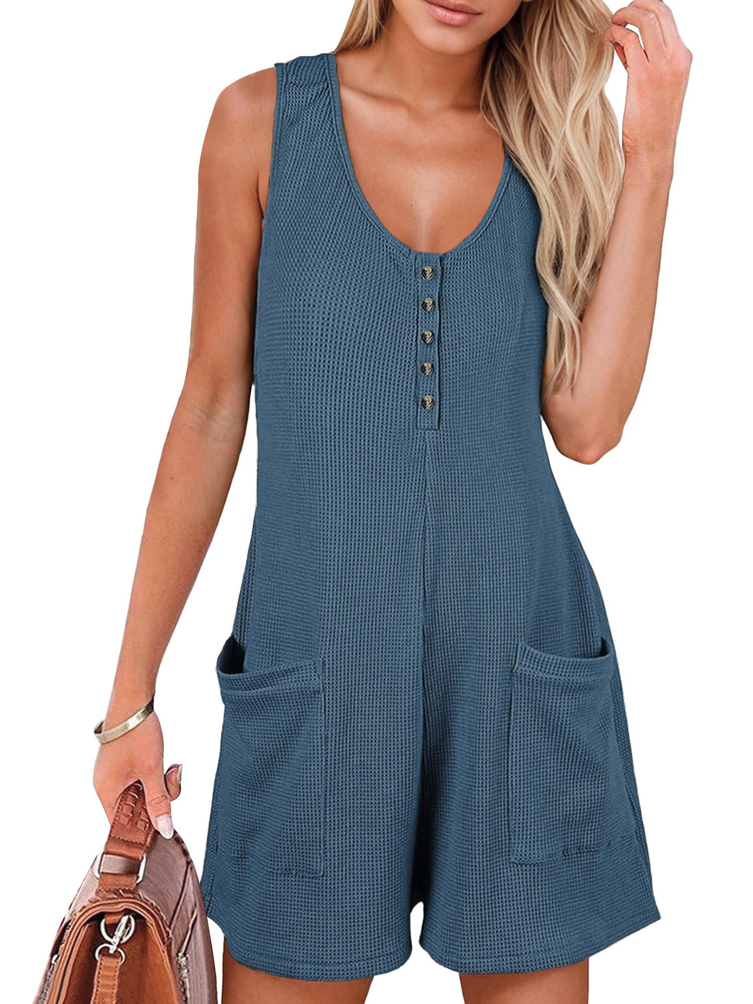 Womens Jumpsuits Casual Waffle Button Front Sleeveless Rompers with Pockets