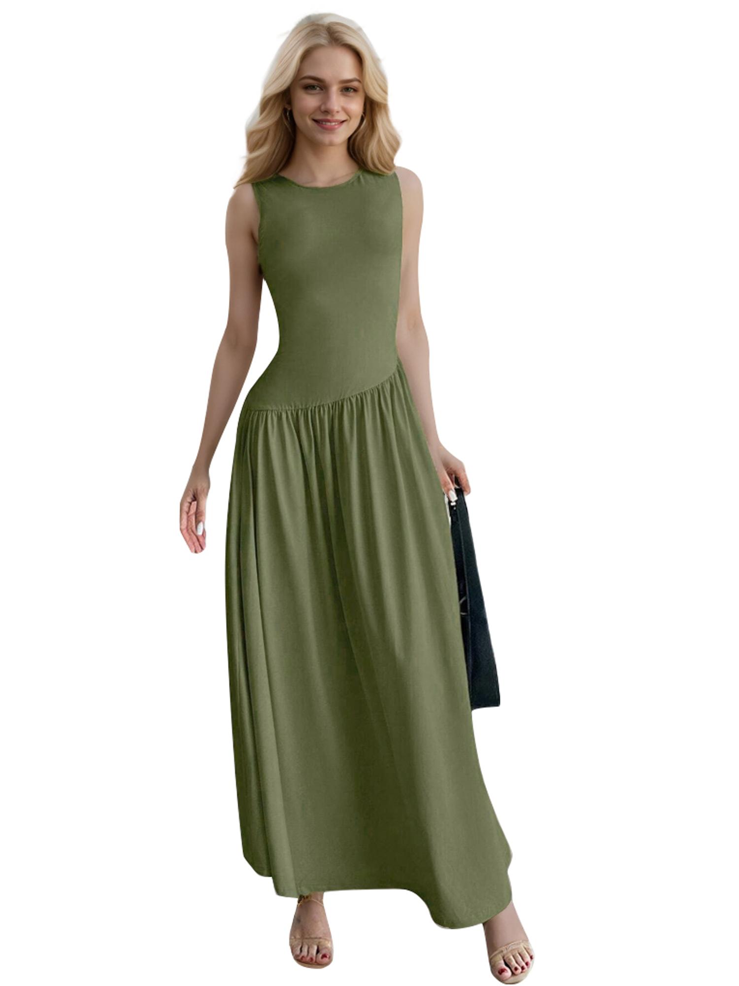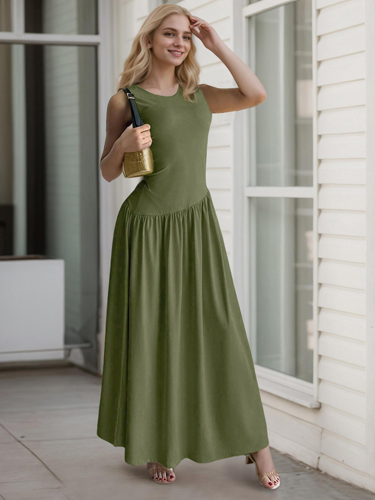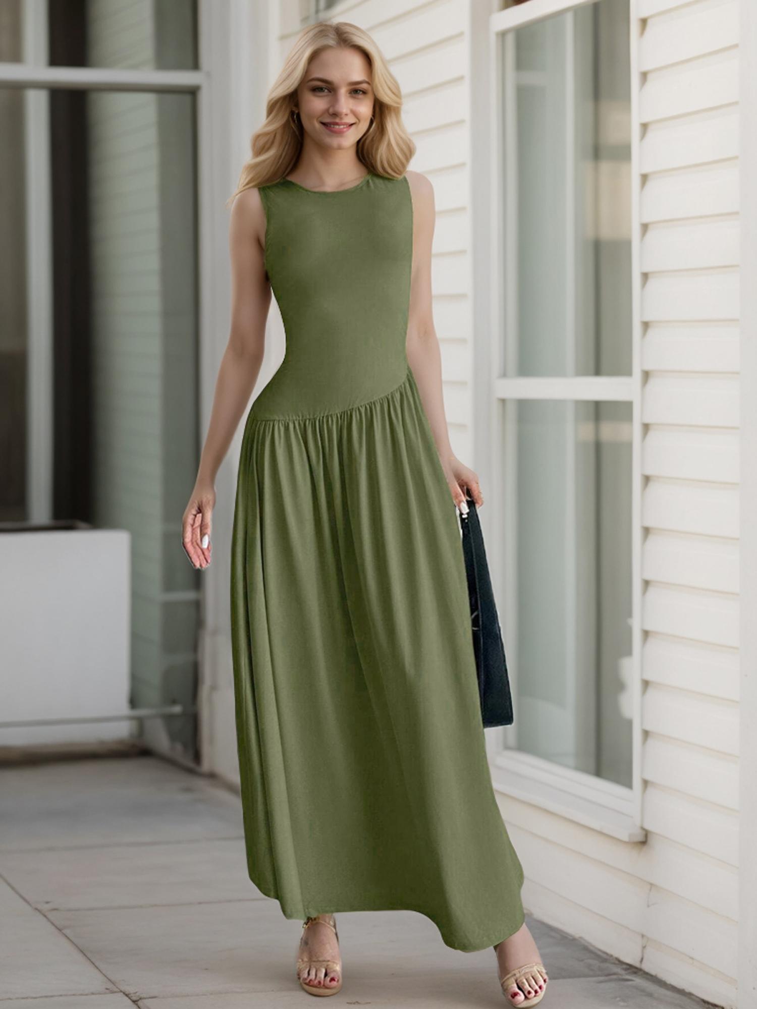 Women's Solid Color Round Neck Sleeveless Ruched Waist Long Dress
