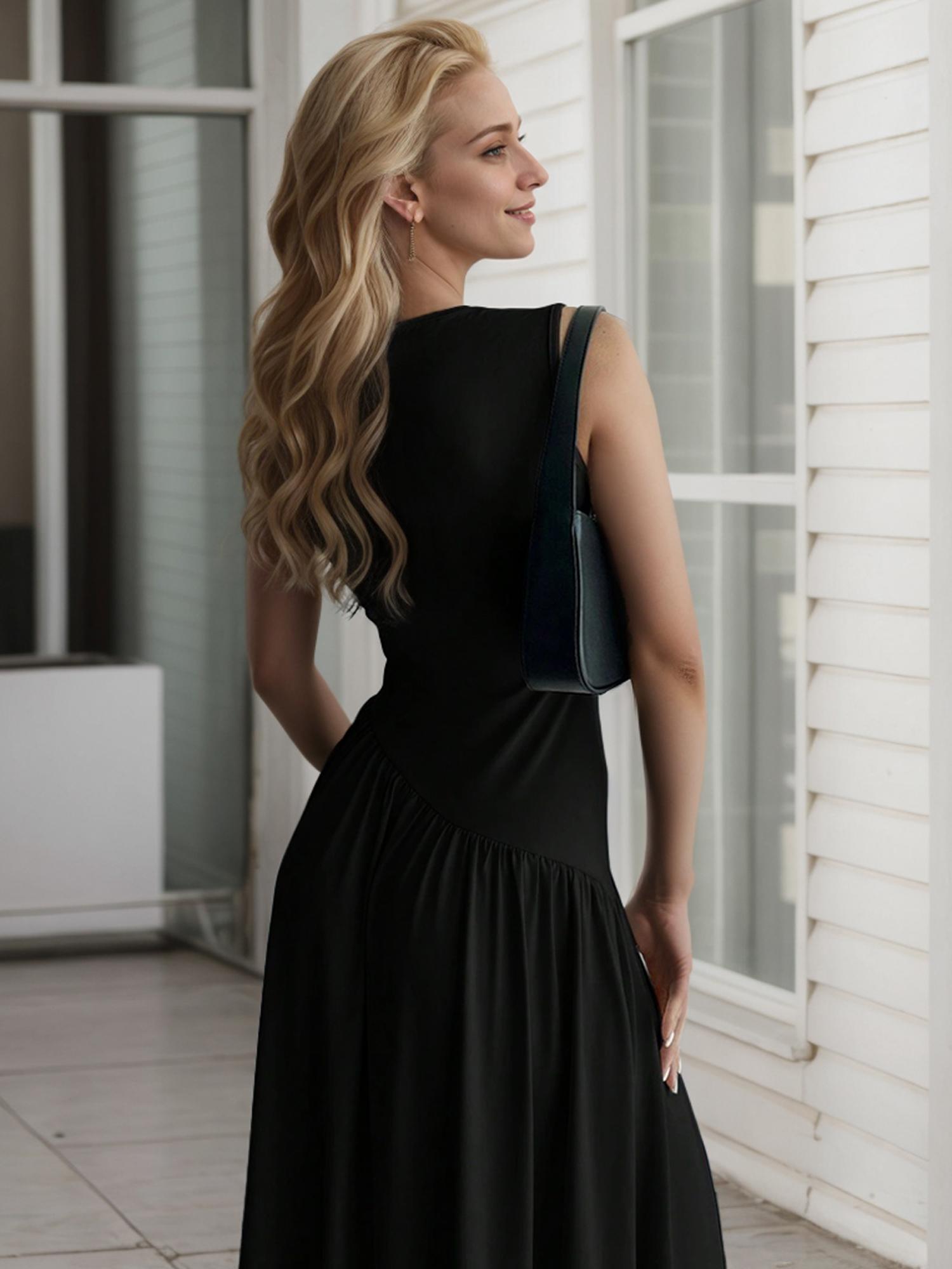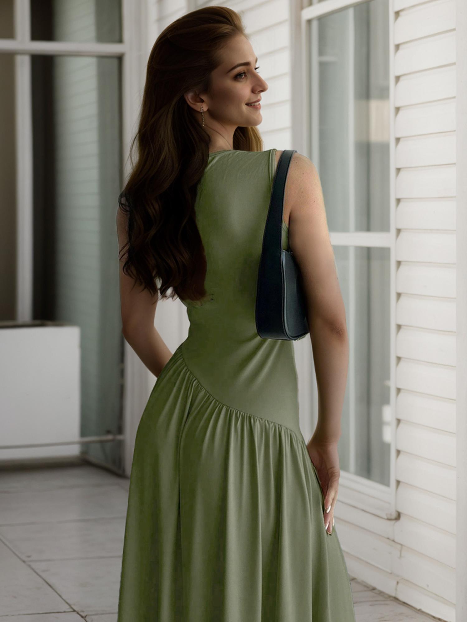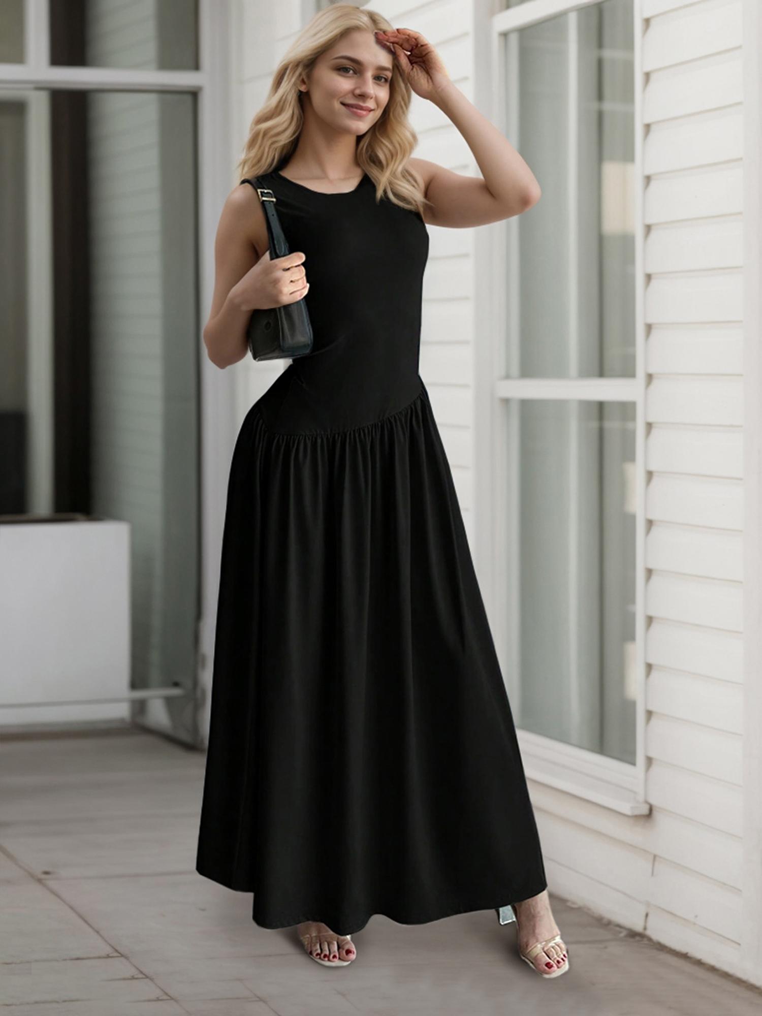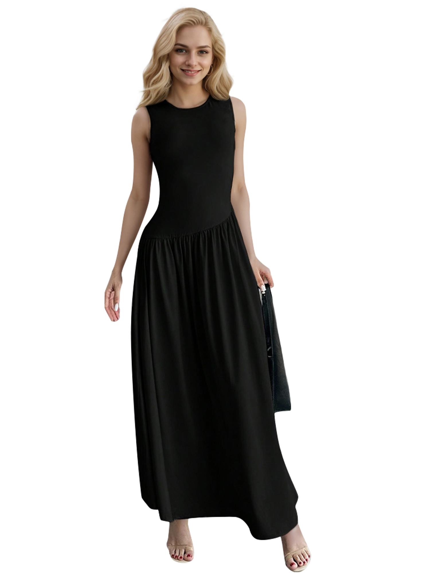 Women's Solid Color Round Neck Sleeveless Ruched Waist Long Dress