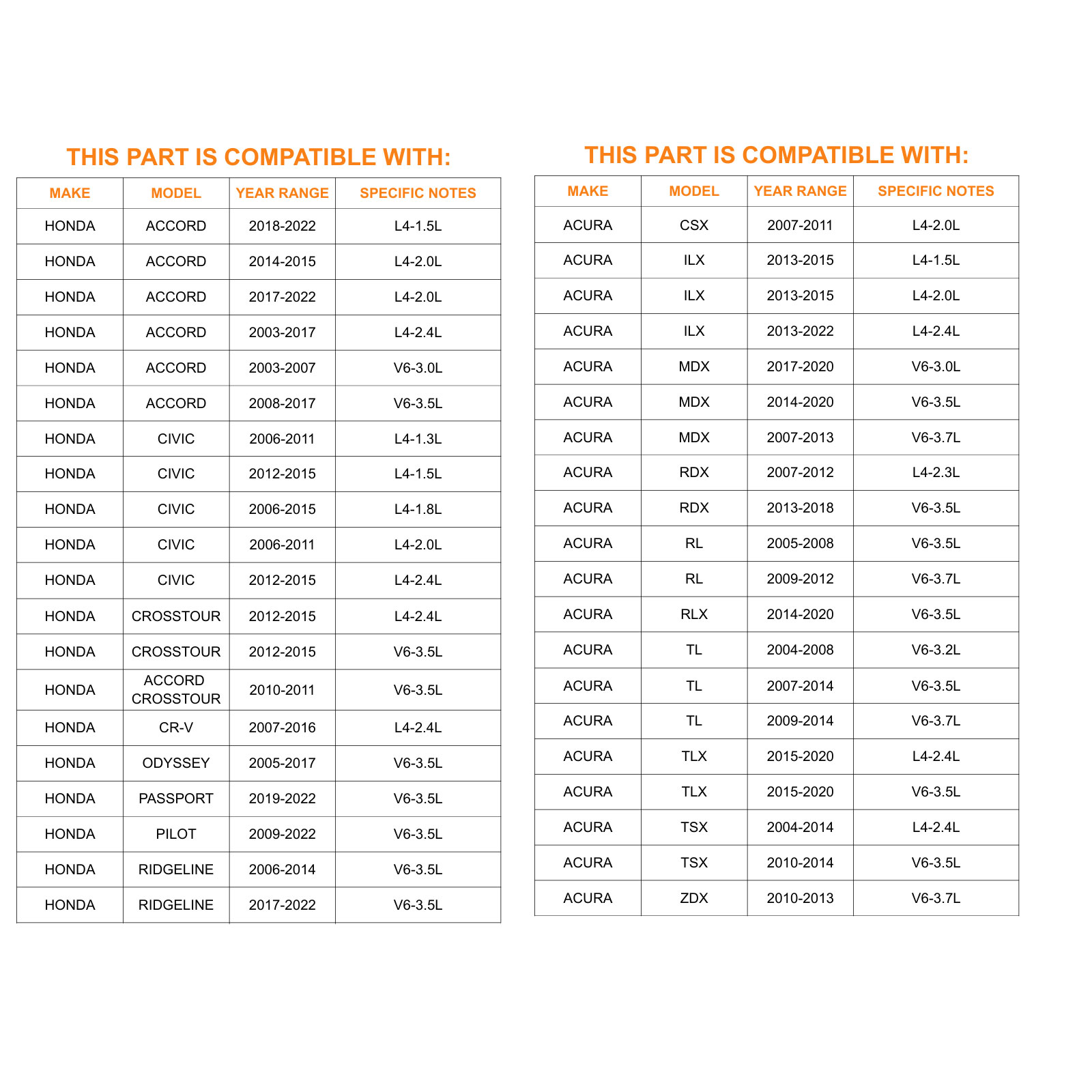 | ACURA | TSX | 2010-2014 | V6 3.5L |
