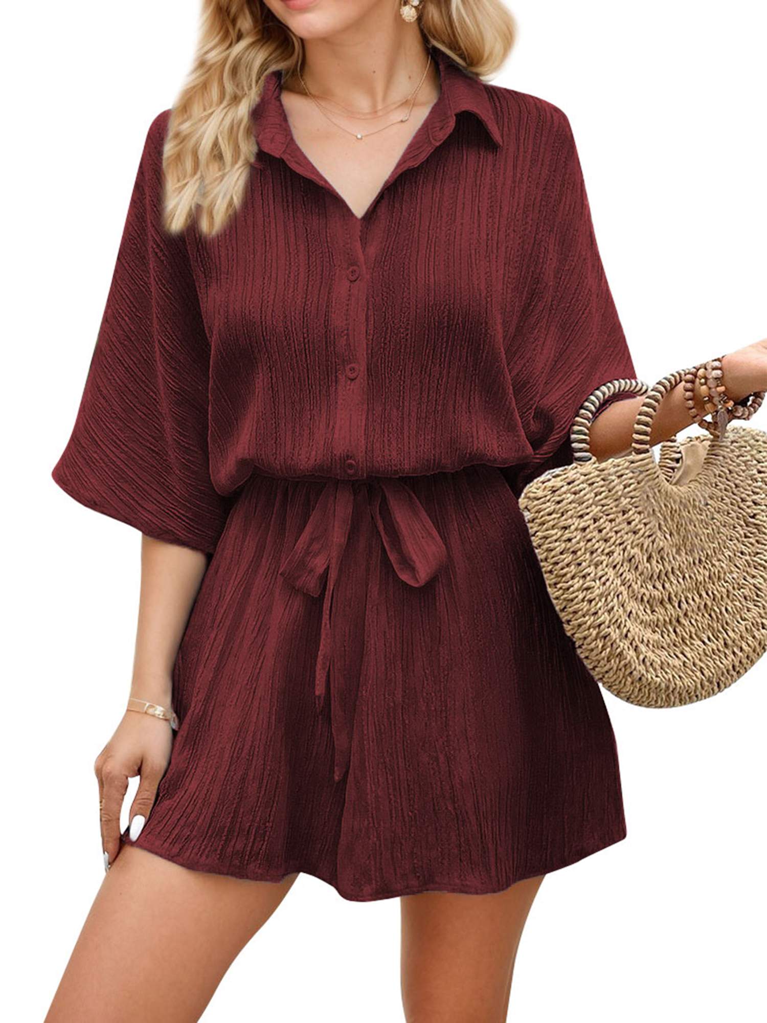 Women's Solid Color Knot Casual Shirt Collar Short Sleeve Jumpsuit