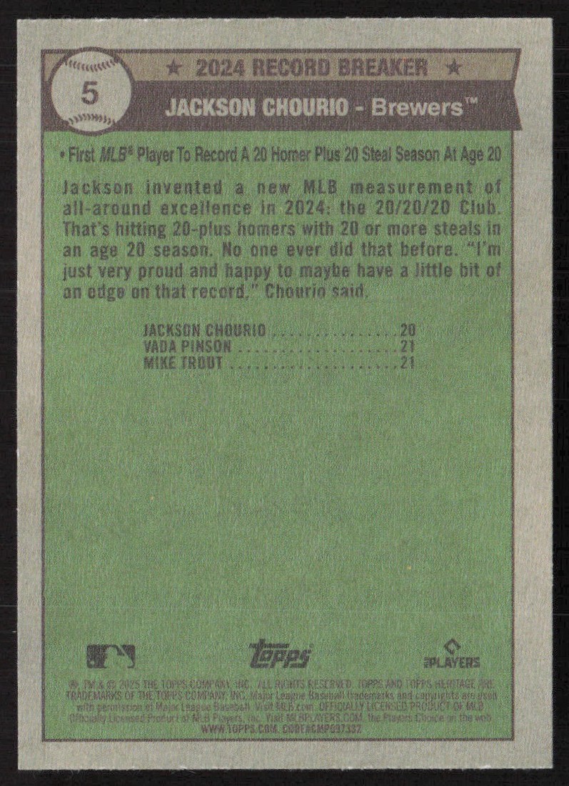 | 2025 24' Record Breaker Base Jackson Chourio Milwaukee Brewers #5 | ||||||||||||||||||