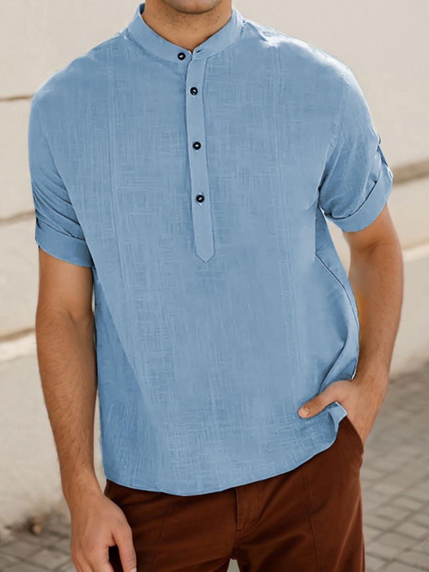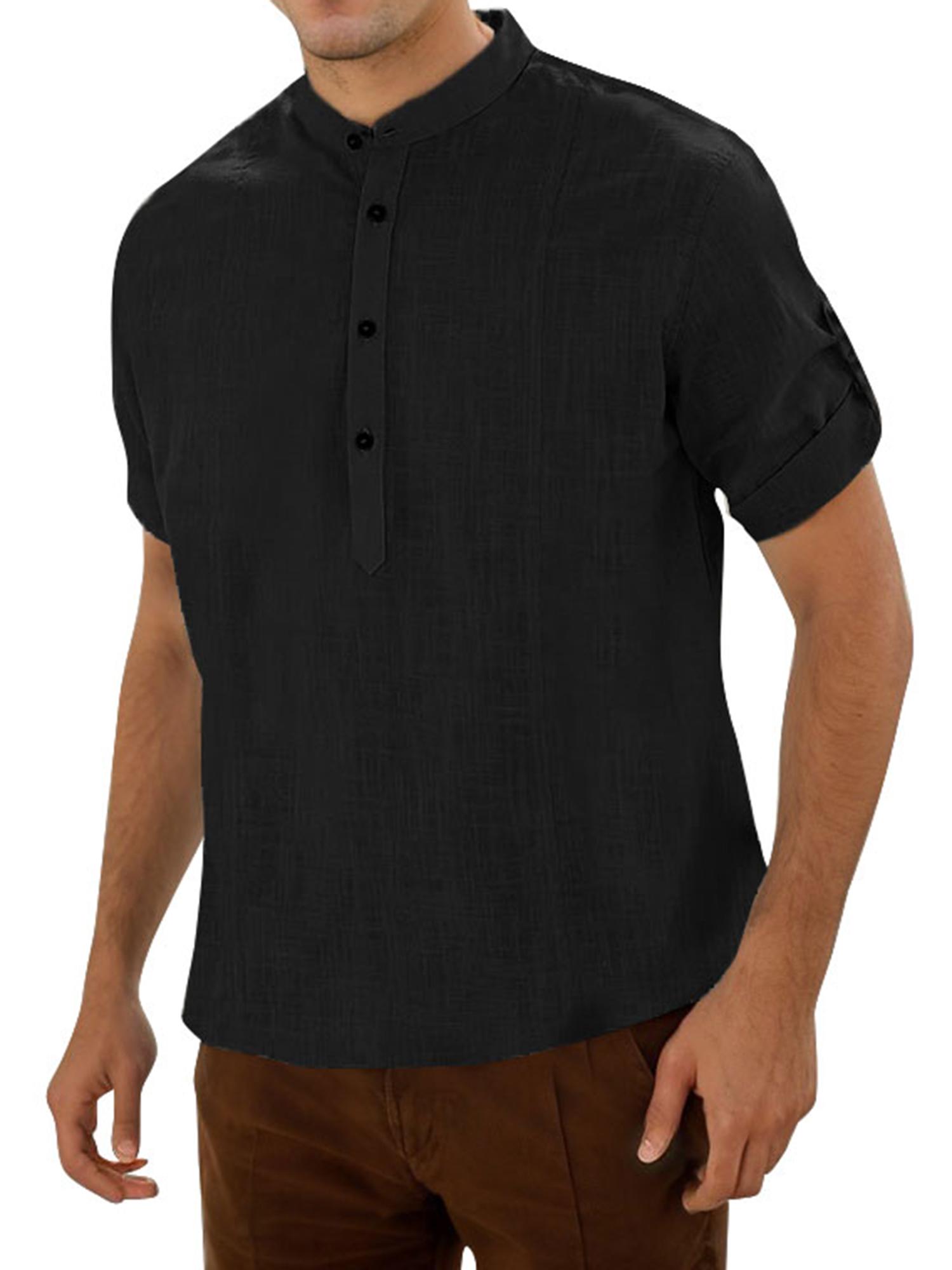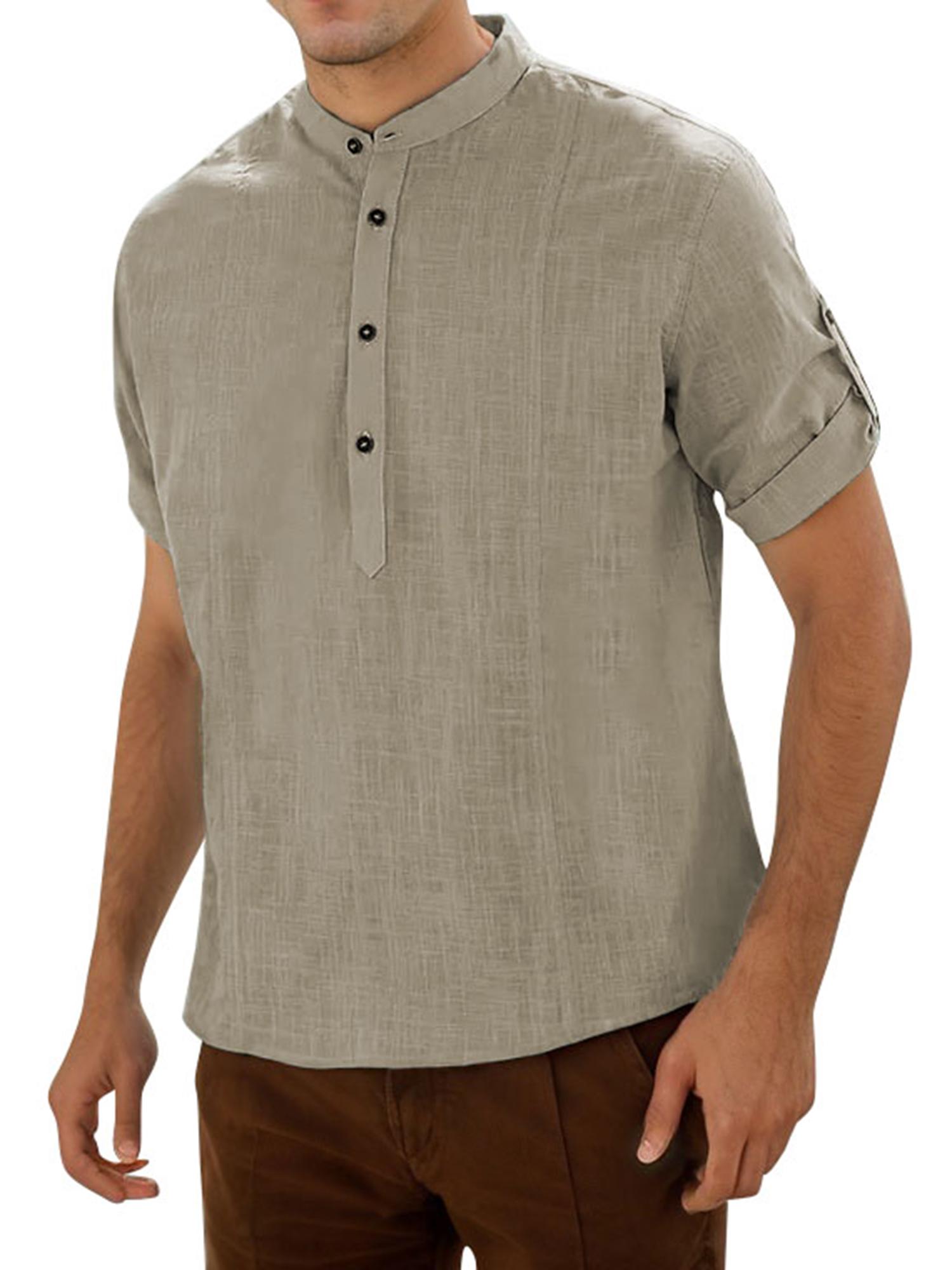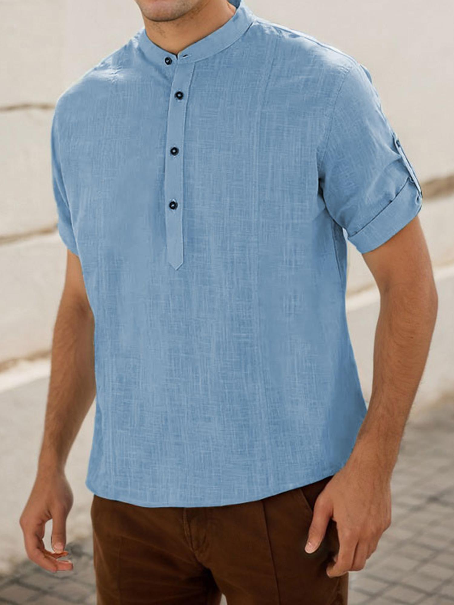 Men's Casual Cotton Short Sleeve Shirt Regular Fit Stand Collar Shirts