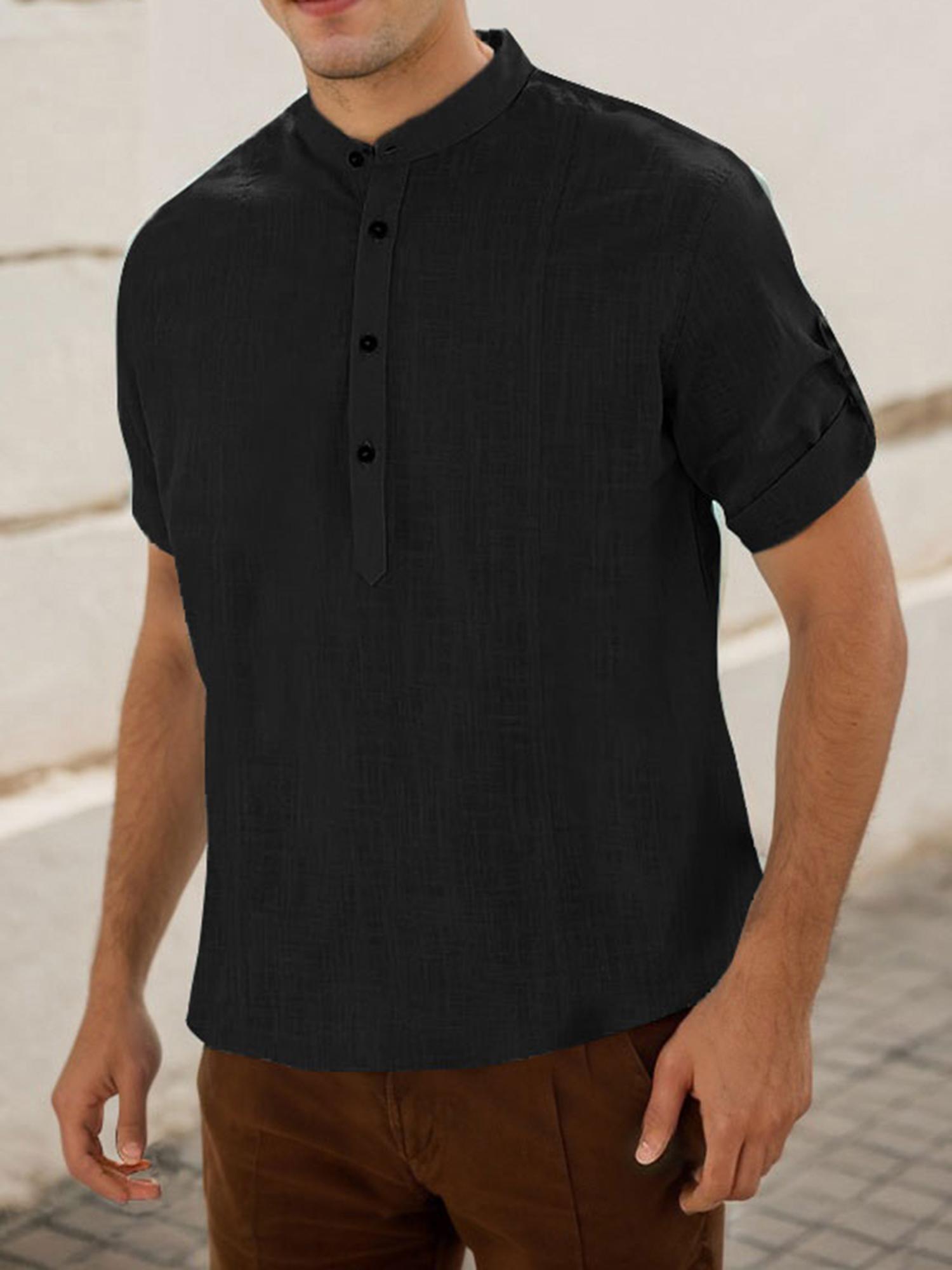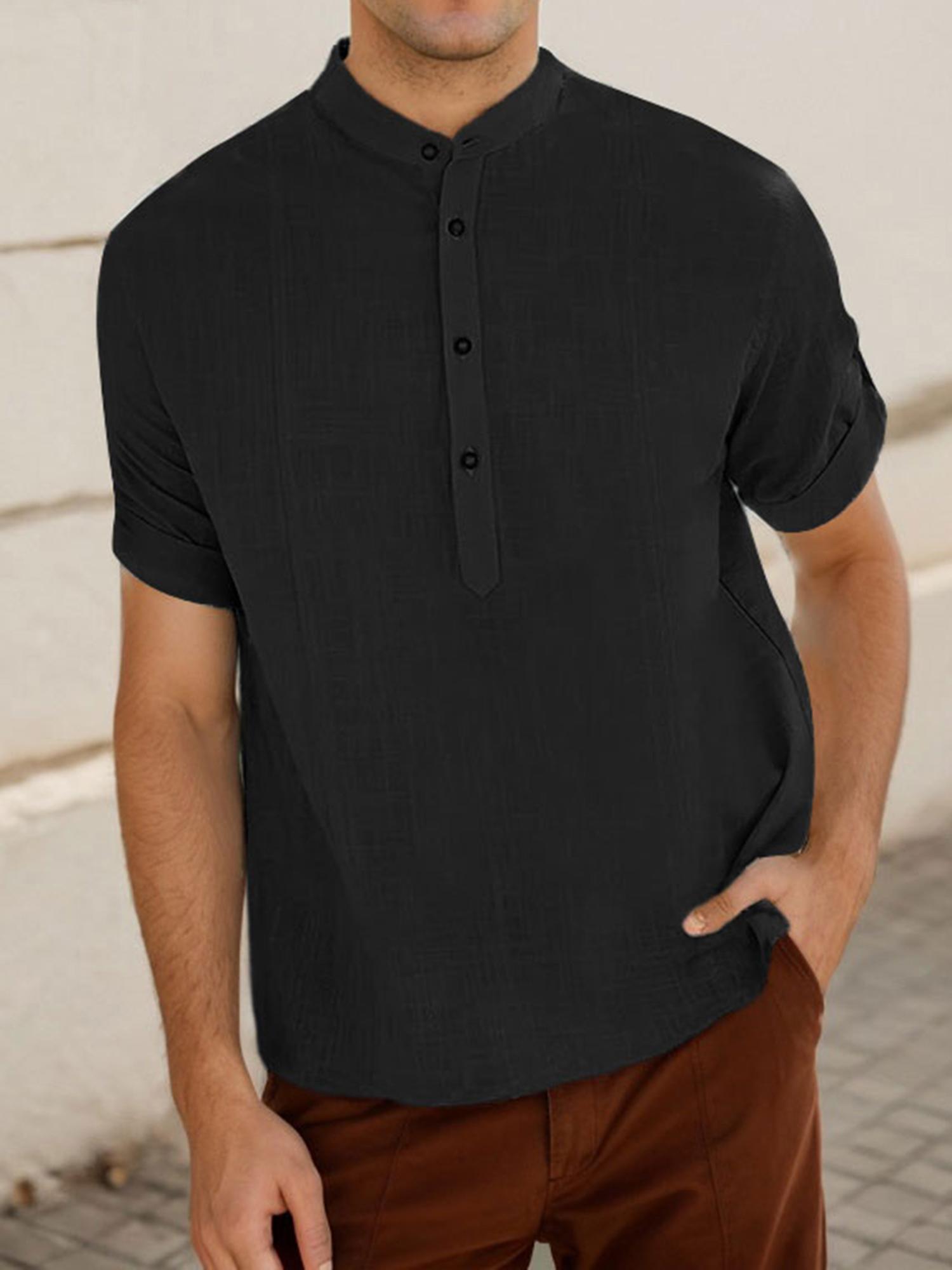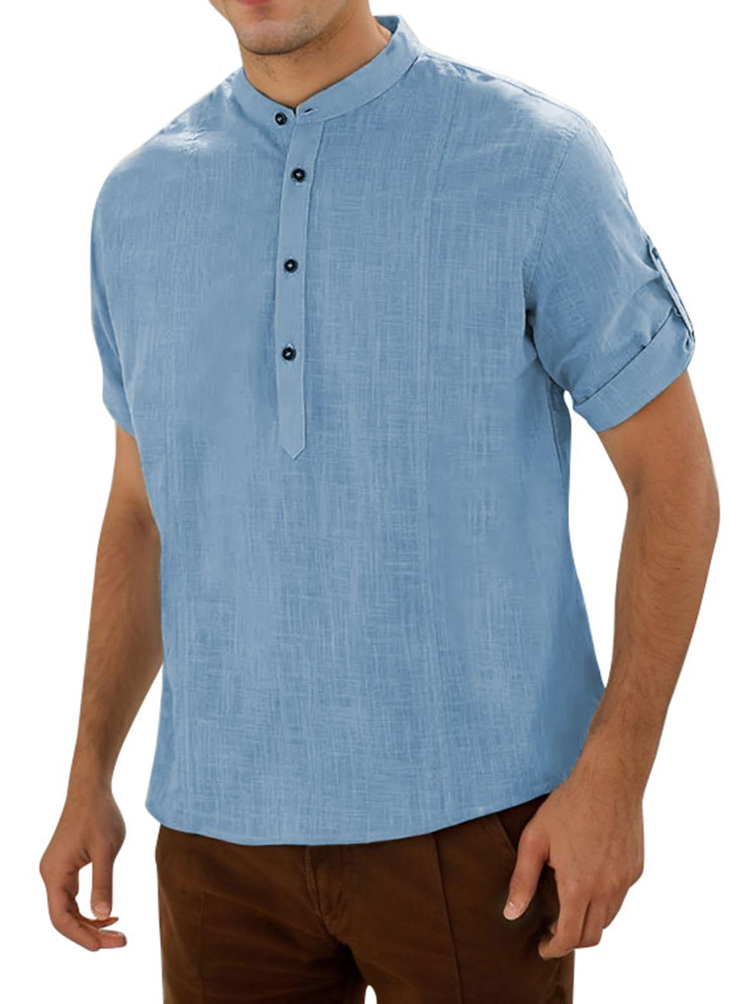 Men's Casual Cotton Short Sleeve Shirt Regular Fit Stand Collar Shirts