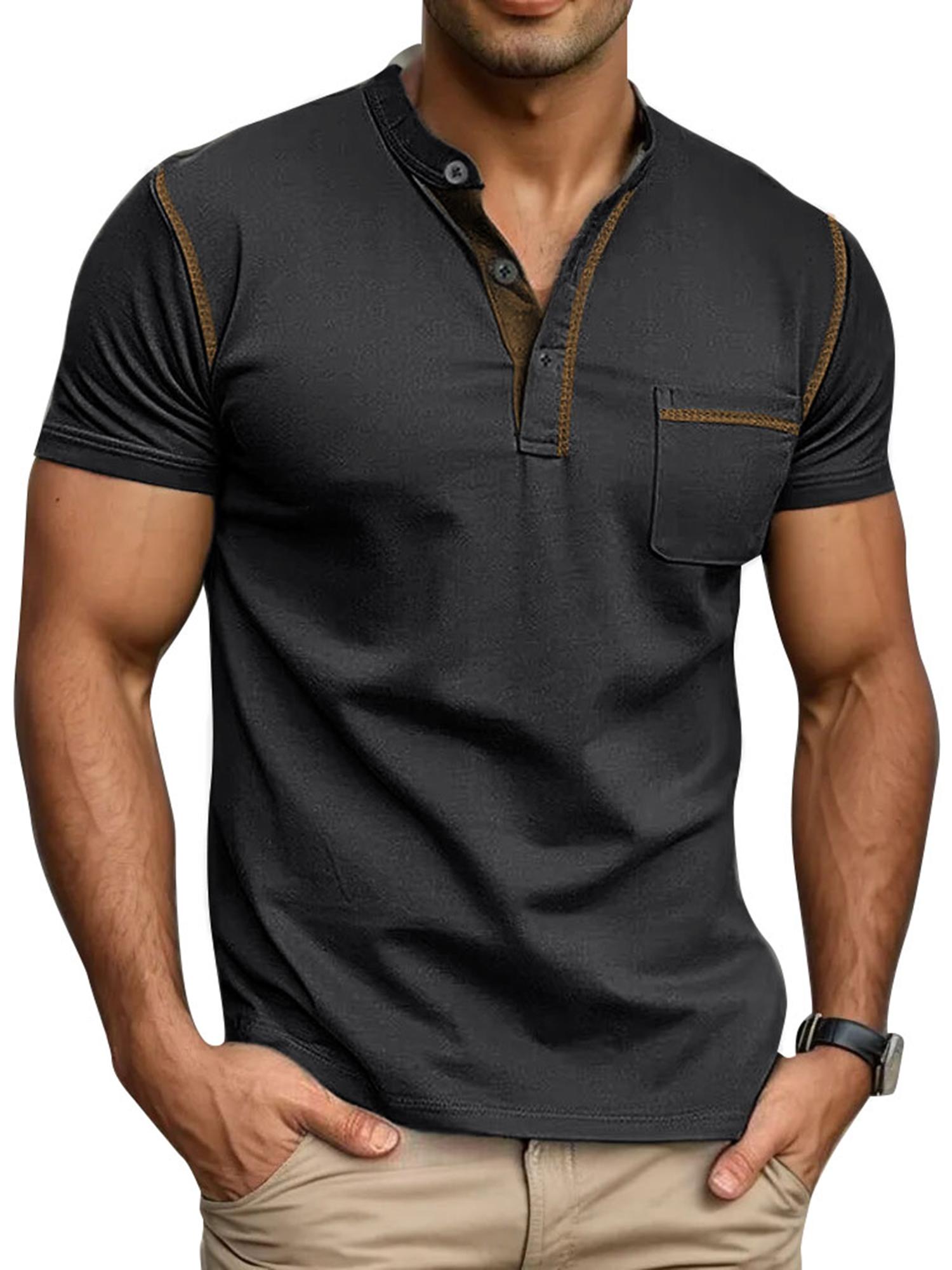 Short sleeves with a classic four-button placket and fashionable color-contrast raglan design.