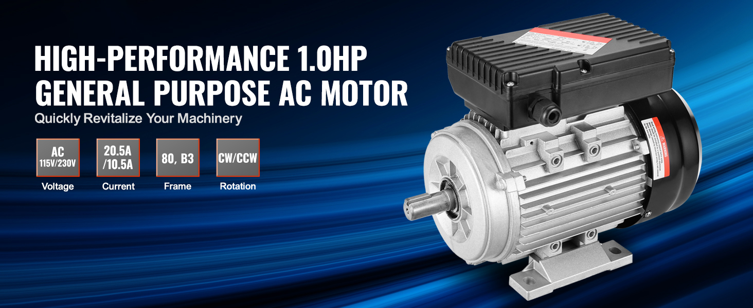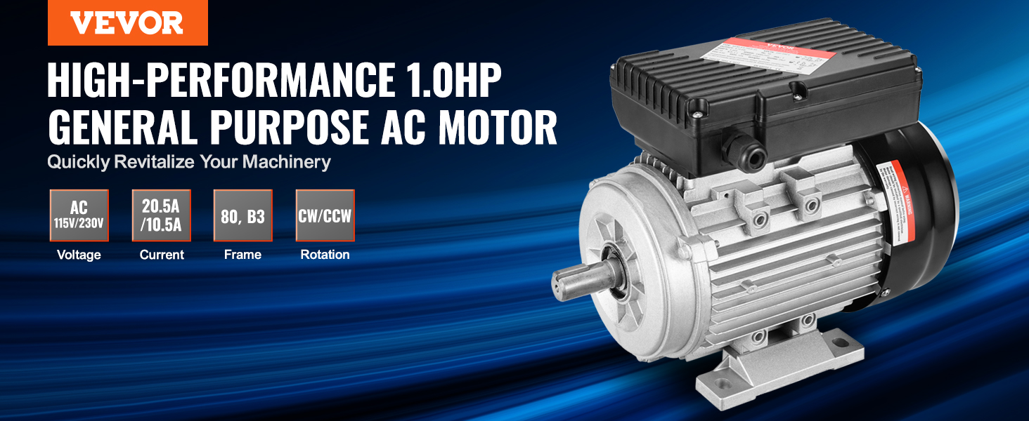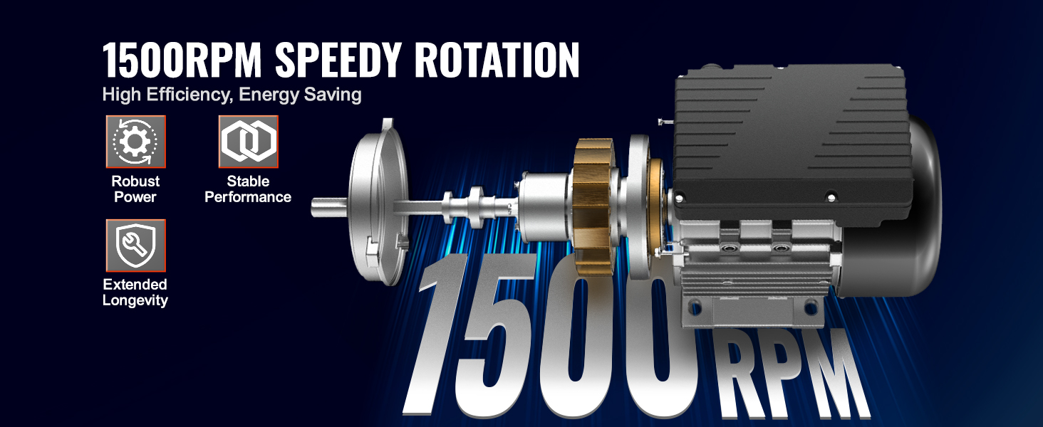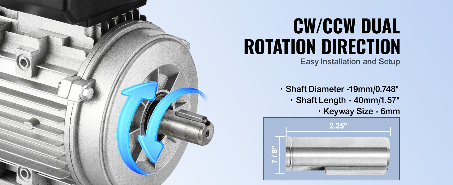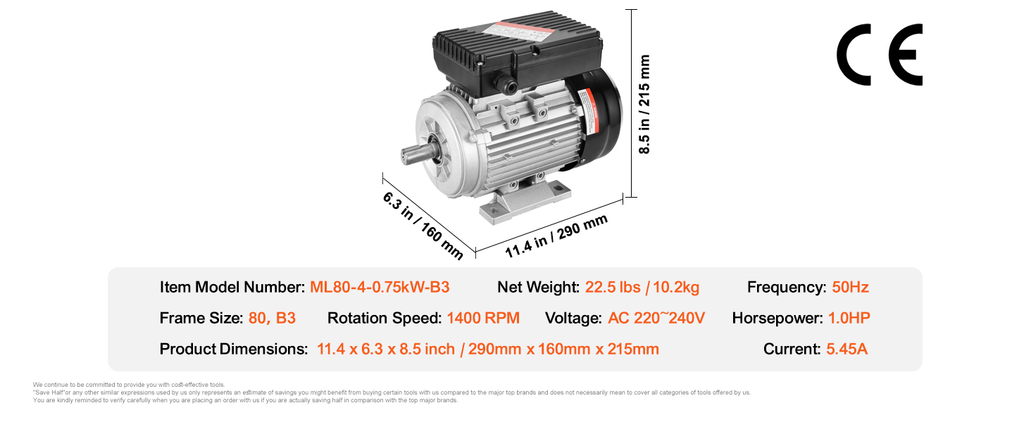 0,75 kW starker Elektromotor. Er arbeitet mit einer Wechselspannung von 220 bis 240 V und einem Strom von 5,45 A, bietet eine hohe Geschwindigkeit von 1400 U/min, 80, B3-Rahmen, 40 mm Schaftlänge, 19 mm Keilwelle und doppelte Drehrichtung im Uhrzeigersinn/gegen den Uhrzeigersinn.