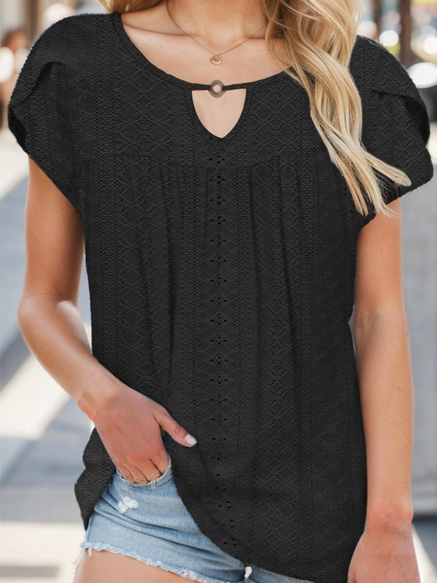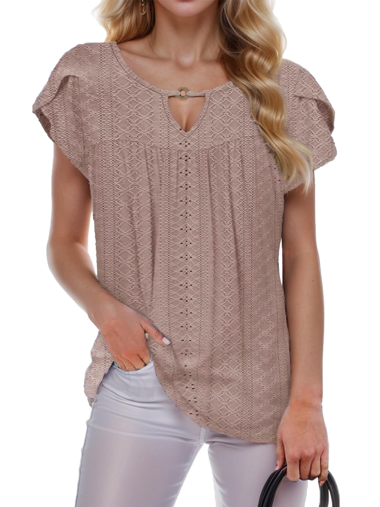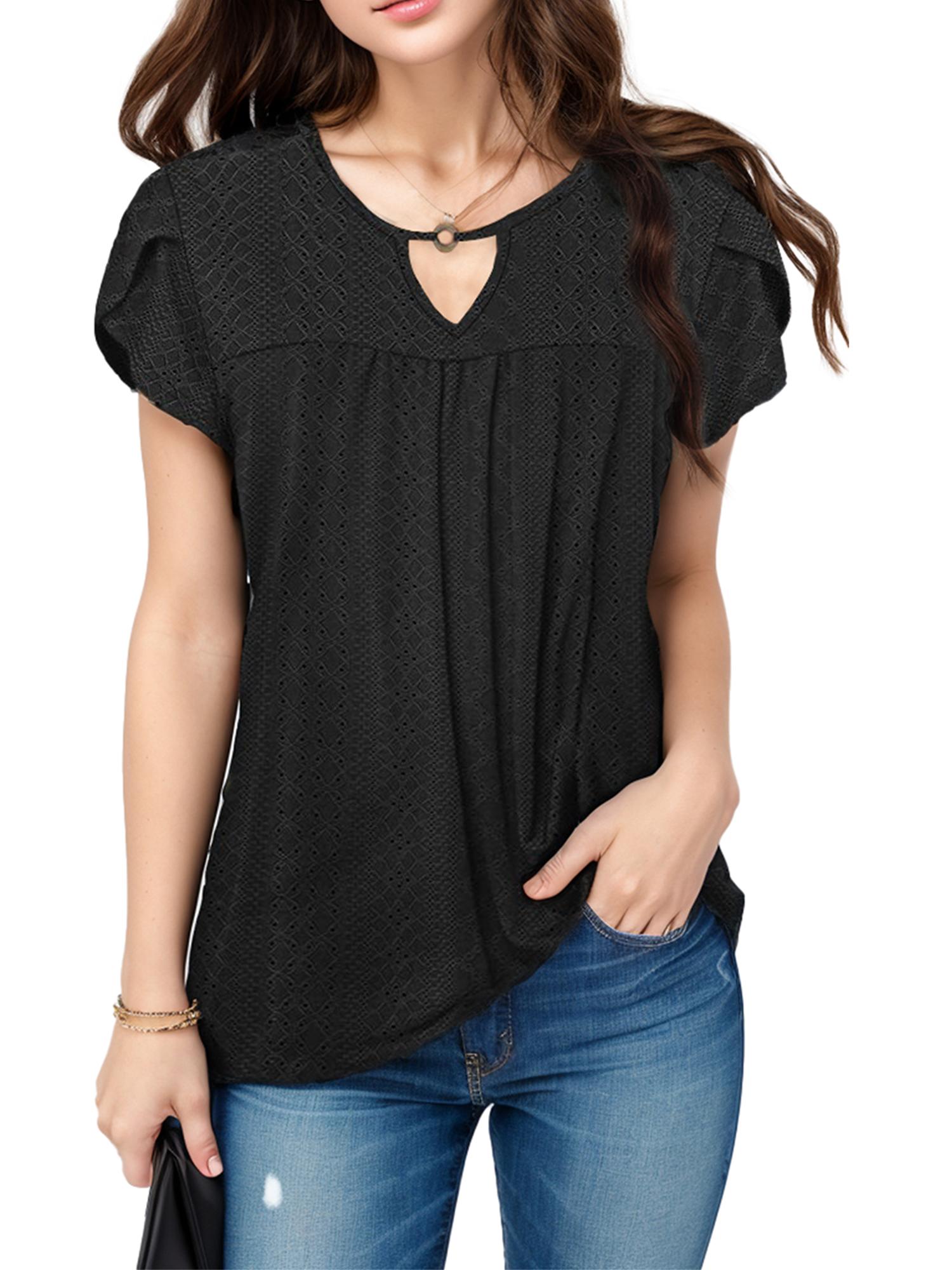 Women's Casual Short Petal Sleeve Shirts Pleated Front Key Hole Scoop Neck Floral Print Loose Fit Tops