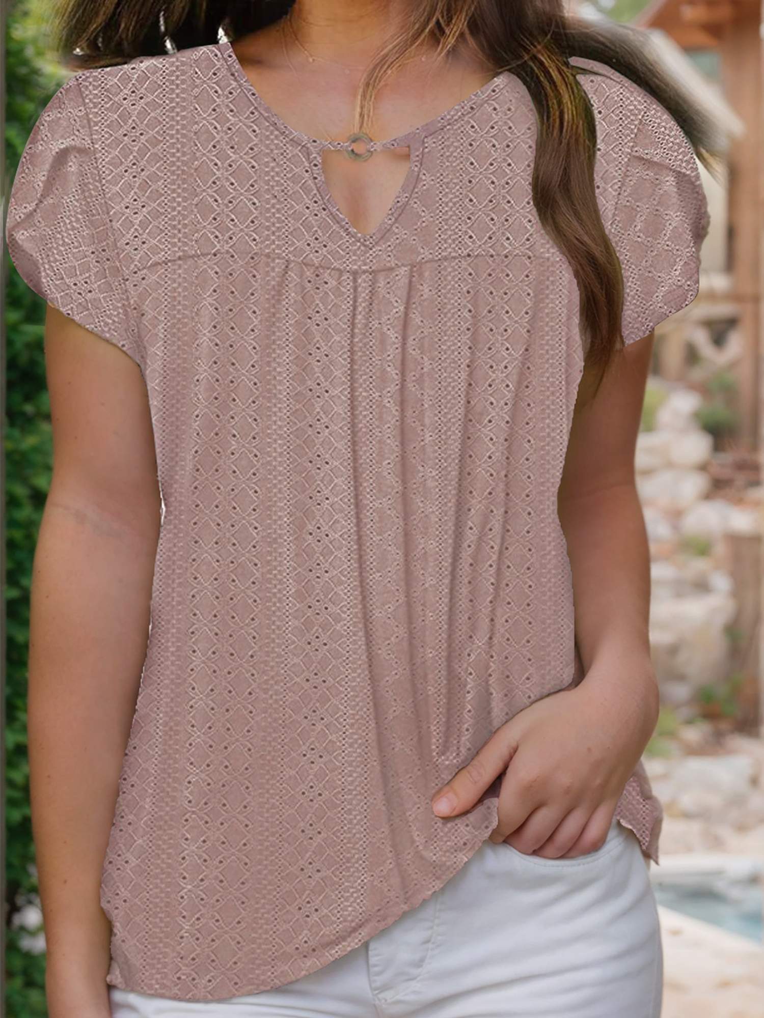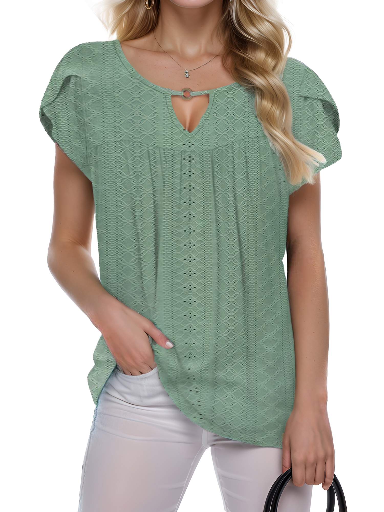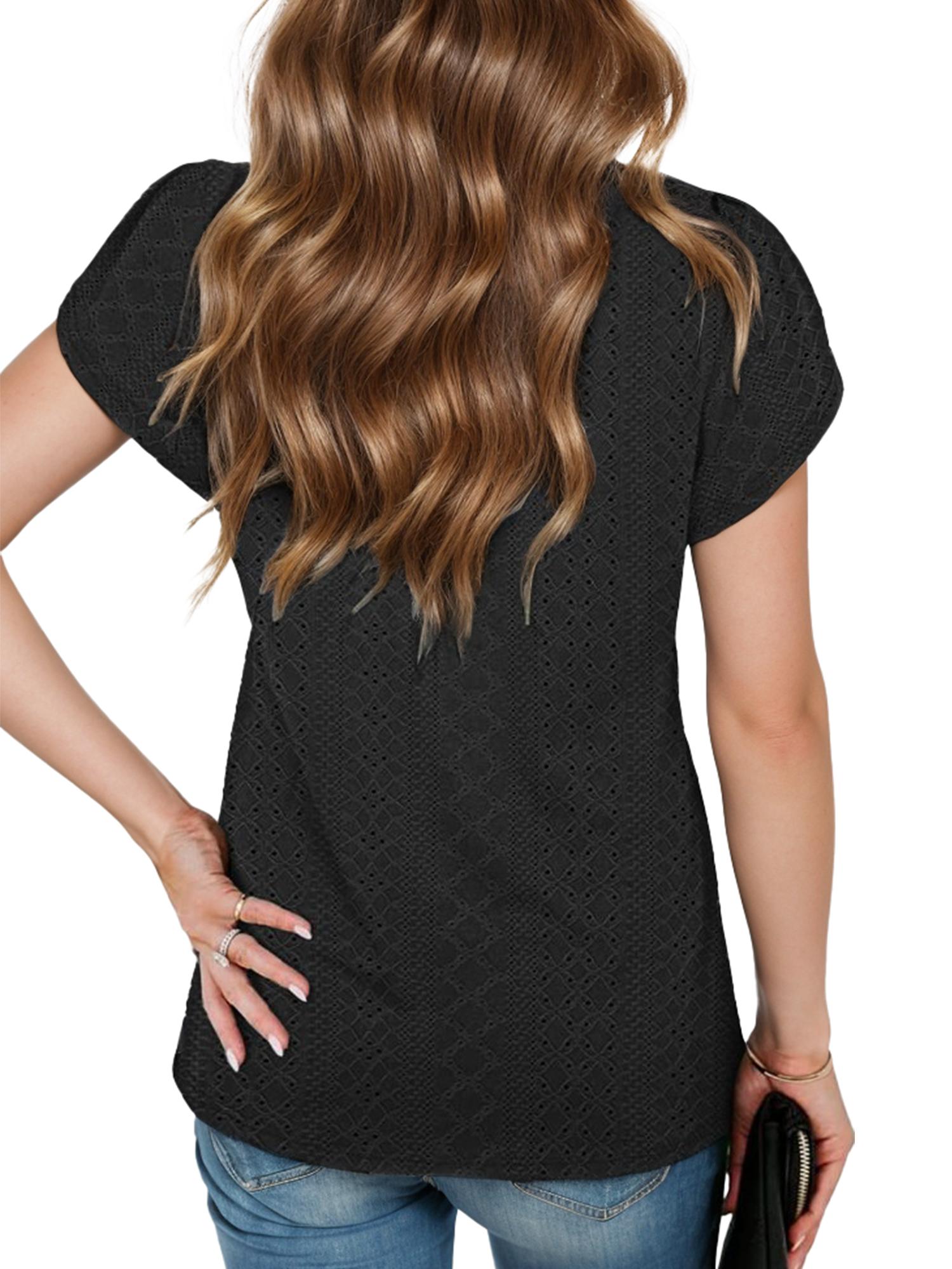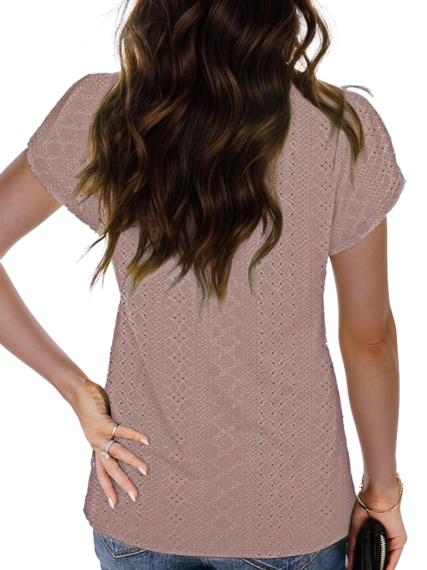 Women's Casual Short Petal Sleeve Shirts Pleated Front Key Hole Scoop Neck Floral Print Loose Fit Tops
